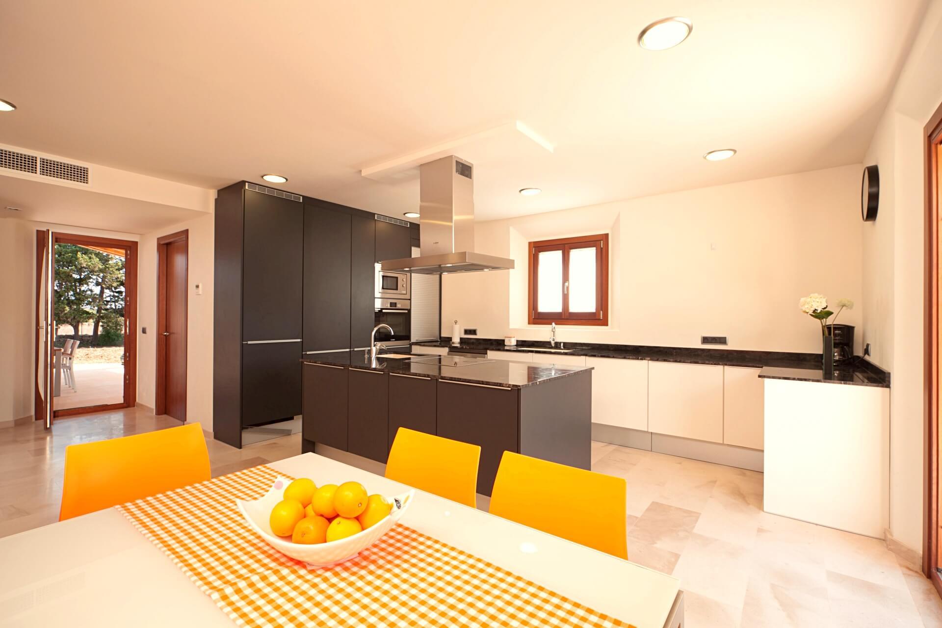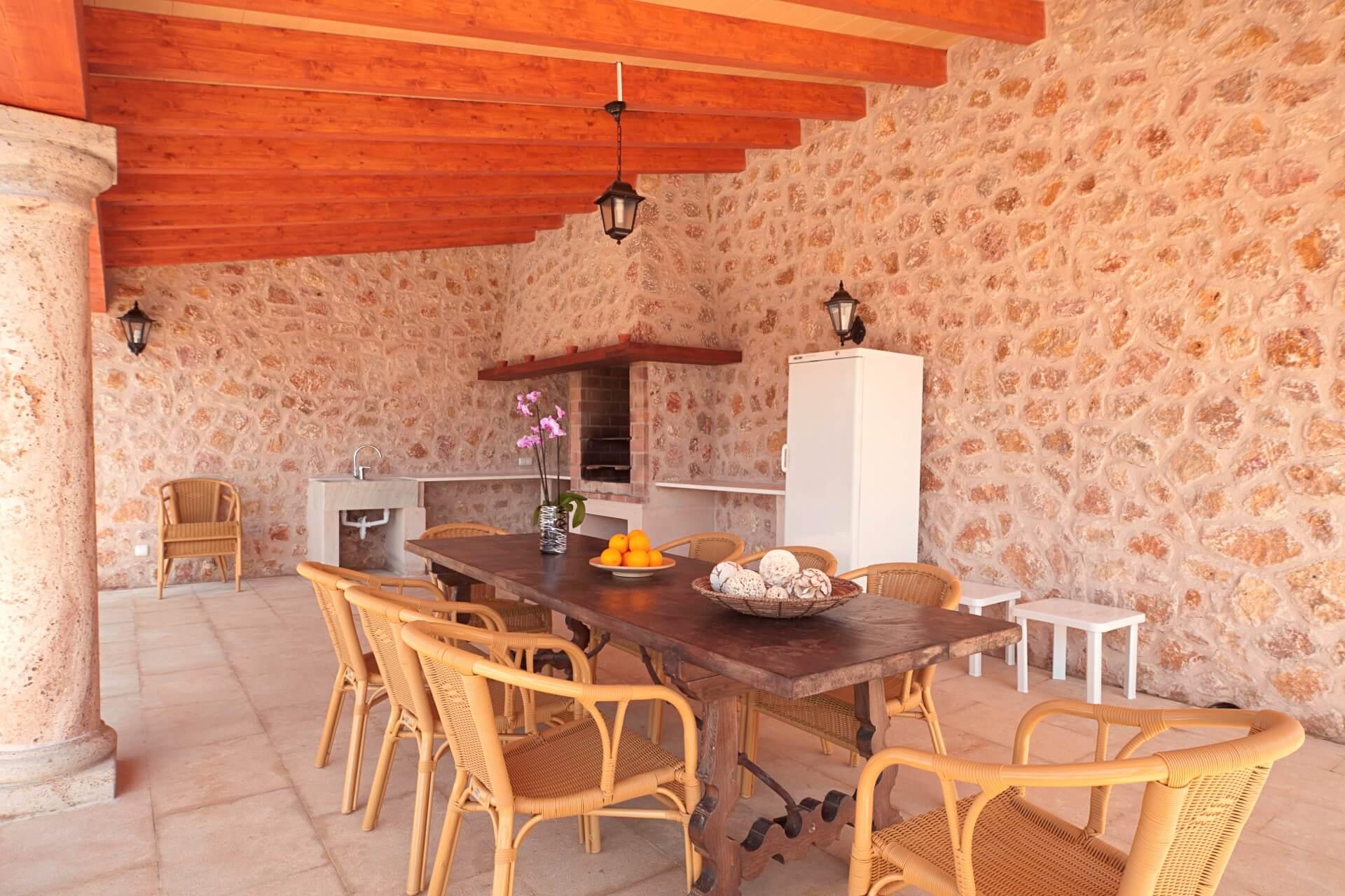 Can Fiol ist eine imposante Steinvilla mit modernem Interieur und herrlichen Außenbereichen. Der private Swimmingpool befindet sich in einem weitläufigen Garten mit Rasen, der hervorragende Möglichkeiten zum Leben im Freien bietet (einschließlich eines fantastischen Küchenbereichs am Pool). Tolle Lage in der Nähe von Puerto Pollensa!Drei Stufen führen auf die Eingangsterrasse (es gibt auch eine Rampe). Doppelte Holztüren führen in einen großen Flur. Es ist ein Marmor-Finish im Erdgeschoss und Treppenhaus. Die Küche verfügt über einen begehbaren Hauswirtschaftsraum und eine große Wohnküche.Die Küche hat Türen zu zwei Seiten des Zimmers, die zu den umliegenden Terrassen führen. Der Frühstücksbereich hat einen Tisch aus Aluminium und Glas mit bunten orangefarbenen Stühlen. Vom Flur führt ein großes Esszimmer mit zwei Glastüren auf die hintere Terrasse. Aus der Lounge durch Glasschiebetüren und zurück in den Flur gehen gibt es eine Gästetoilette und ein Schlafzimmer mit zwei Türen, die in den Garten führen.Aus diesem Schlafzimmer ist ein eigenes Bad im Duschraum. Zurück in den Flur führt eine Treppe den ersten Stock hinauf. Auf der linken Seite befindet sich ein weiteres Zweibettzimmer mit einem eigenen Duschbad. Doppeltüren führen auf eine Gemeinschaftsterrasse.Das Hauptschlafzimmer hat ein 2m Bett. Doppelglas-Schiebetüren führen auf die Gemeinschaftsterrasse. Ein komplettes Badezimmer mit separater begehbarer Dusche vervollständigt dieses Master-Zimmer. Von der Terrasse im Obergeschoss haben Sie einen herrlichen Blick auf die Berge und die umliegende Landschaft.Die hintere Terrassierung folgt der gesamten Länge der Villa und verfügt über Rattansofa, Stühle und gelegentliche Tische zum Entspannen. Von dieser Terrasse aus führt ein Weg zur Poolside-Dusche und zum zweckmäßig gebauten überdachten BBQ. Die Gärten sind zu Gras und Sträuchern mit dem Pool umgeben von kleinen Bäumen. Die Beleuchtung ist um die Gärten und den Poolbereich gelegt.