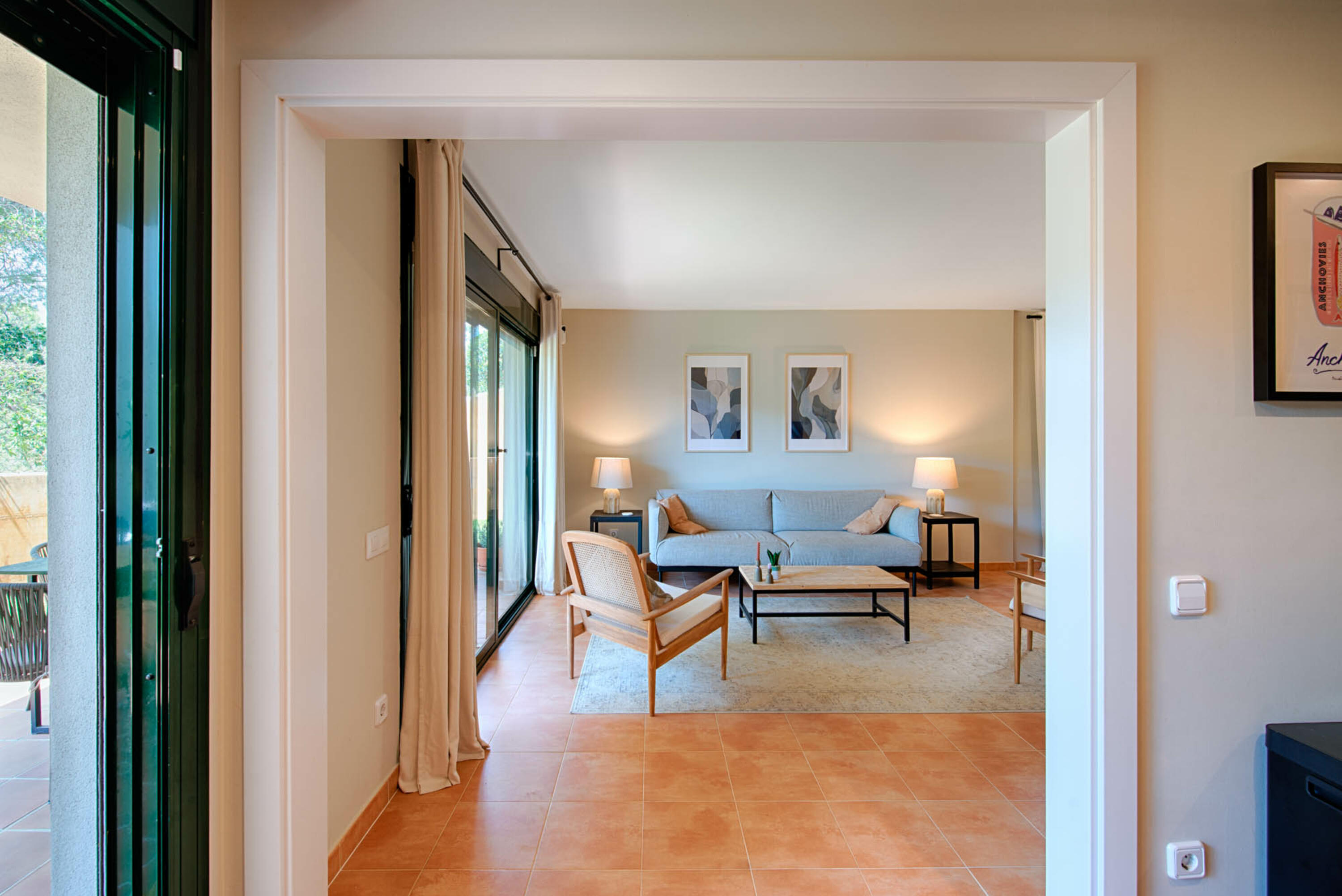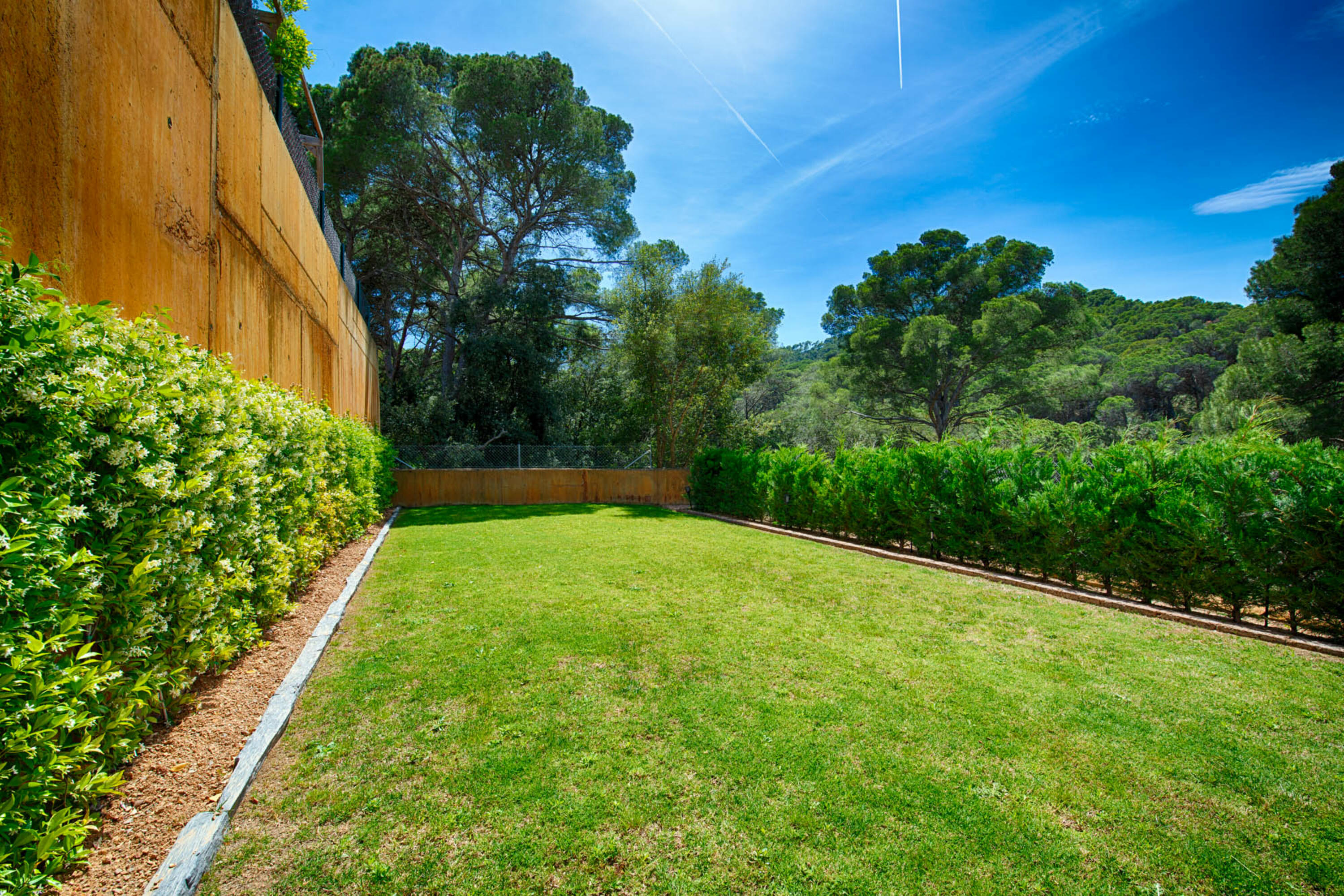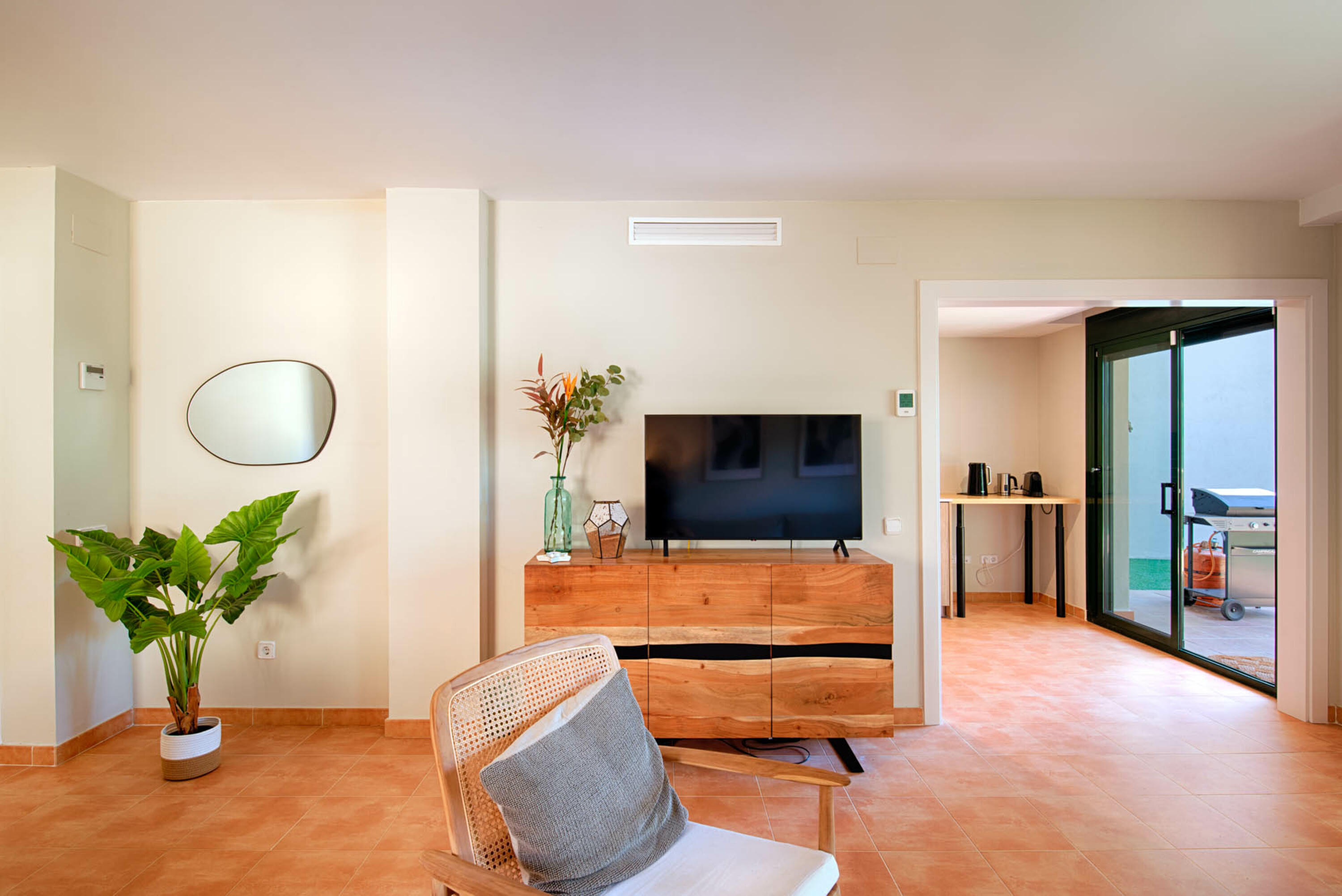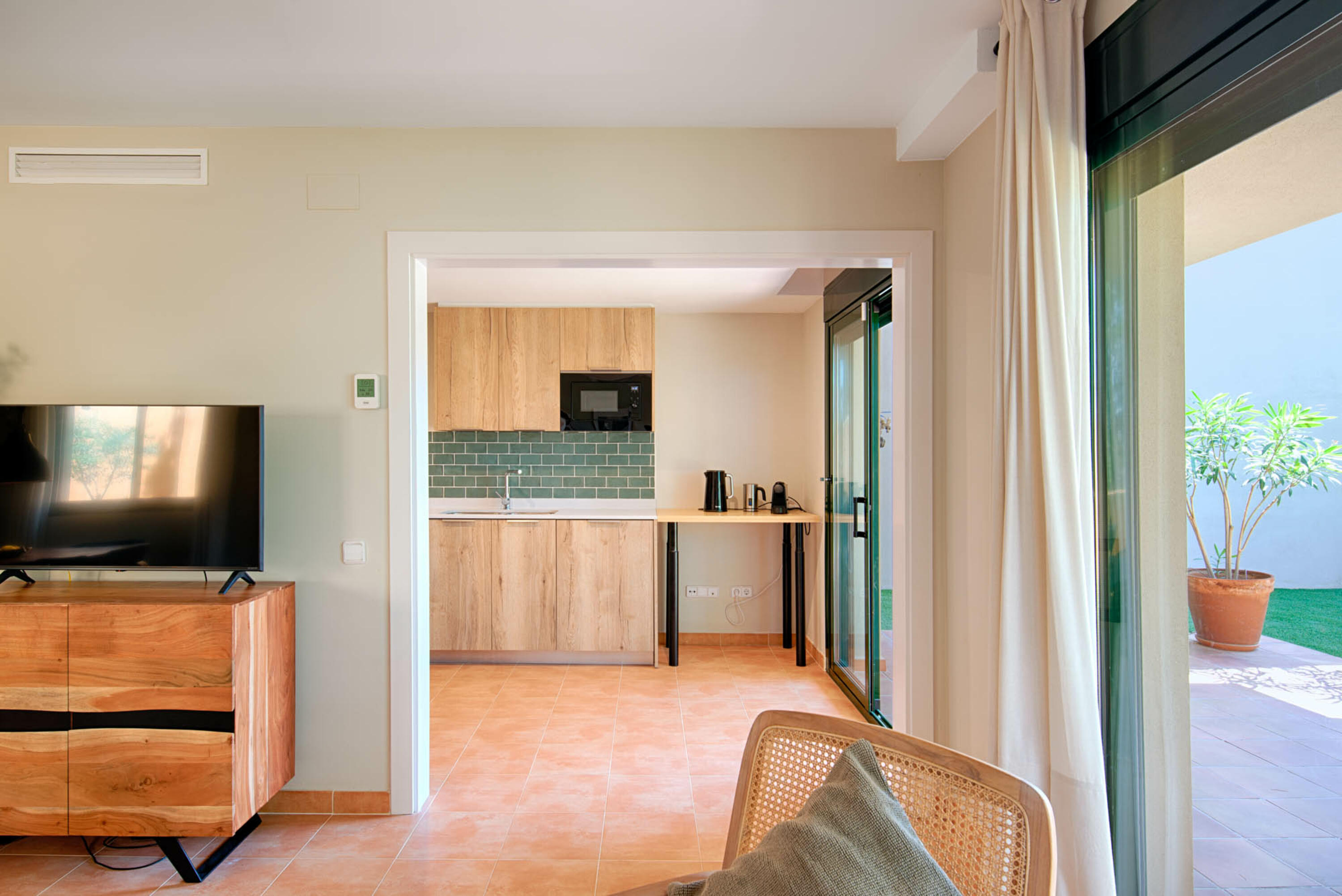 En la parte trasera se encuentran el acogedor y moderno salón y la cocina. El salón dispone de TV e internet. Junto al salón hay un jardín de césped y una amplia terraza desde donde se tiene una vista del bosque. En el lateral del apartamento hay otro trozo de césped con una segunda terraza. De esta forma siempre podrás elegir entre sol y sombra.