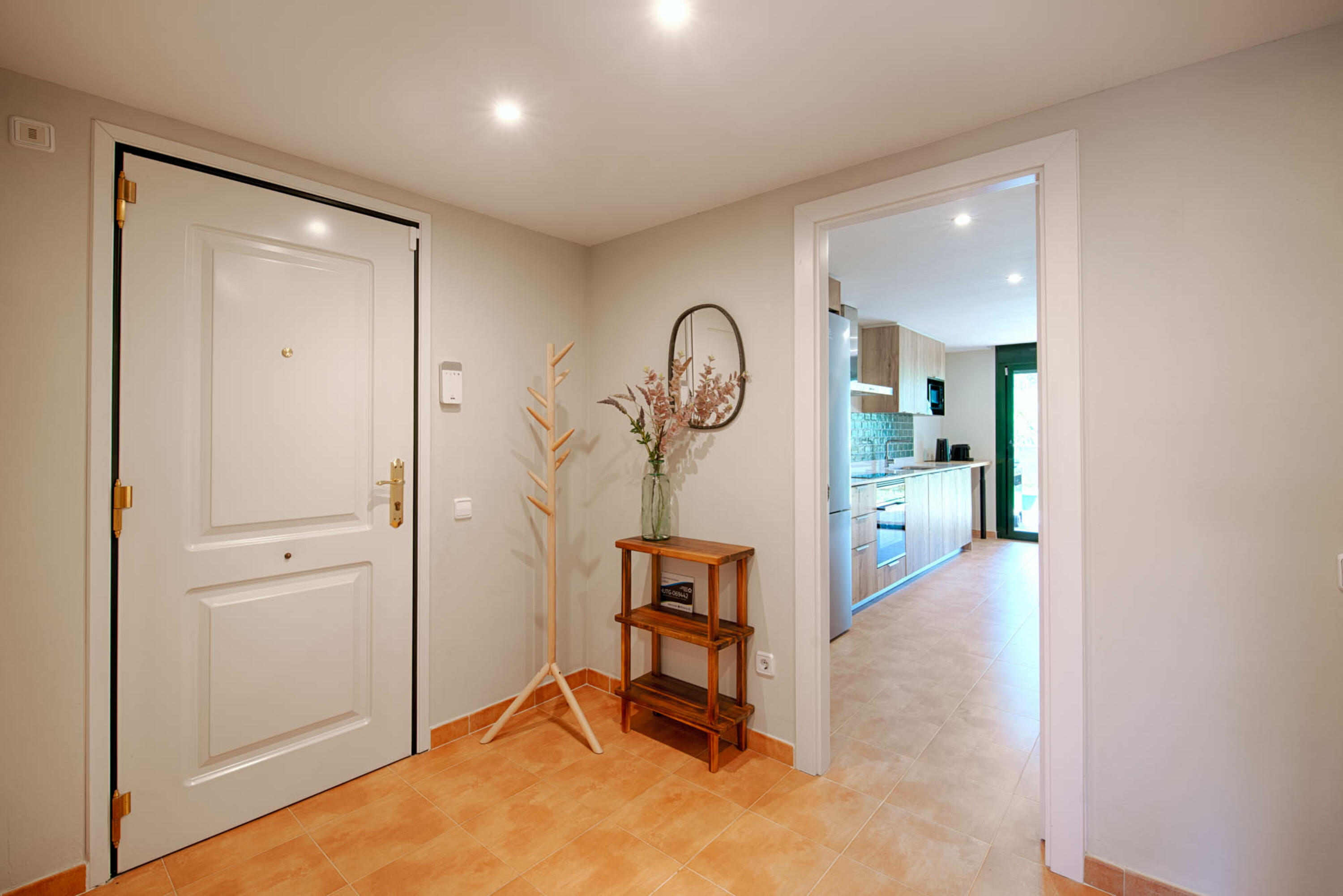 En la parte delantera hay un espacio de estacionamiento privado y una puerta que conduce al apartamento. Un corto tramo de escaleras conduce a la puerta principal que conduce a un espacioso pasillo en el apartamento.