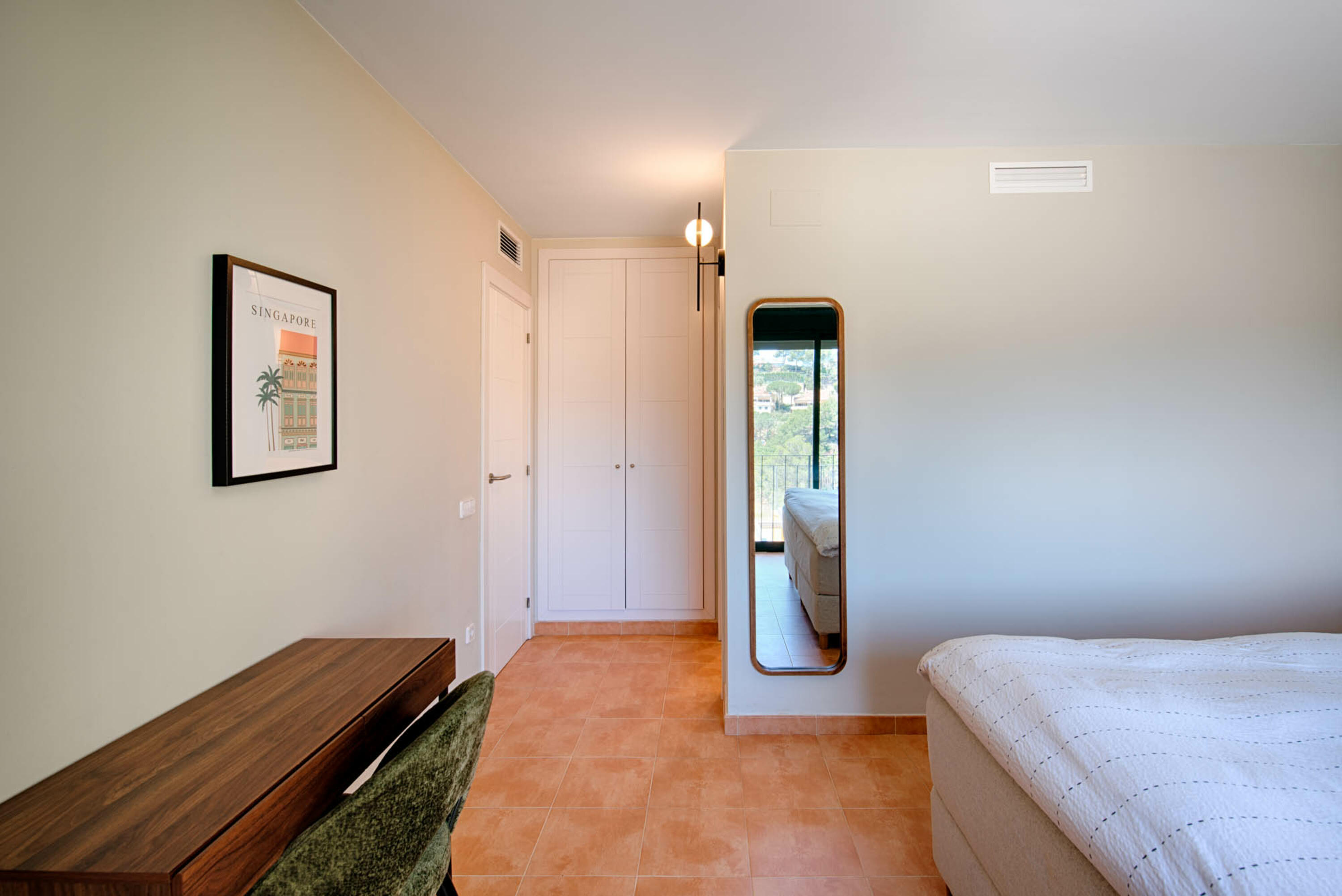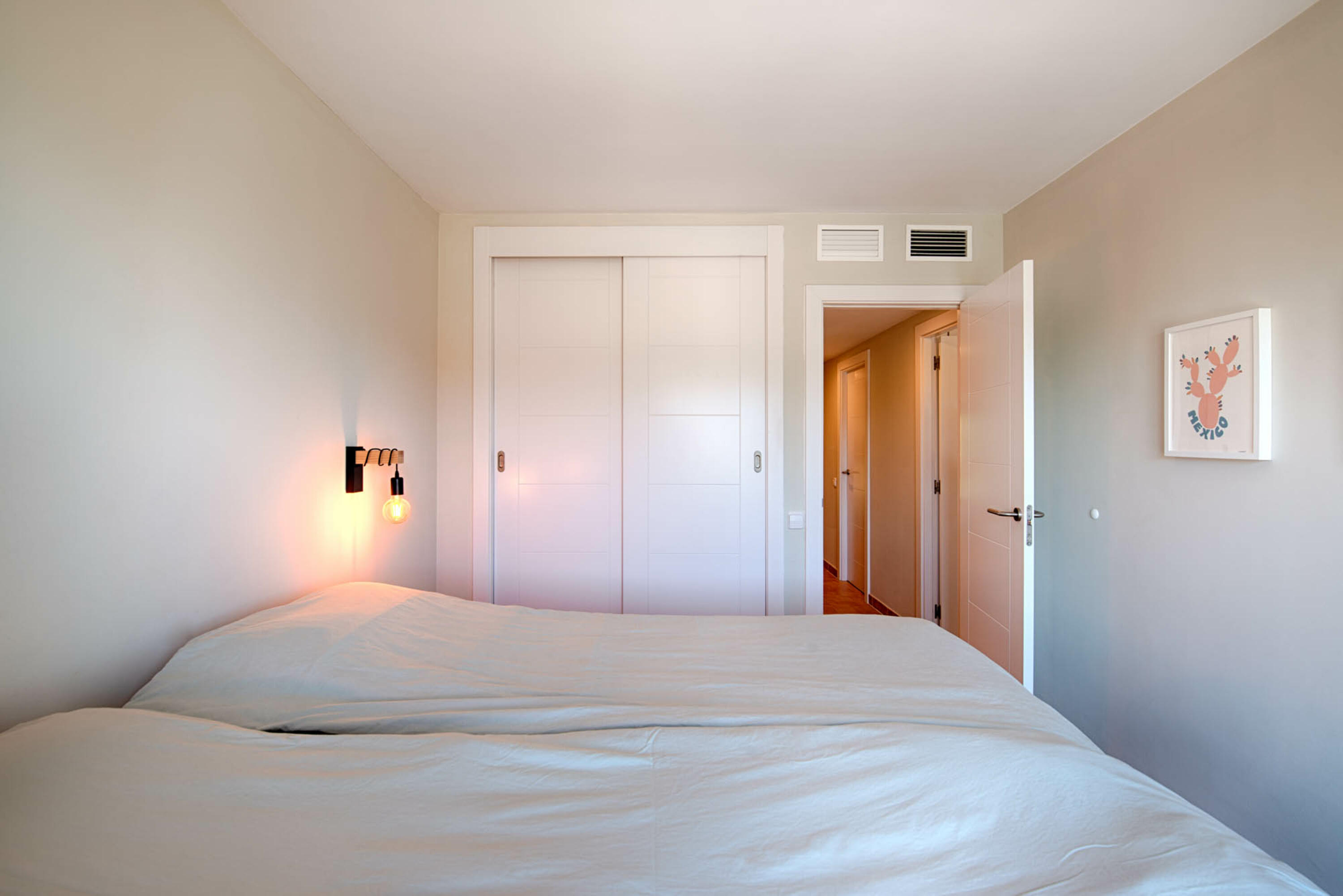 Los tres dormitorios están al otro lado de la casa. El dormitorio principal tiene una cama doble grande y un balcón francés que también tiene vistas al mar. Este dormitorio tiene un baño privado con lavabo doble, ducha y WC.
