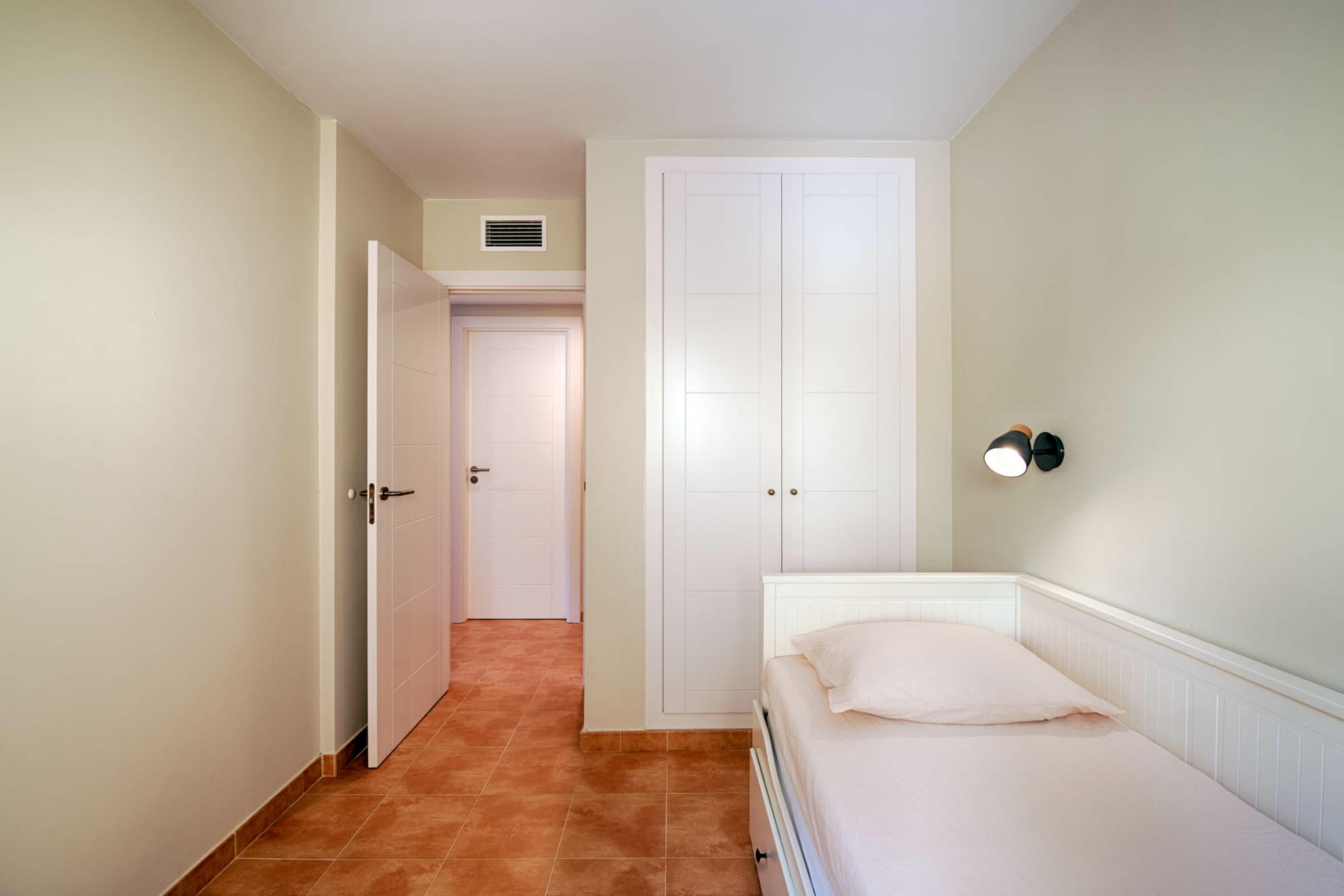 El segundo dormitorio también tiene una cama doble, pero también se puede dividir. El tercer dormitorio tiene una cama individual con cama nido. Hay un total de 6 plazas para dormir. El segundo baño tiene bañera con ducha, inodoro y lavabo.