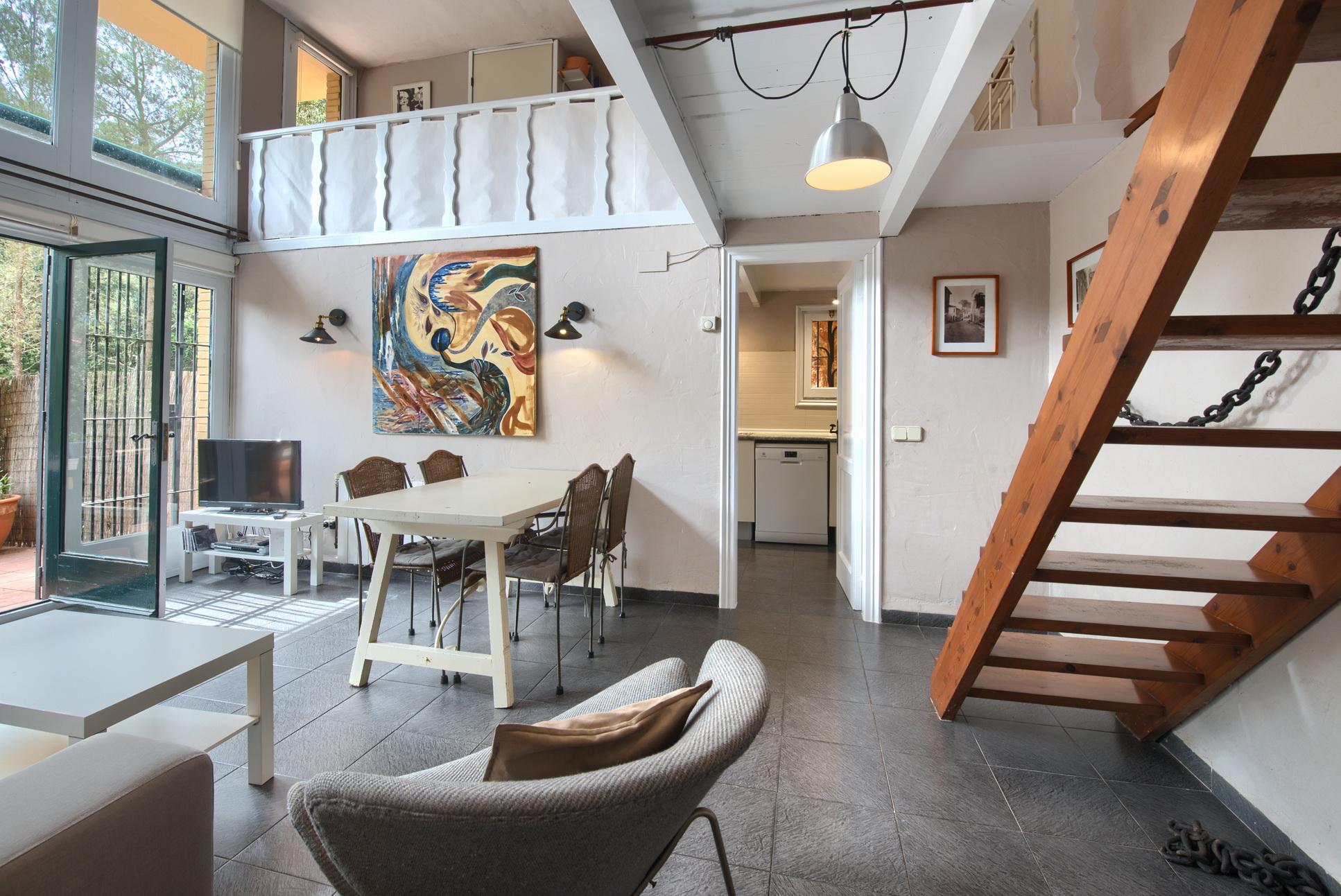 En el salón encontrará una mesa de comedor, un sofá y sillones. También hay una televisión en color y un reproductor de DVD. Alrededor de la sala de estar se encuentra un dormitorio, equipado con una cama de matrimonio (140 x 200 cm) y mucho espacio en el armario. El cuarto de baño tiene un lavabo, una ducha y un inodoro. Al otro lado del salón se encuentra la cocina y arriba, por supuesto, el loft.