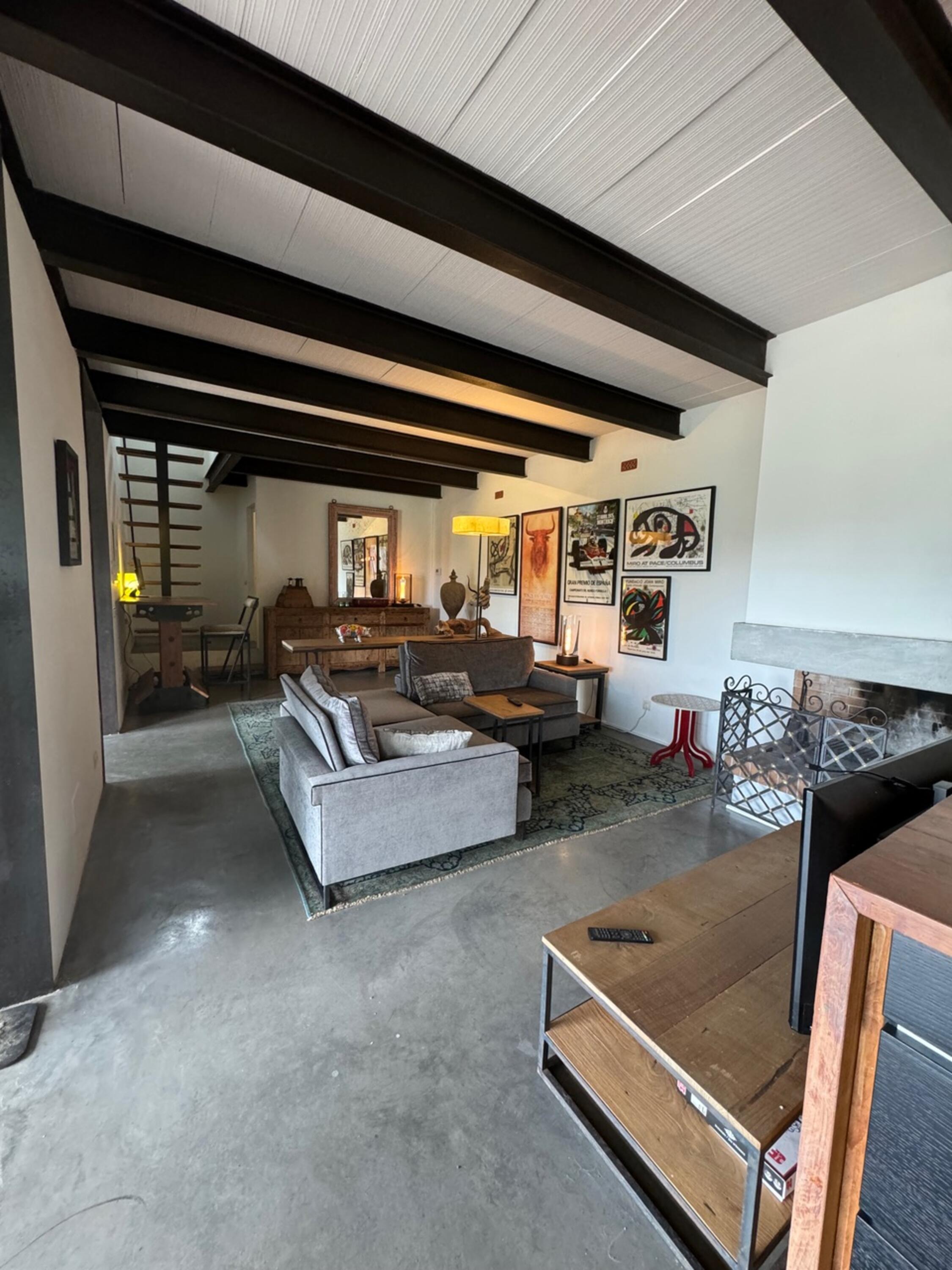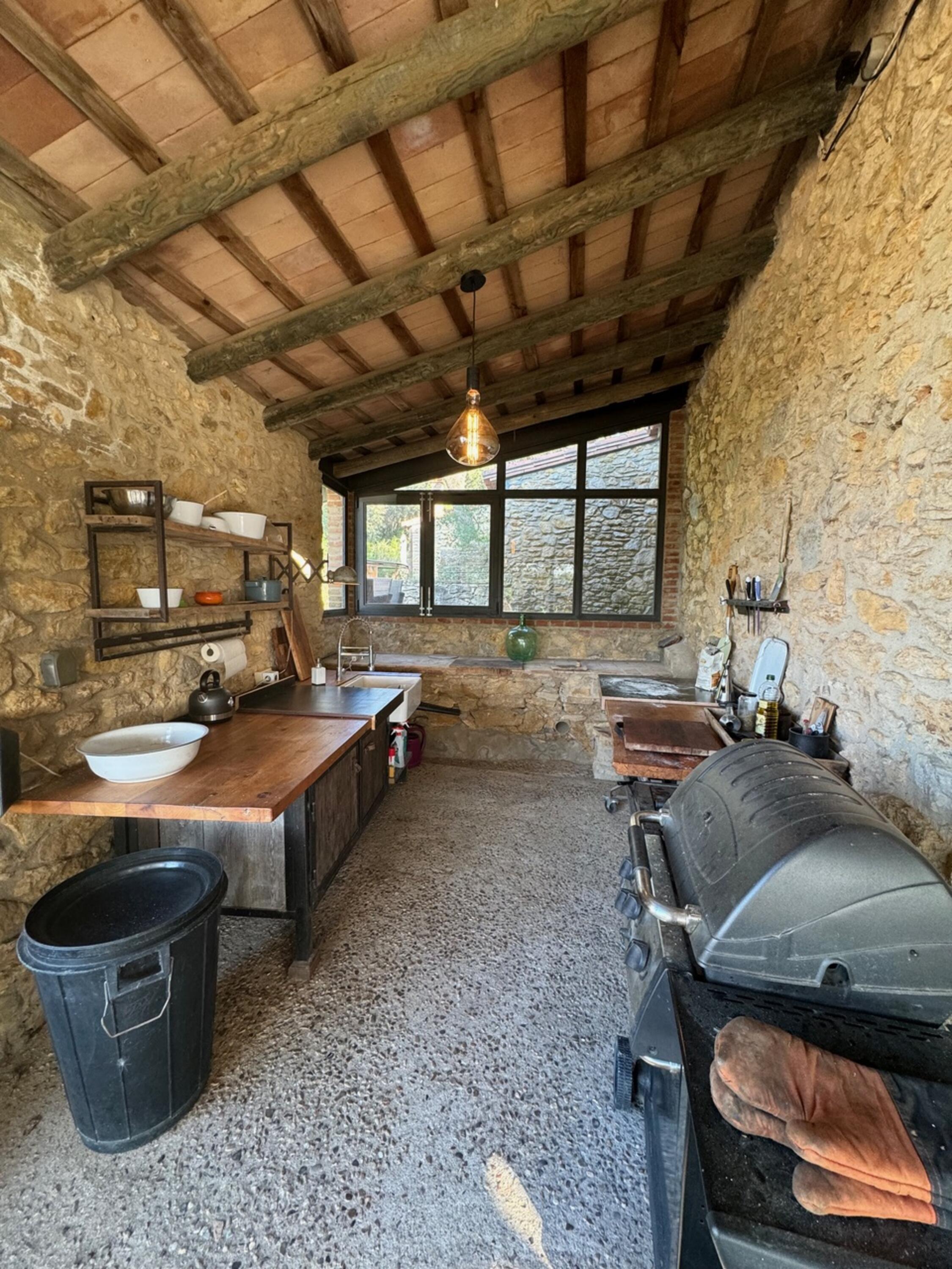 En la planta baja tiene una amplia cocina con una gran isla para cocinar y una despensa en el antiguo horno de cal. También en este piso hay una sala de estar comedor salón y un baño con ducha y WC.