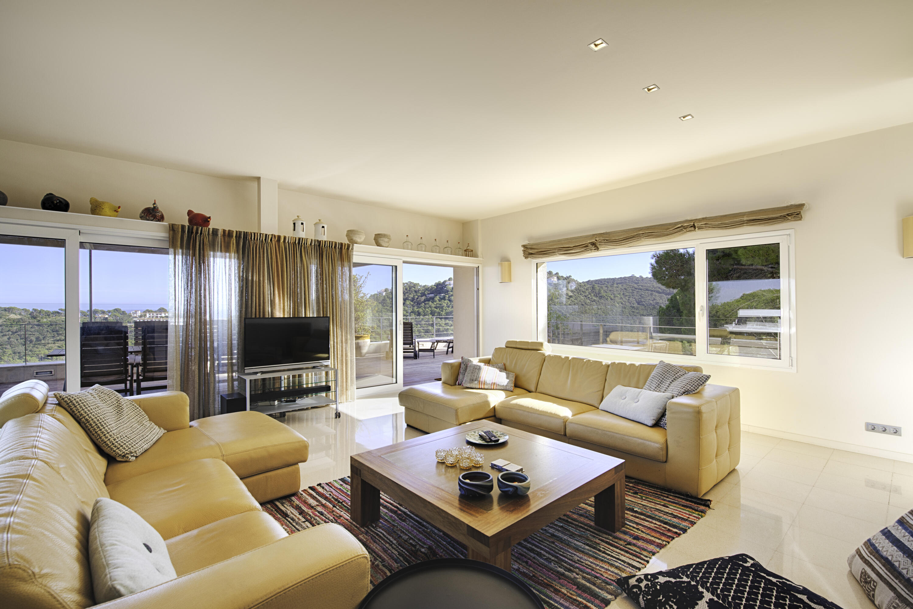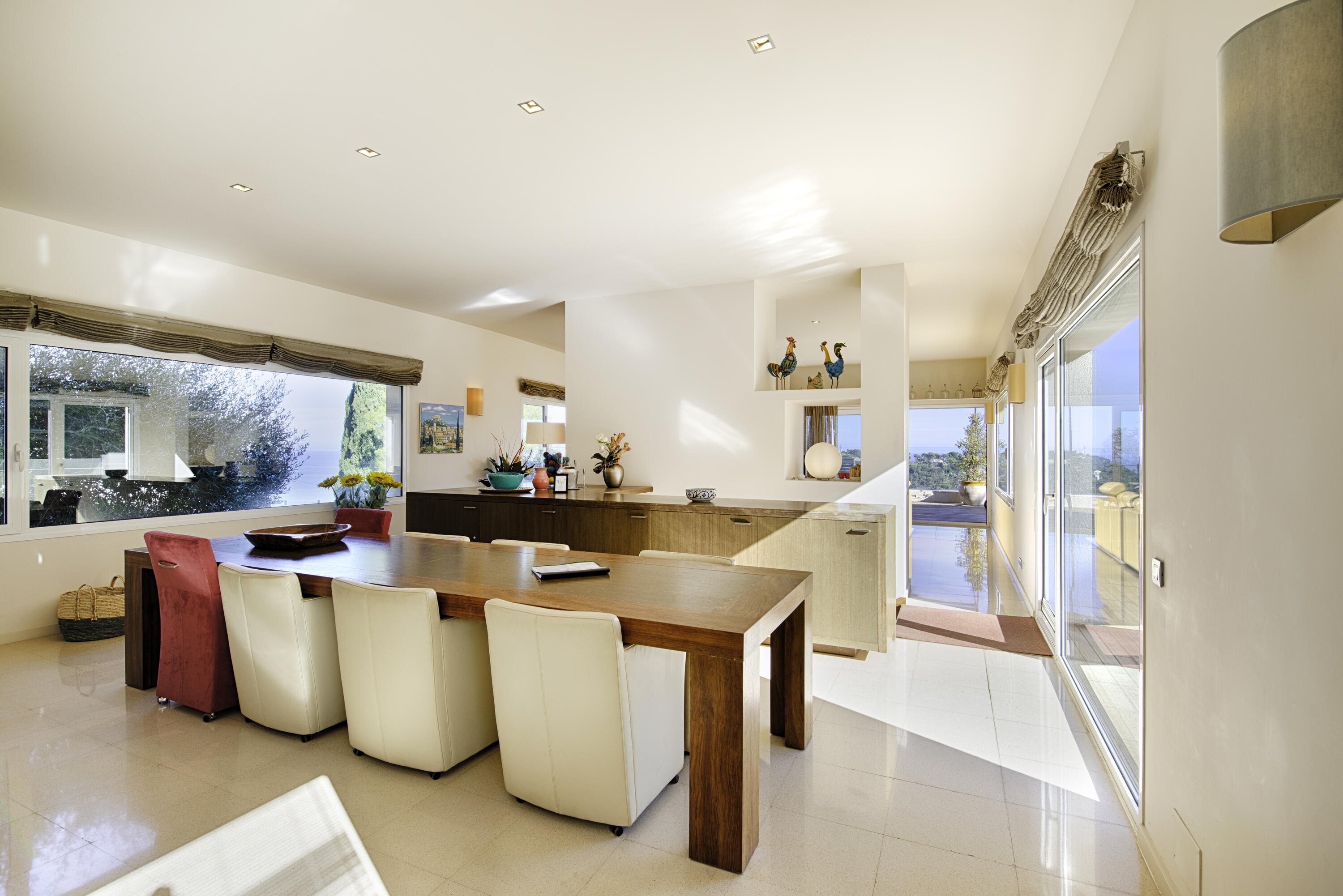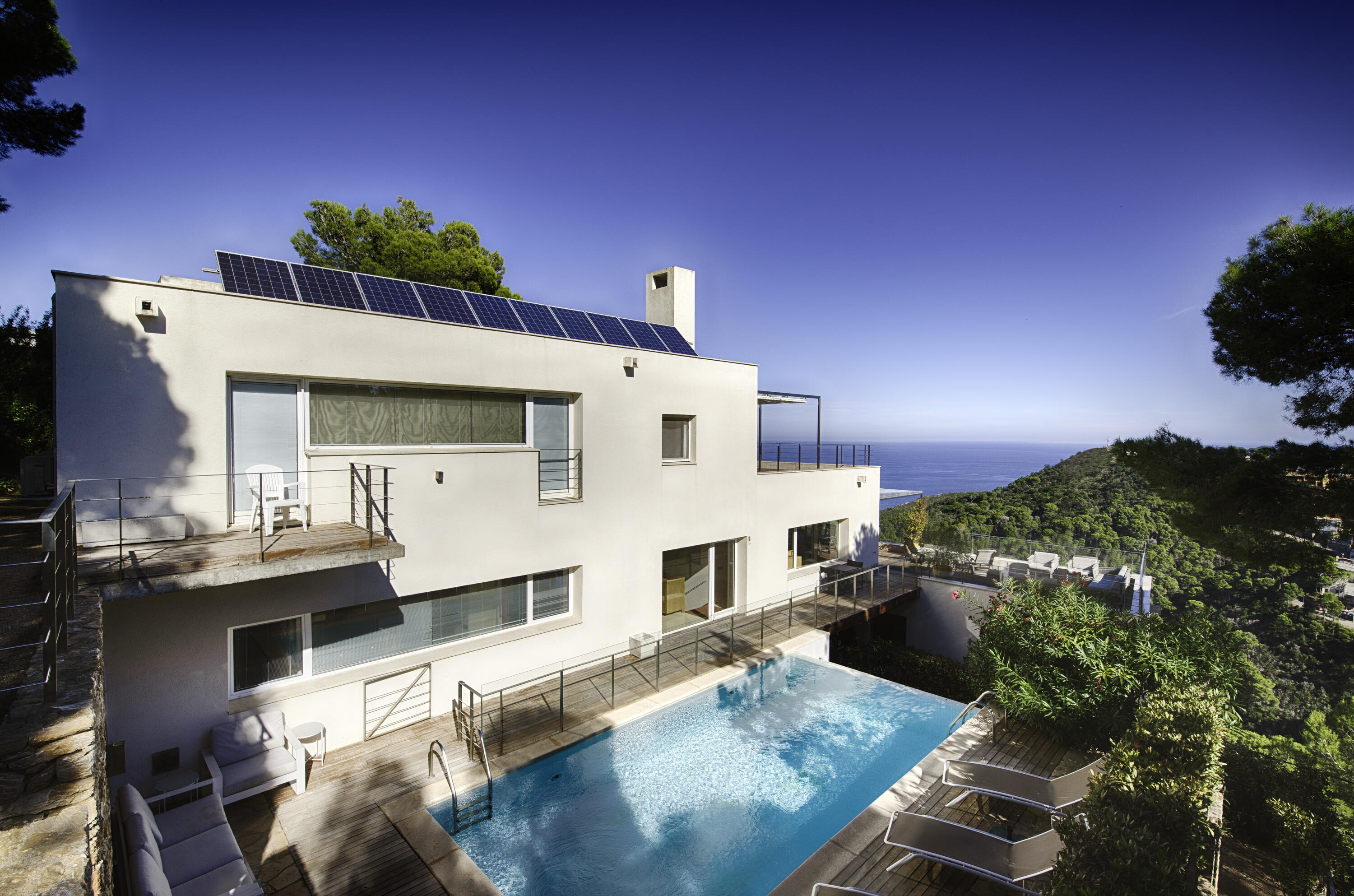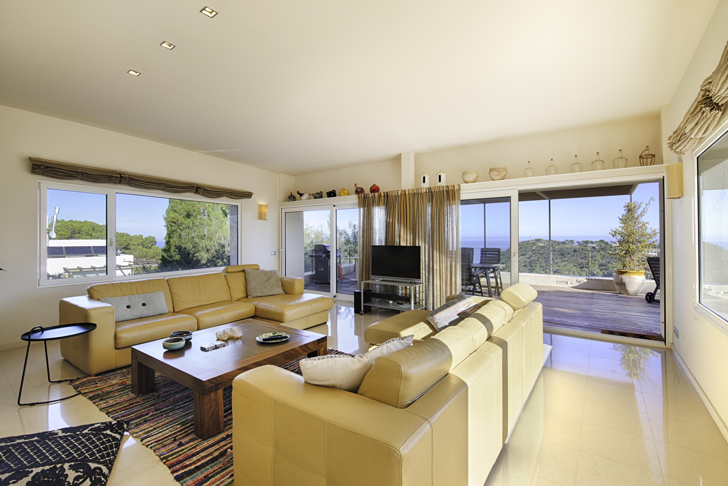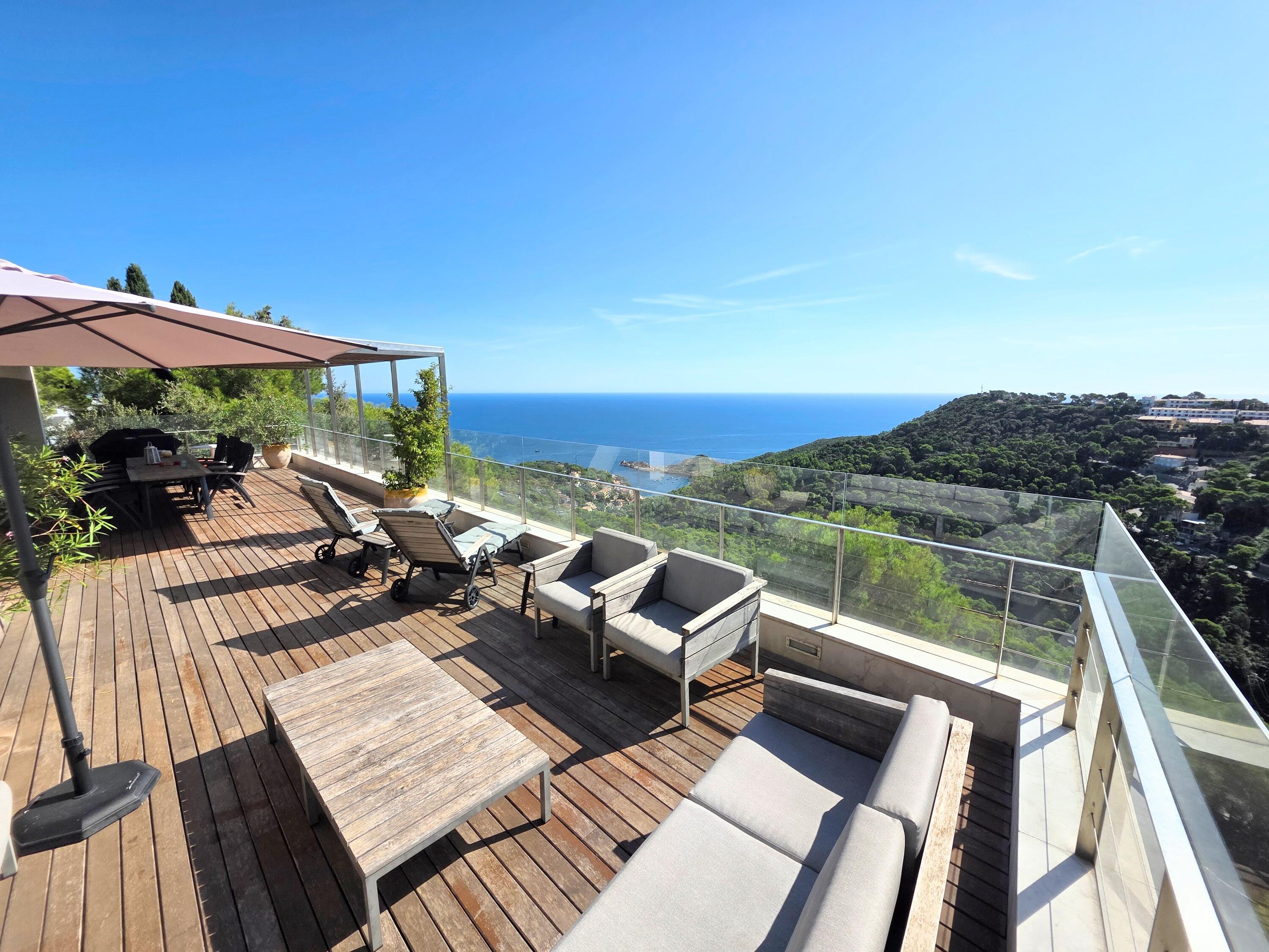 Le salon spacieux est équipé d'une smart-TV et offre une vue magnifique sur la mer et la piscine . À côté de cette pièce, vous accédez à une très grande terrasse partiellement couverte, équipée d'un salon de jardin luxueux, d'une grande table à manger et d'un barbecue à gaz. L'endroit idéal pour prendre le petit-déjeuner et le dîner, mais aussi pour profiter de la vue phénoménale sur la Méditerranée.