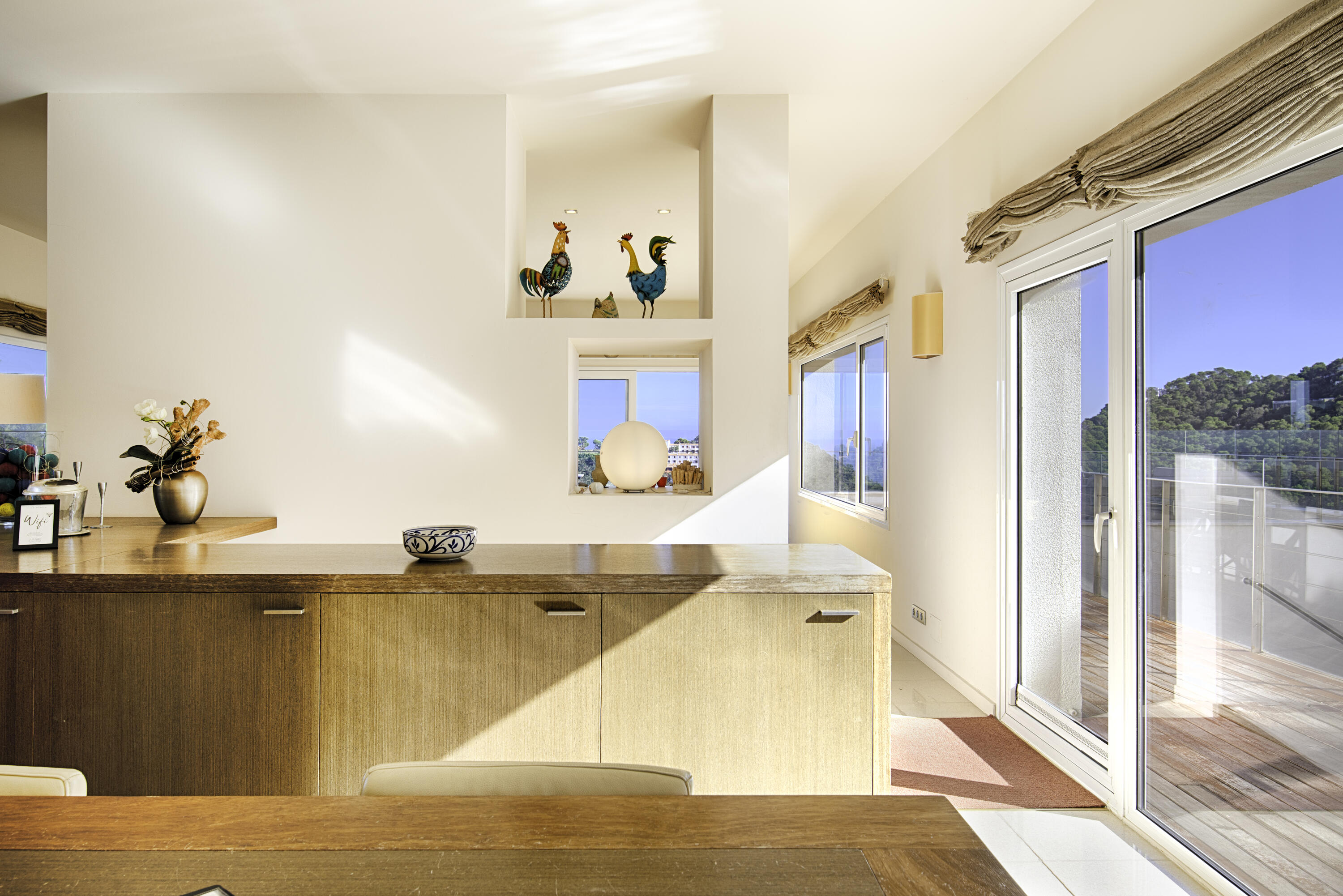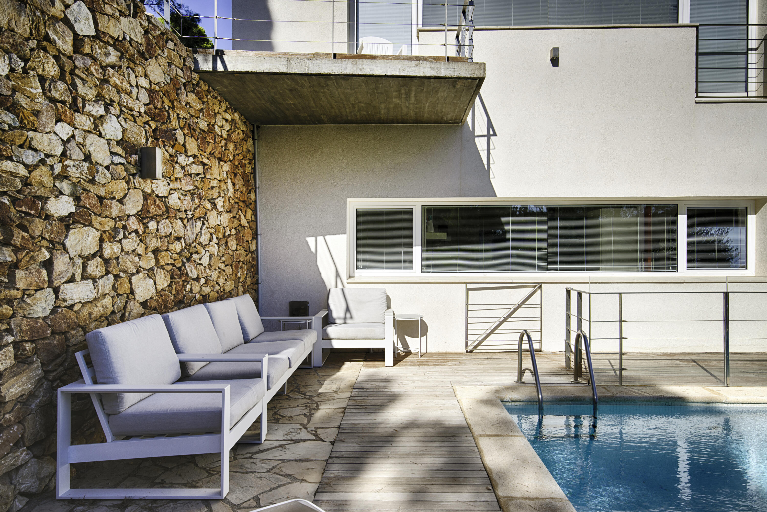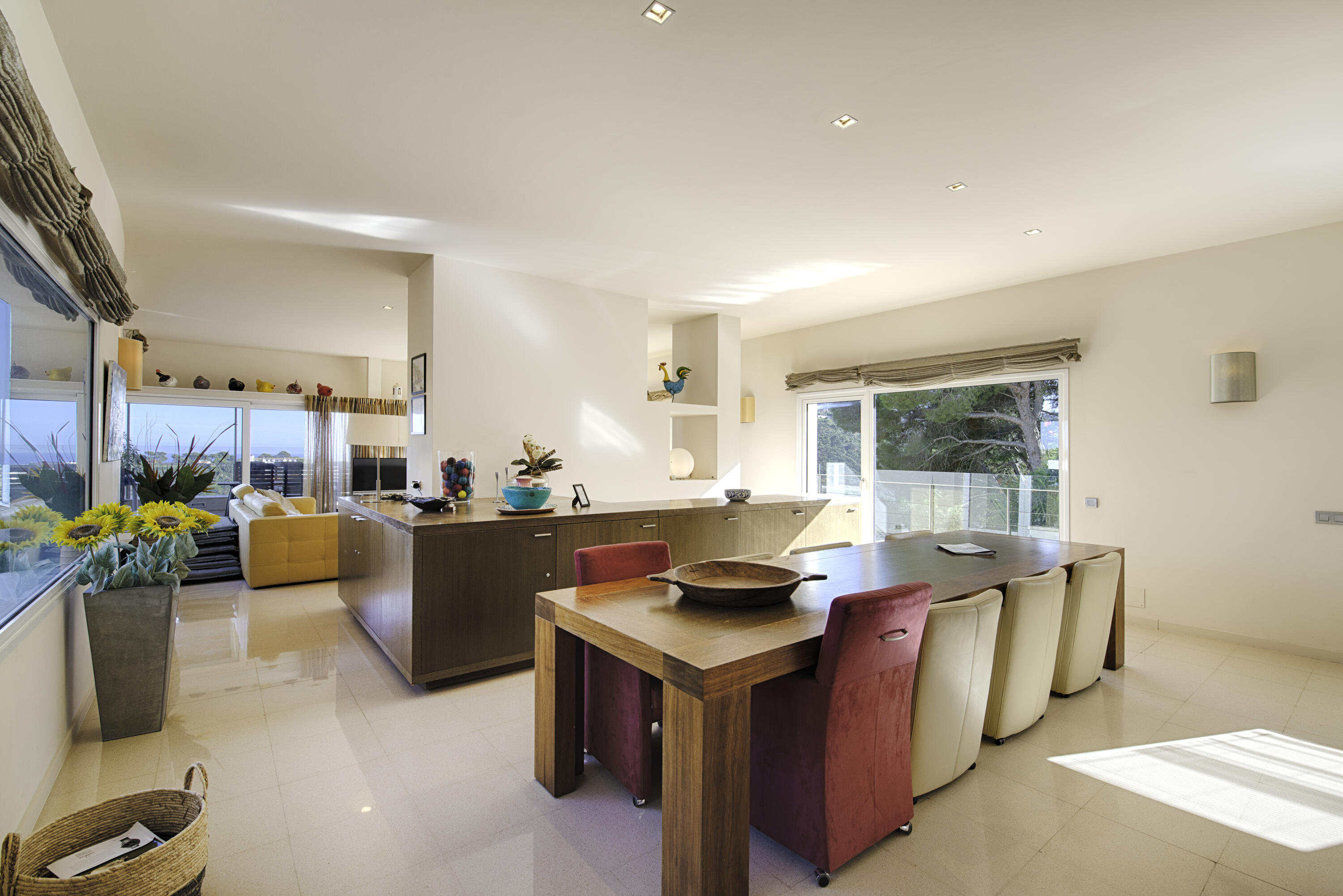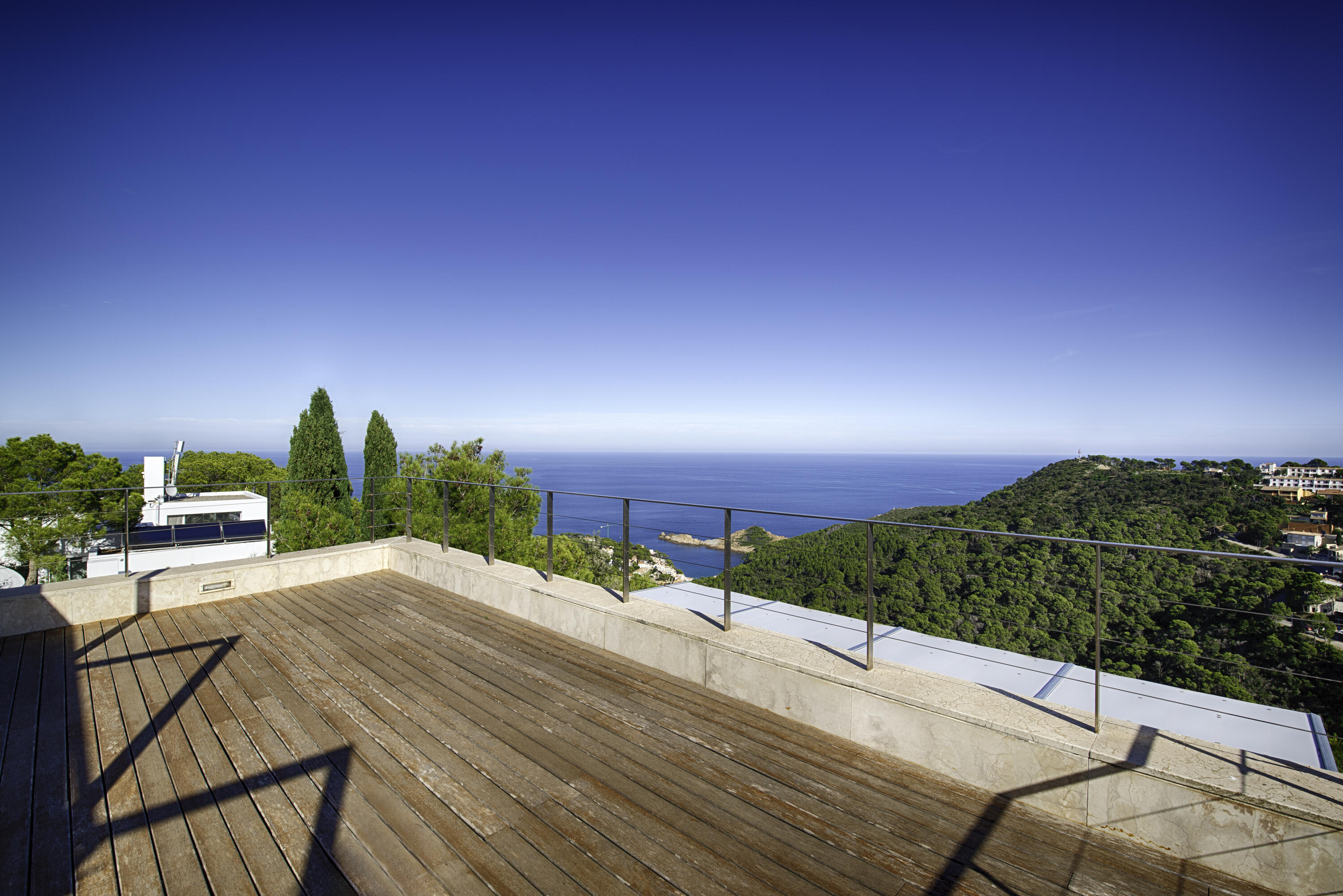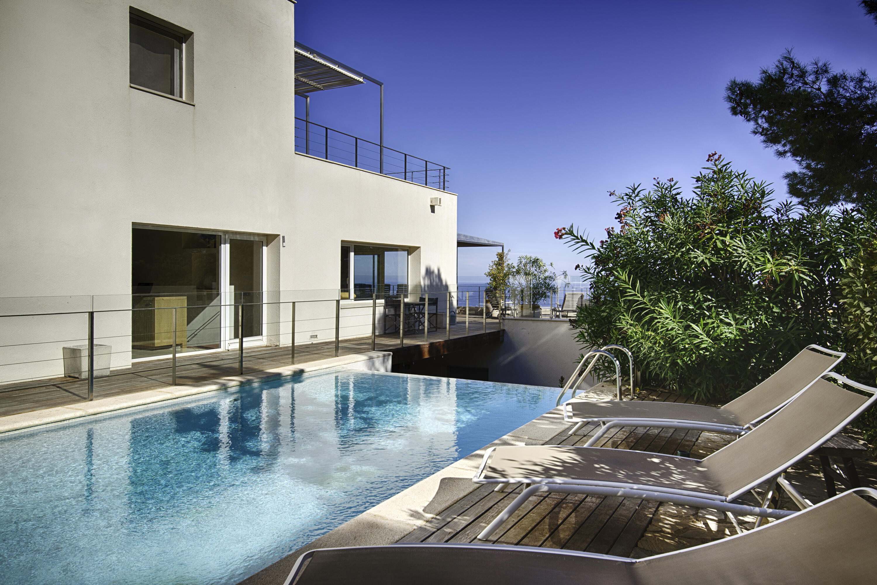 Le salon spacieux est équipé d'une smart-TV et offre une vue magnifique sur la mer et la piscine . À côté de cette pièce, vous accédez à une très grande terrasse partiellement couverte, équipée d'un salon de jardin luxueux, d'une grande table à manger et d'un barbecue à gaz. L'endroit idéal pour prendre le petit-déjeuner et le dîner, mais aussi pour profiter de la vue phénoménale sur la Méditerranée.