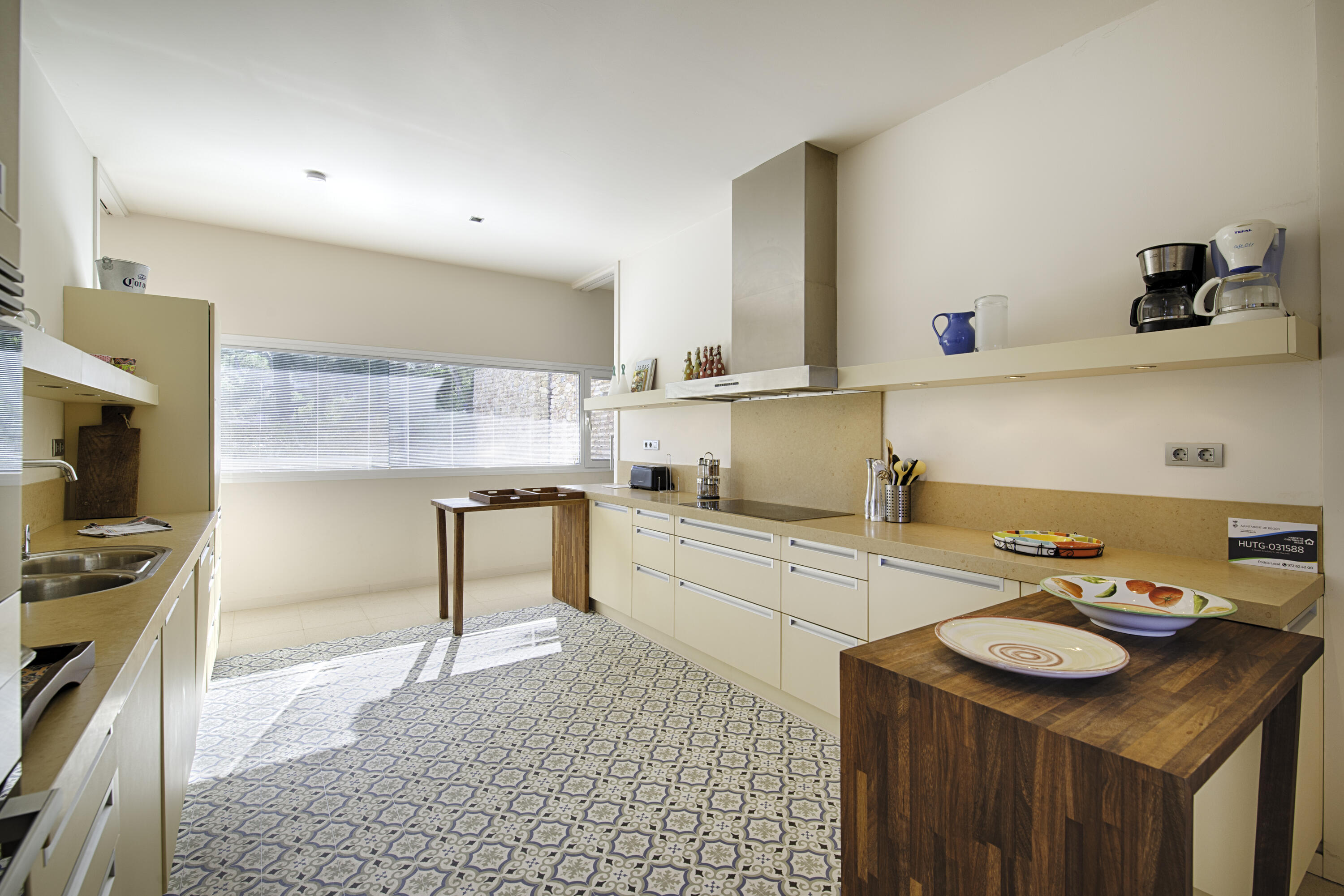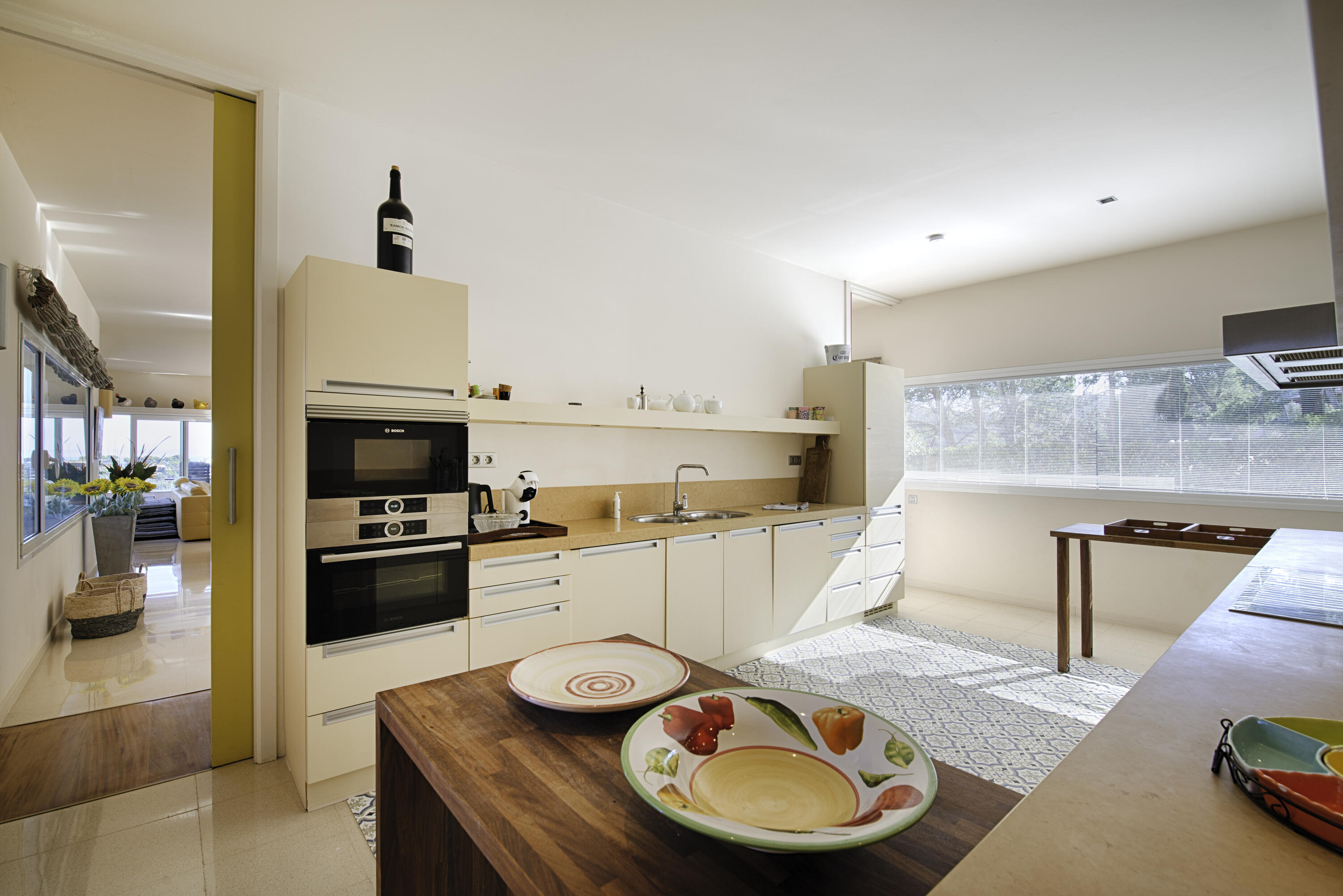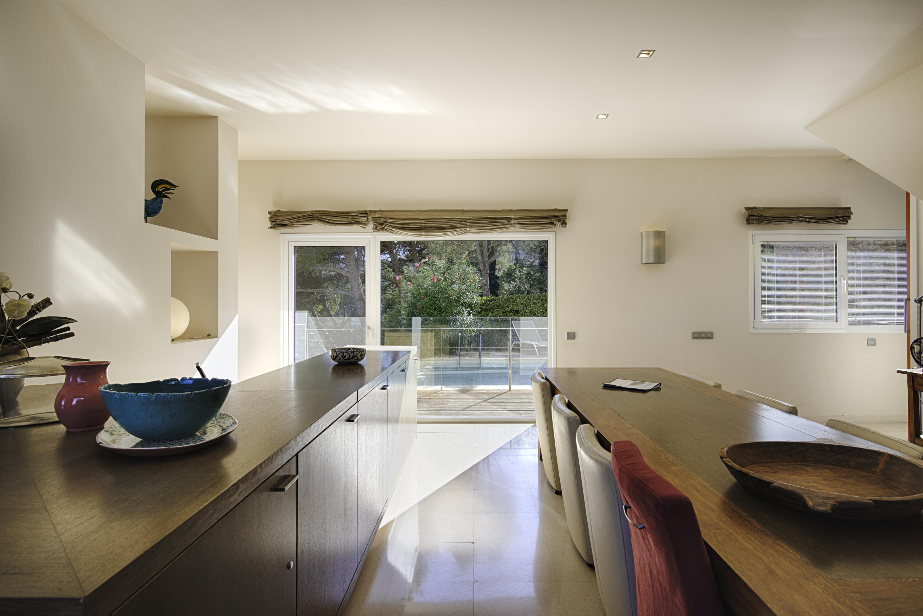 De l'autre côté du salon se trouve la salle à manger avec une grande table. Vous accédez ensuite à la cuisine semi-ouverte très spacieuse, qui est bien sûr équipée de tout le confort moderne. Il y a également une arrière-cuisine, où vous trouverez entre autres la machine à laver. À côté de la salle à manger, vous trouverez l'accès à la terrasse sur le côté et à la belle piscine privée. Équipée bien sûr de chaises longues et de chaises confortables.