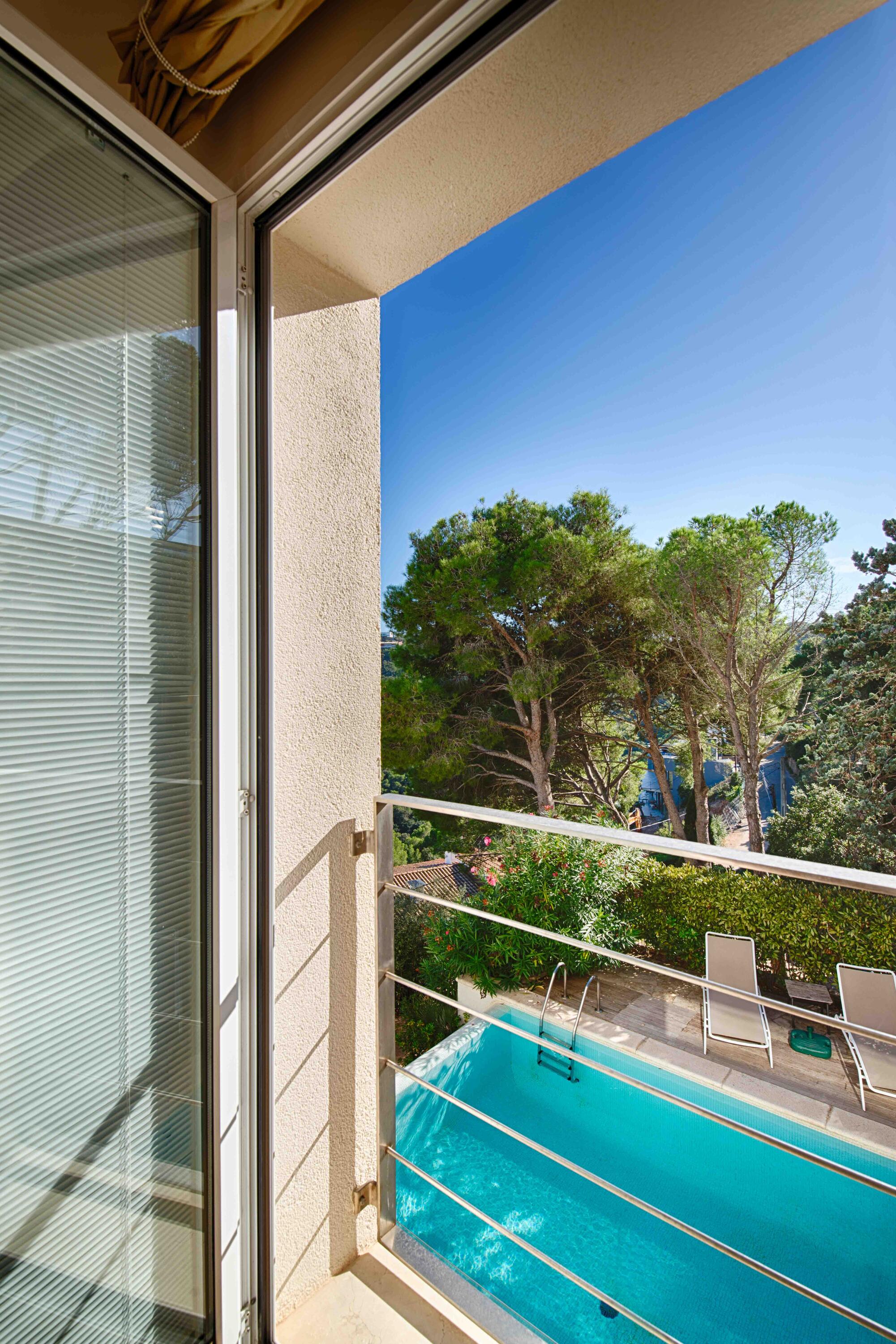 À l'étage supérieur se trouvent les deux chambres spacieuses, équipées de la climatisation. La chambre principale est très spacieuse, dispose d'une salle de bains attenante et d'une grande terrasse privée avec vue sur la mer. L'autre chambre peut également accueillir deux personnes et dispose également d'une salle de bains. Les lits sont de très bonne qualité, comme tout le reste de cette maison. Comfortvilla s'occupe également de la gestion et de l'entretien de la maison, donc si vous avez besoin de quoi que ce soit, nous sommes à proximité pour vous aider.