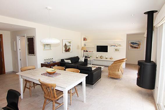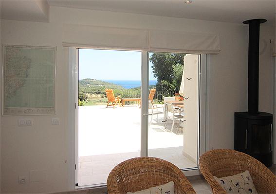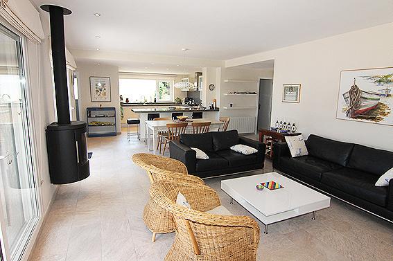 Le salon spacieux a un accès direct à la grande terrasse, à partir de laquelle il y a une belle vue sur le jardin, les champs et la mer à l'horizon. Dans le salon il y a une télévision avec satellite Astra et DVD.