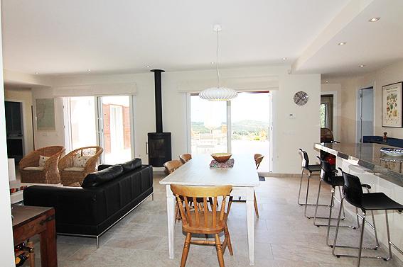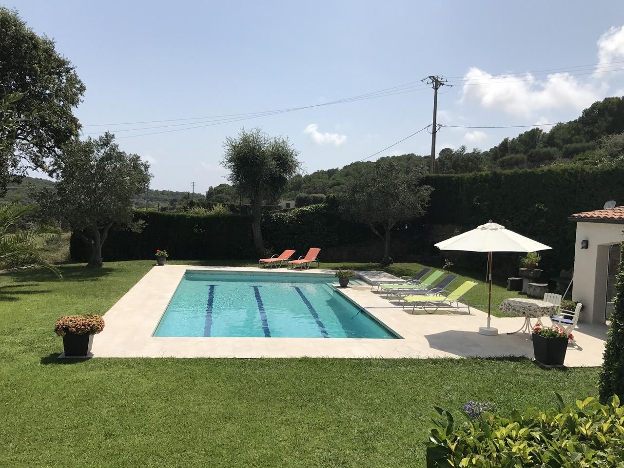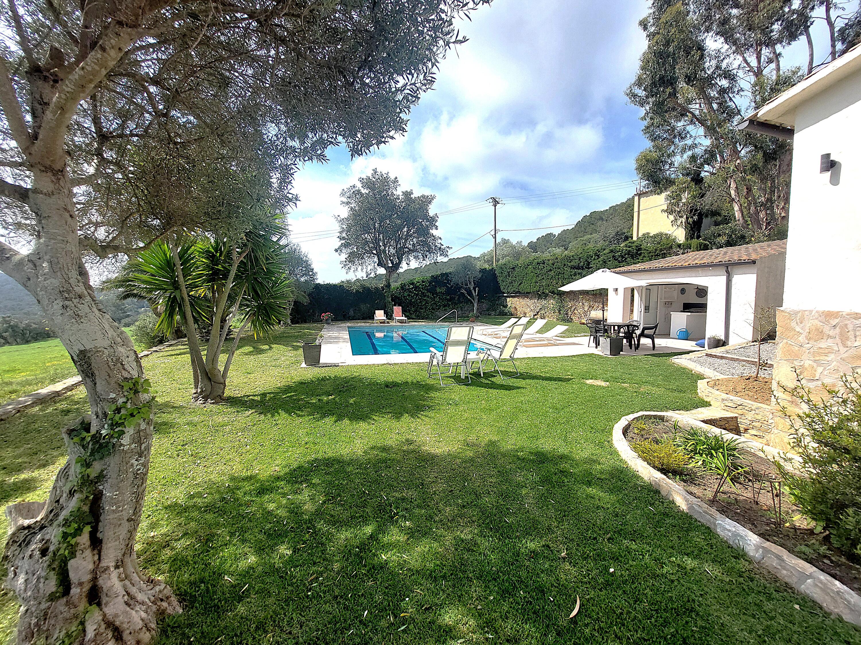 La maison est située dans un quartier très calme au bout d'un quartier résidentiel. Il a de belles vues sur les champs, les forêts et la mer Méditerranée. Le jardin est très spacieux avec une grande surface de pelouse. Dans la zone de la piscine se trouve la salle à manger d'été avec un petit réfrigérateur et un évier, un espace très agréable pour s'asseoir et manger à l'ombre. Sur la propriété il y a de la place pour garer 4 voitures.
