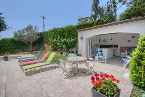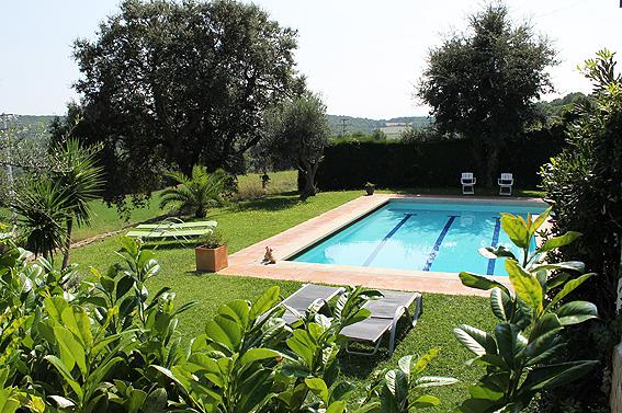 Piscine privée (9.5 x 5 mètres), jardin avec gazon et d’oliviers, terrasse couverte avec cuisine d’été à côté de la piscine, plusieurs terrasses, chaises longues, meubles de jardin, barbecue.