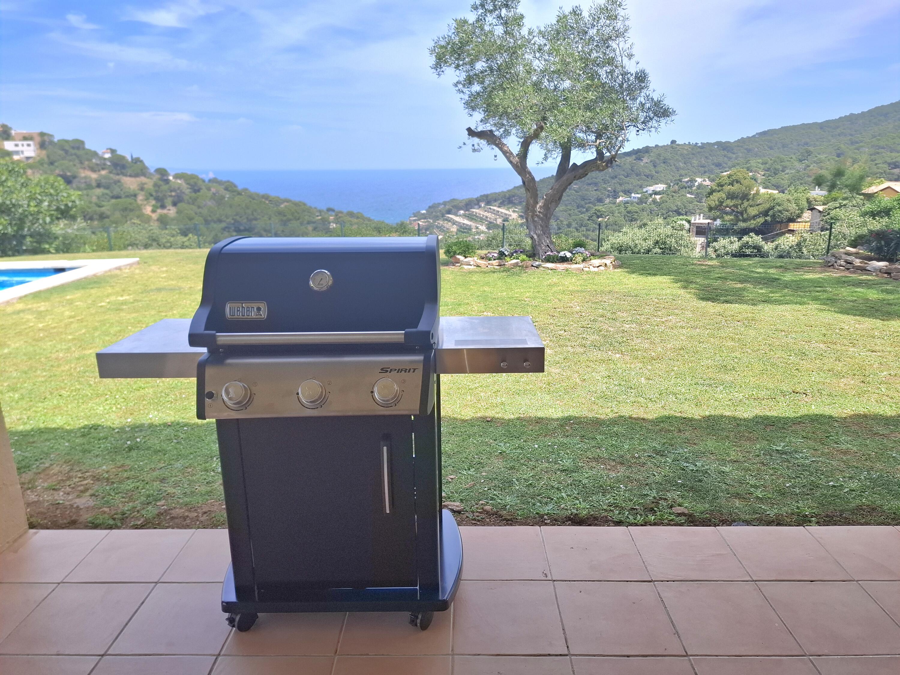 Piscine privée, terrasse couverte, barbecue, mobilier de jardin, barbecue.