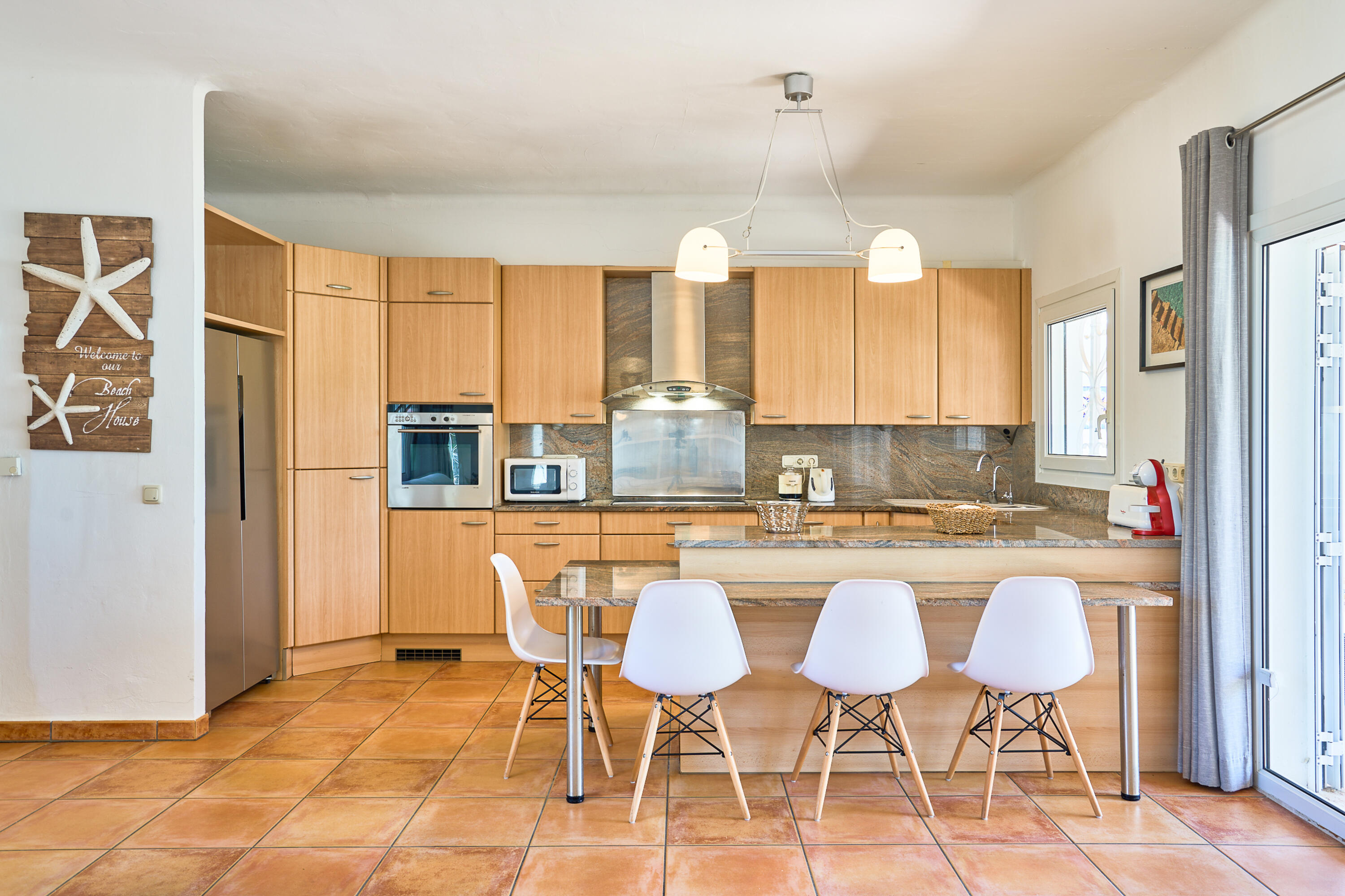 La cuisine est entièrement équipée, comme un lave-vaisselle, une plaque vitrocéramique, un micro-ondes, un grille-pain, une bouilloire, une machine à café (capules), un réfrigérateur-congélateur, un four.