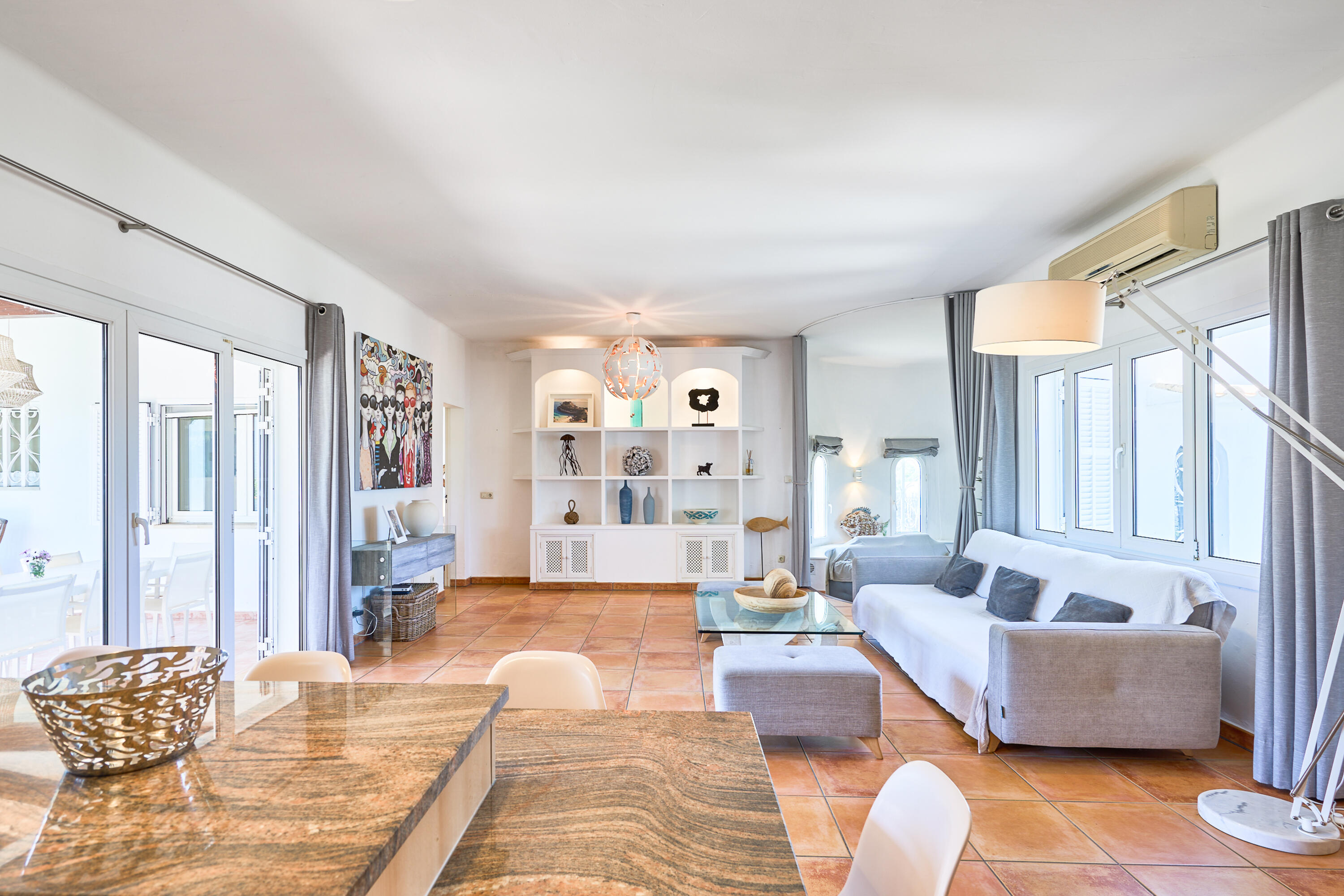 En entrant, vous traversez le hall jusqu'au séjour avec cuisine ouverte. De là, vous pouvez également marcher directement jusqu'à la terrasse couverte, le jardin et la piscine.