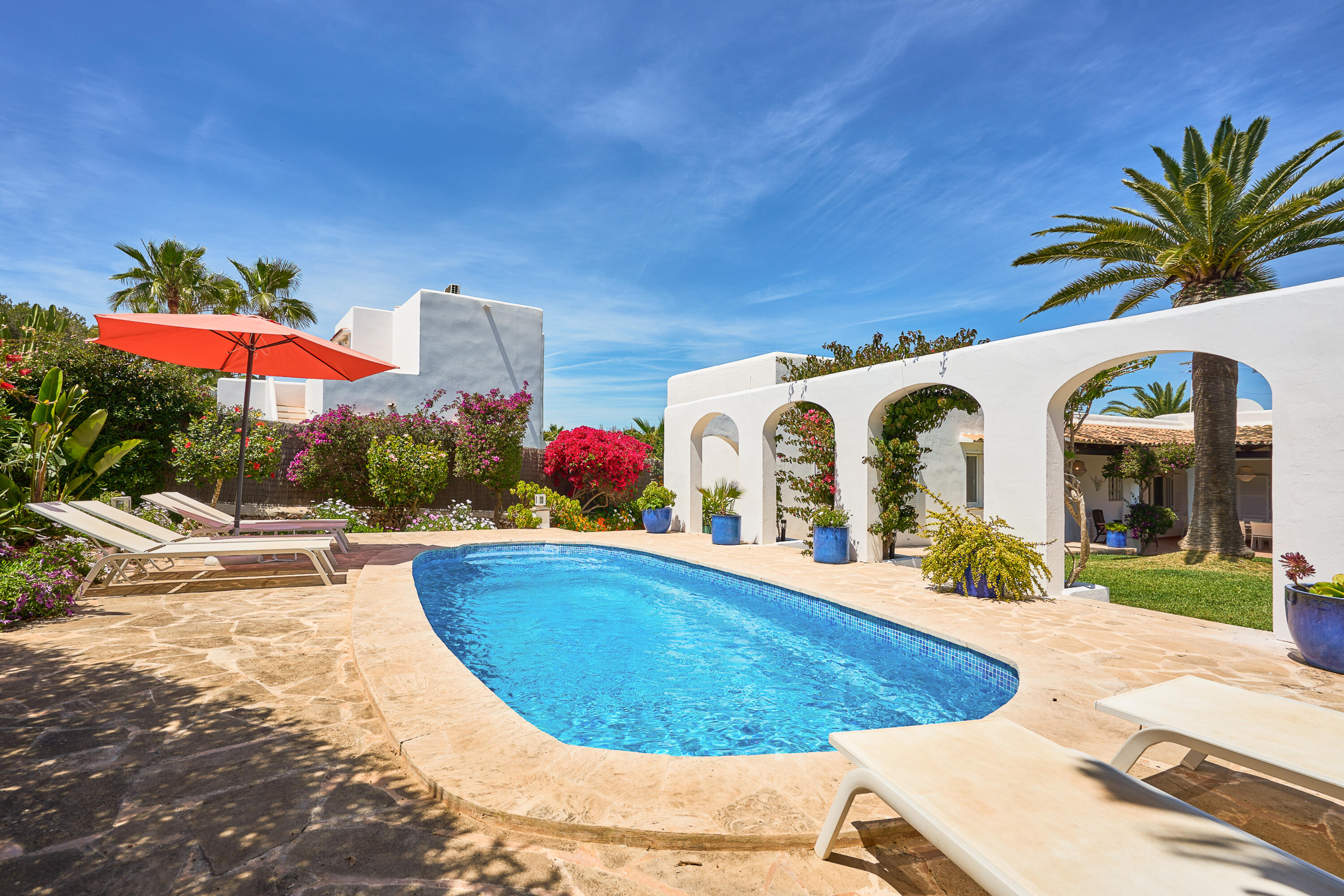 La maison est entièrement de plain-pied, même avec le jardin et la piscine. Le jardin a de l'herbe, donc c'est génial de jouer dessus. La piscine mesure environ 7 x 3 mètres. Il y a plusieurs terrasses, vous pourrez donc choisir l'ombre ou profiter du soleil. Bien sûr, il y a un joli barbecue permanent.