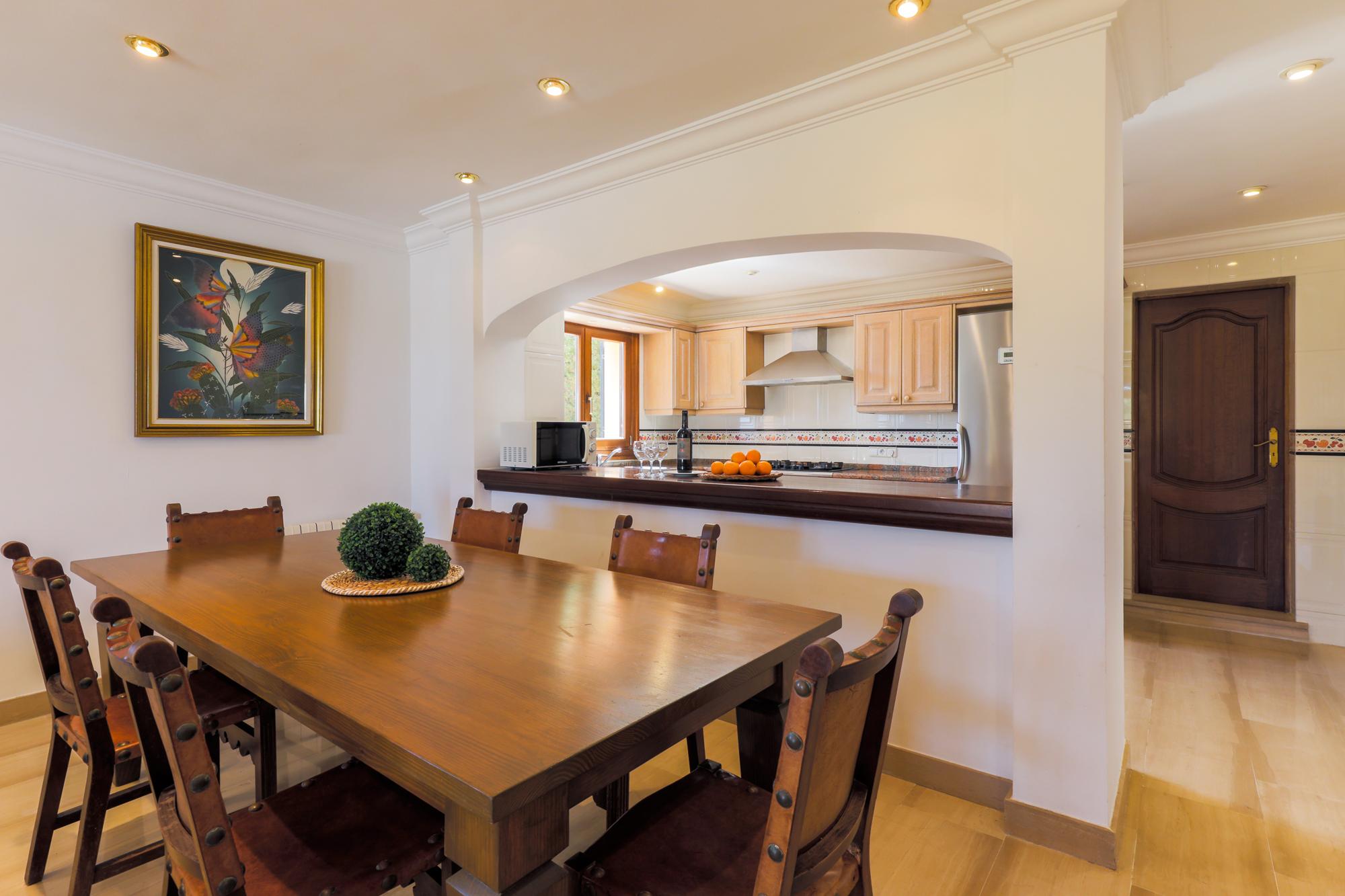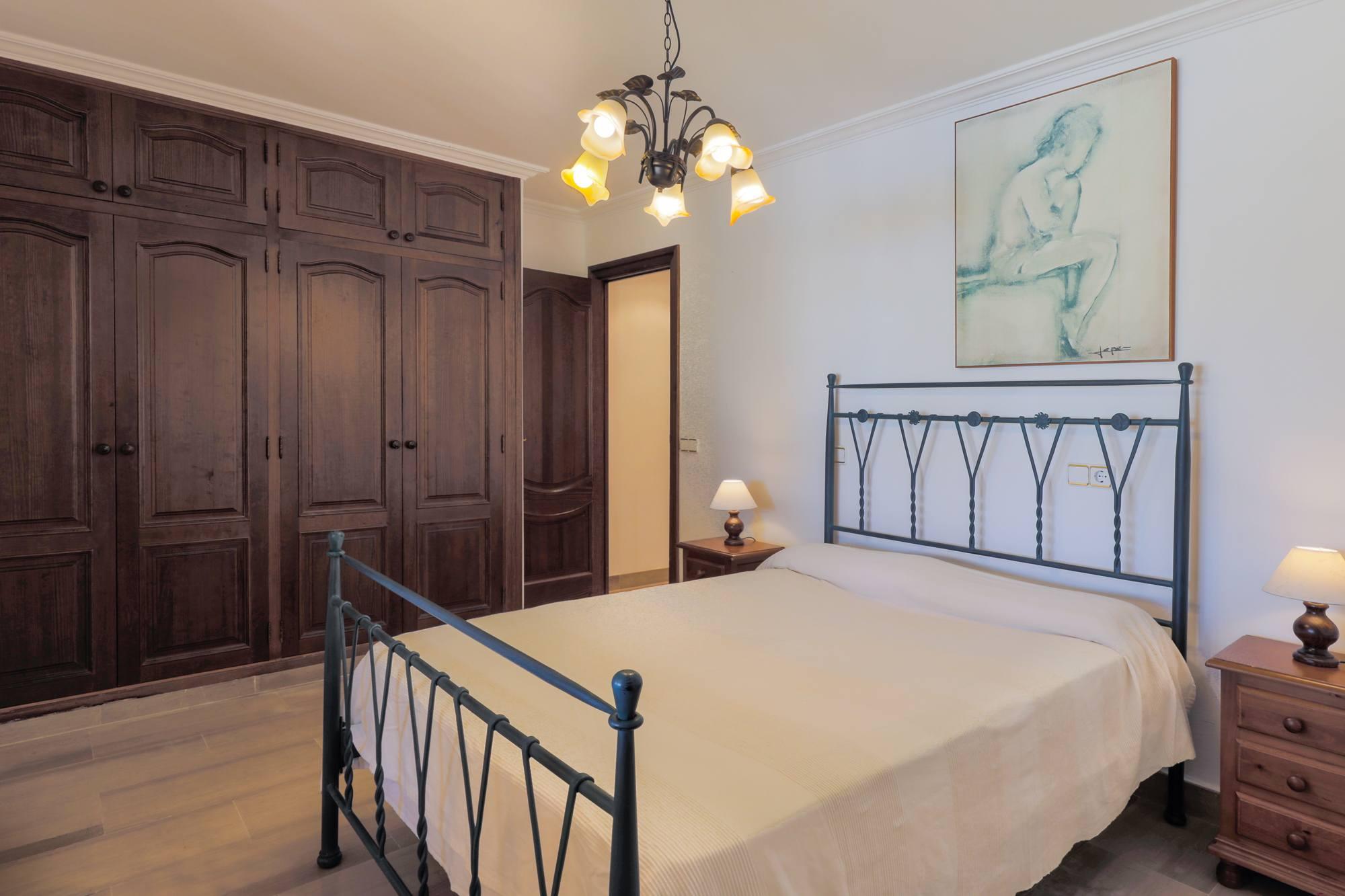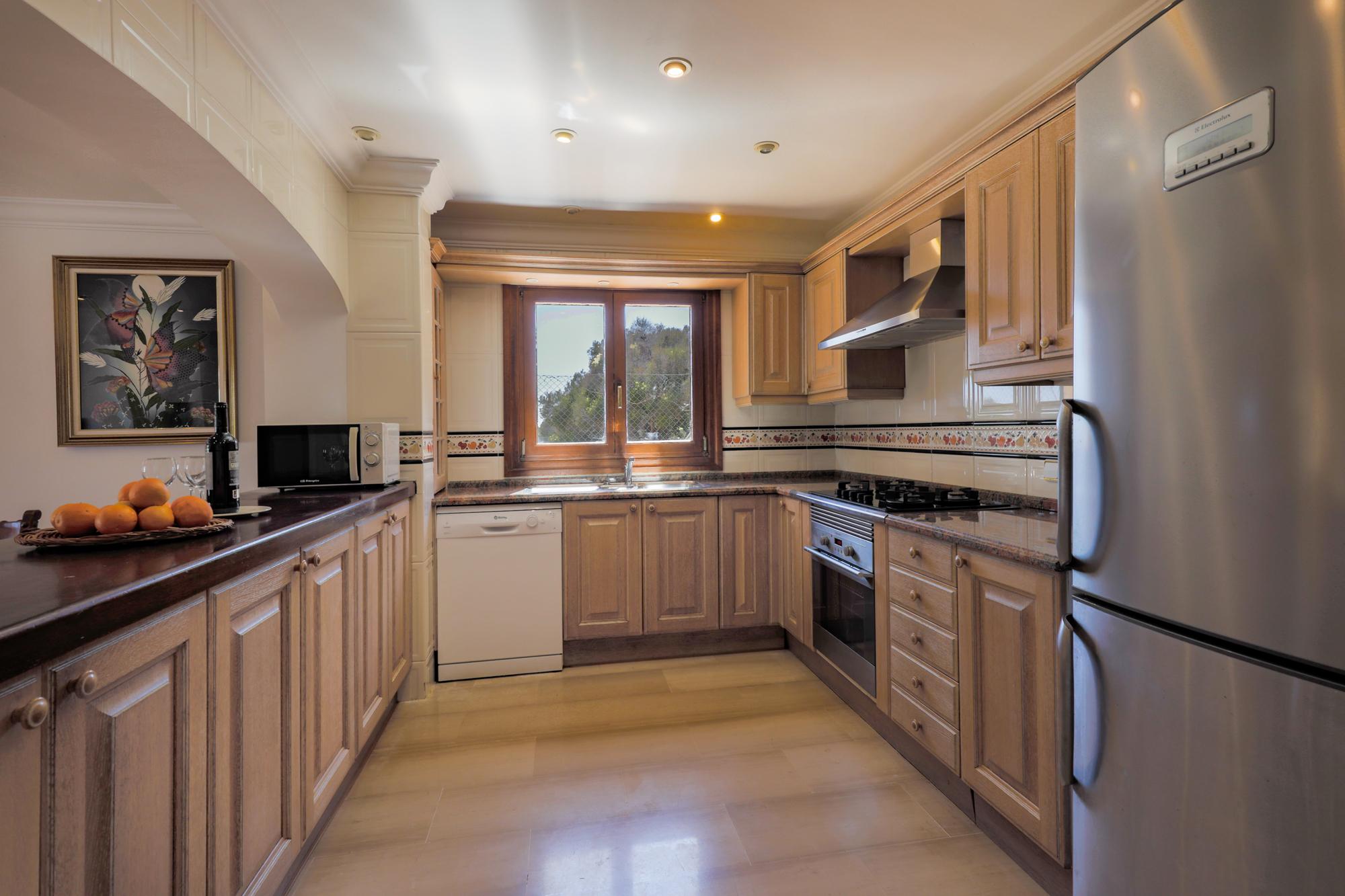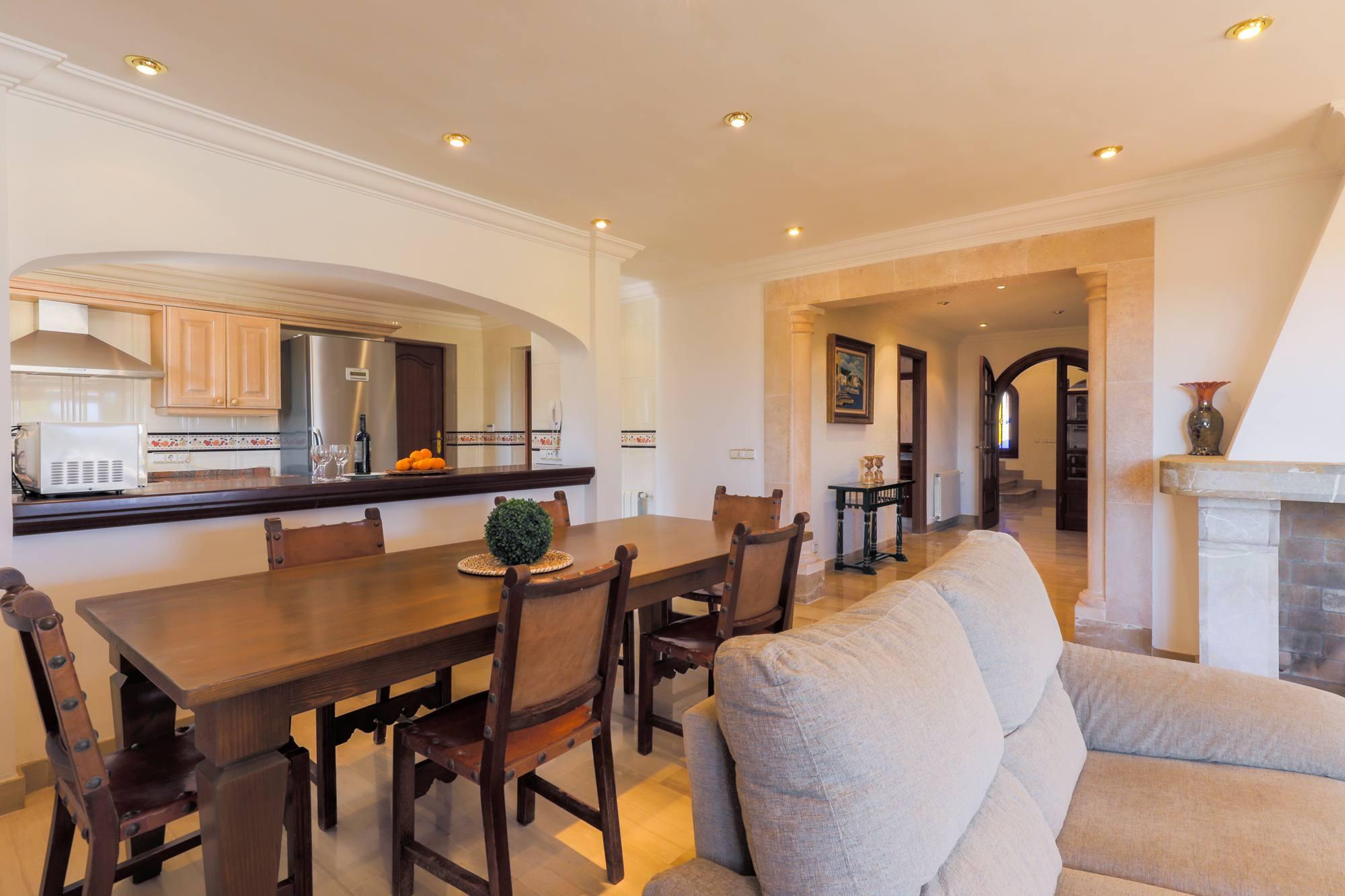 Villa Cala Mitjana est une villa spacieuse pleine de lumière naturelle avec des carreaux de marbre de refroidissement partout, meublé avec un style classique. La salle spacieuse donne accès au salon / salle à manger ouvert avec portes donnant sur le jardin et à la terrasse meublée de la piscine. Belle cuisine ouverte séparée de la salle à manger par un bar de petit déjeuner. Cet étage offre également deux chambres à coucher; Une chambre et une salle de bains familiale séparée avec un bain circulaire surélevé et une grande douche séparée. La seconde est une chambre à deux lits avec salle de douche attenante qui a accès à l'extérieur-cette salle de douche contient la machine à laver-. Sèche-linge disponible dans le garage.