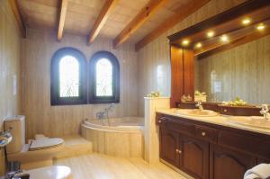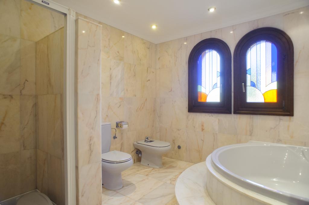 L'escalier en marbre mène à l'étage dans un autre salon avec accès à une terrasse avec une belle vue sur le jardin, piscine et court de tennis. L'étage supérieur dispose de trois chambres supplémentaires. La chambre double principale qui a une fenêtre donnant sur la piscine et un espace vestiaire séparé, et deux chambres à lits jumeaux qui ont des fenêtres donnant sur la campagne. Ces chambres partagent une salle de bains carrelée en marbre qui a un bain rond. Salles de bains avec sèche-cheveux.