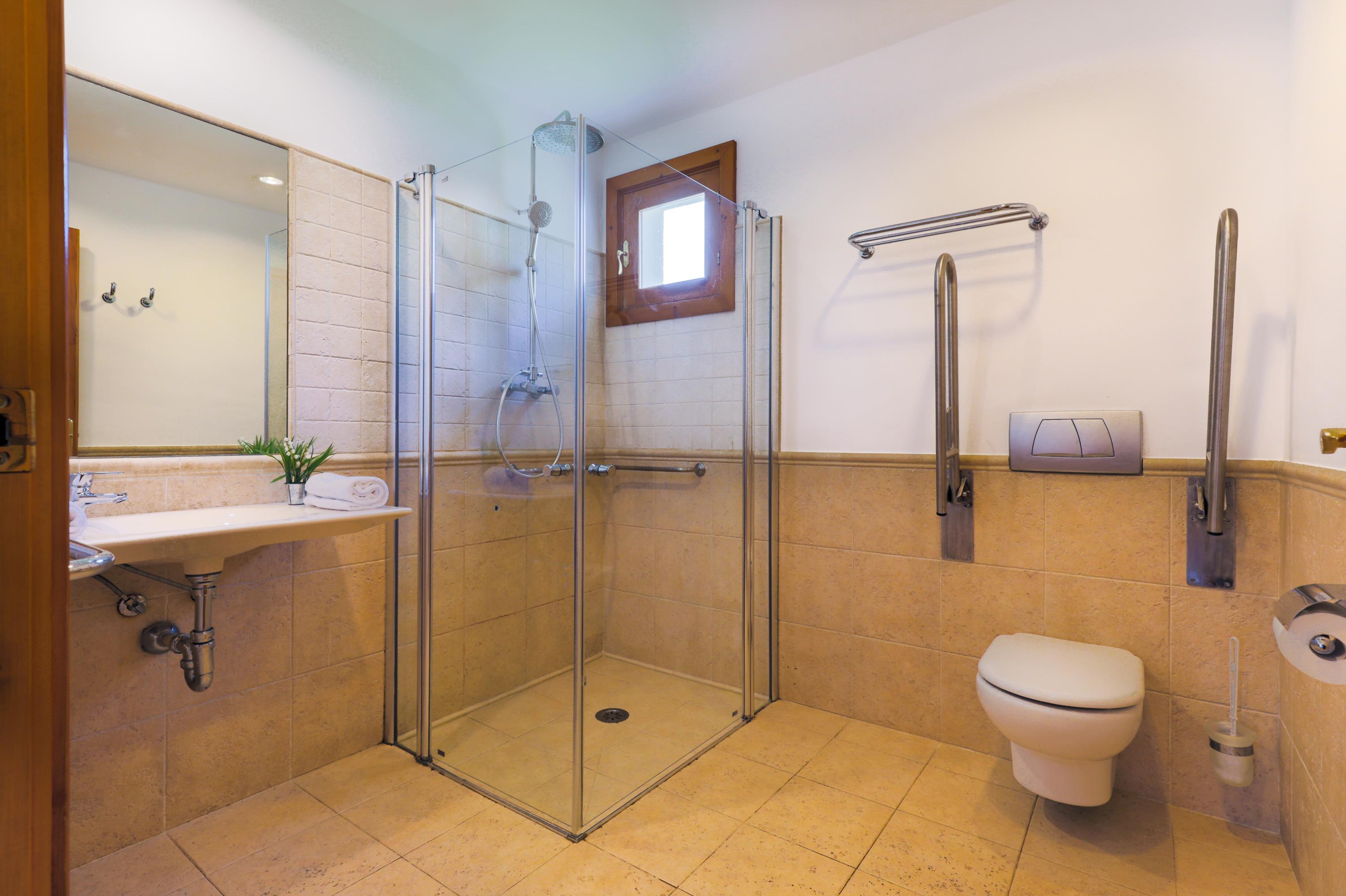 En bas il ya trois chambres lumineuses; Un jumeau avec salle de bain complète / salle de douche et porte latérale à la terrasse près de la piscine, un double et un jumeau qui partagent une salle de douche adaptée pour les utilisateurs de fauteuil roulant, et adjacent est également un wc séparé.