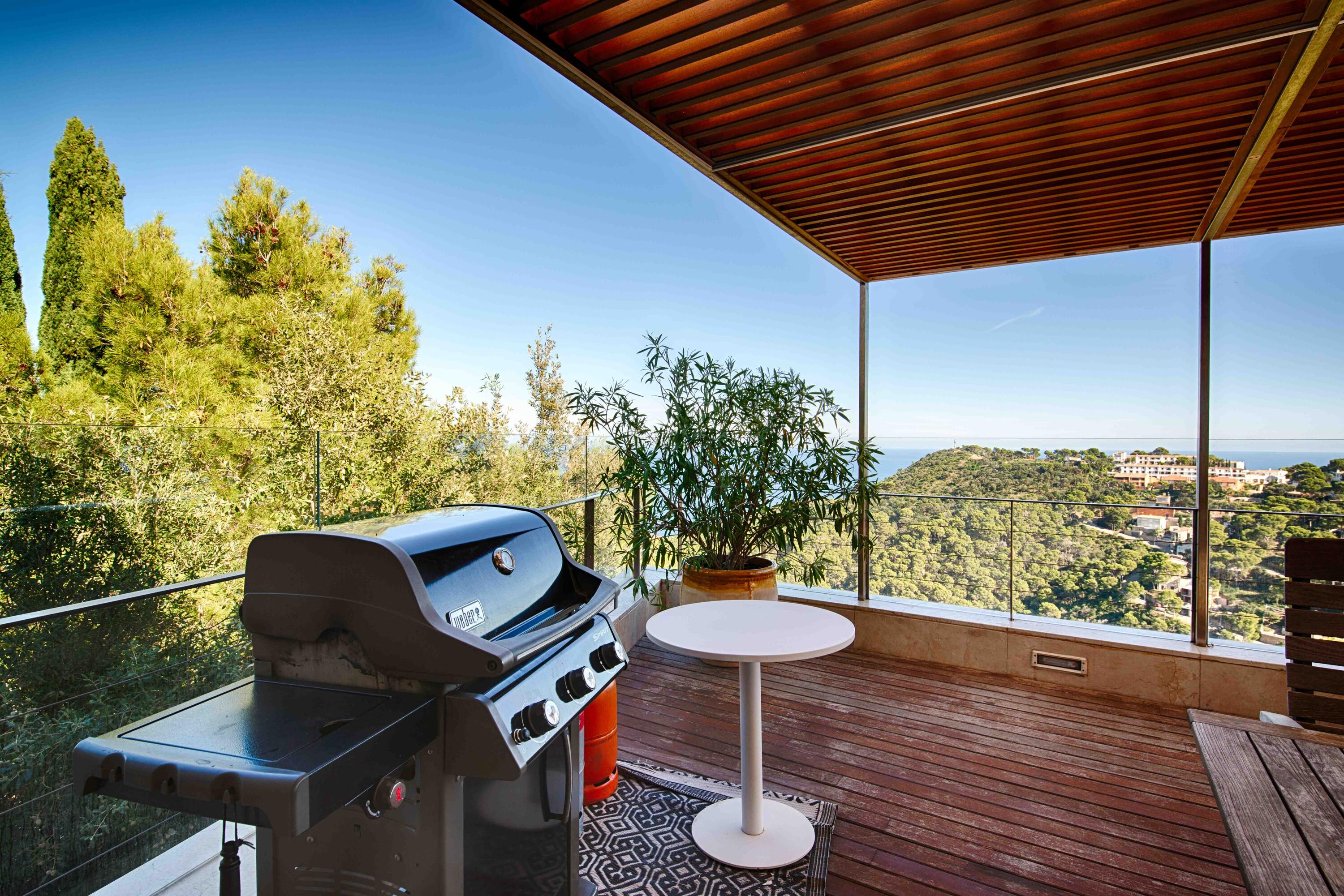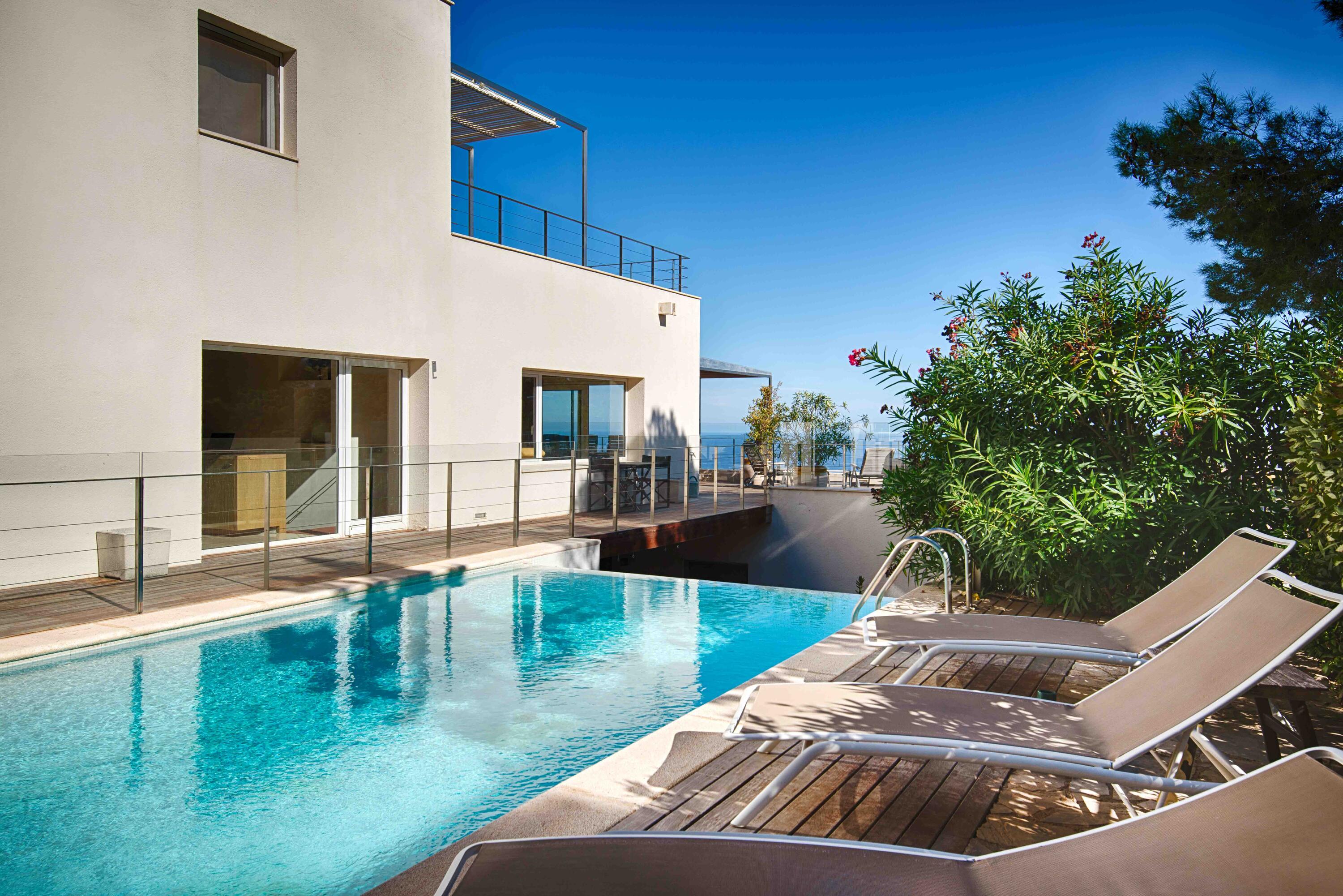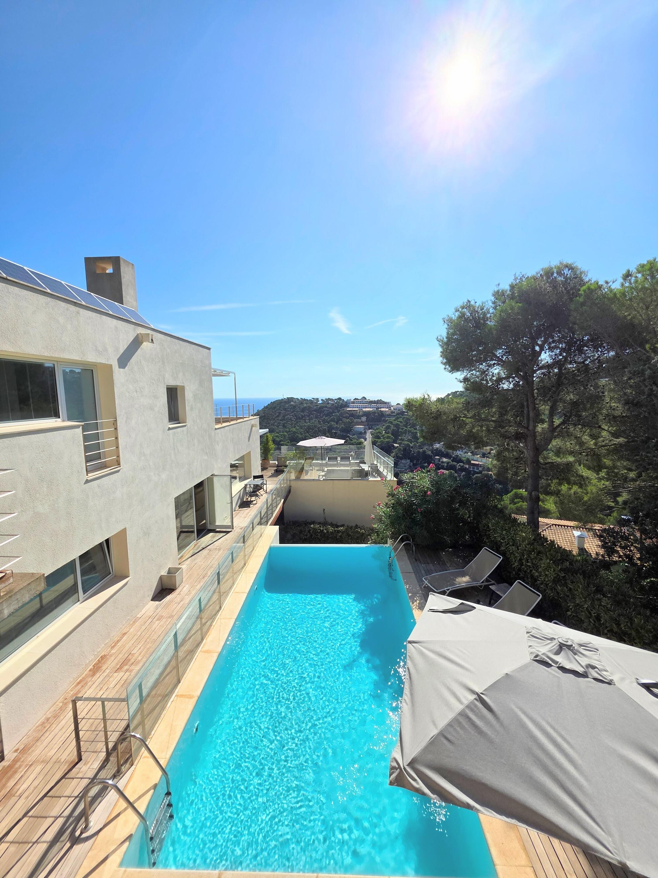 This villa, Casa Monica in Begur, consists of a main house for four people, plus a fully equipped luxury flat that can also accommodate four people, making a total of eight people. Next to the houses is a beautiful private swimming pool with a large terrace. Ideal for a stay with two families! The houses are very quietly located on a small road. At the front of the main house, there is a 15-metre-wide terrace with a beautiful view of the Mediterranean Sea, equipped with a large lounge set, large dining table and a barbecue.