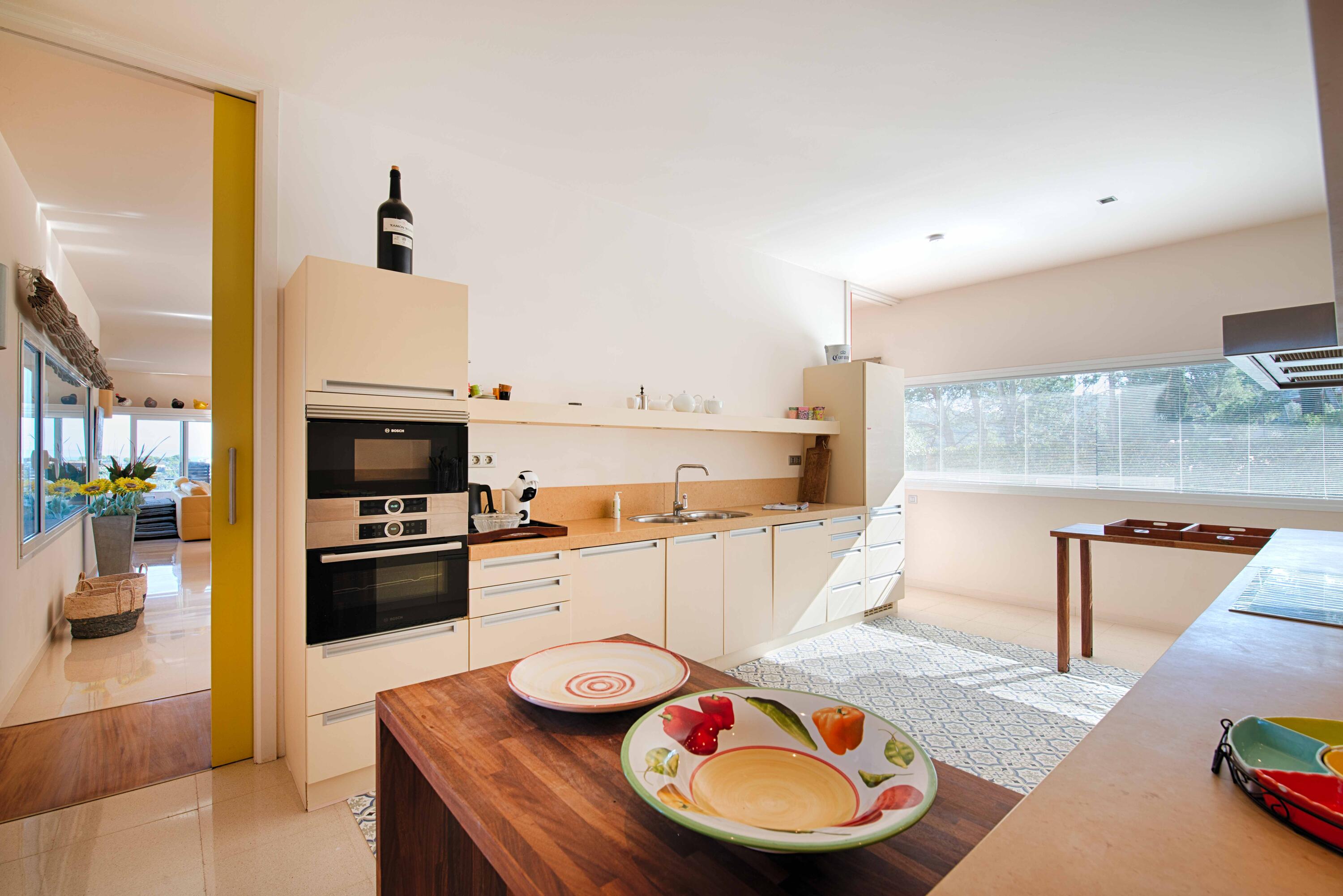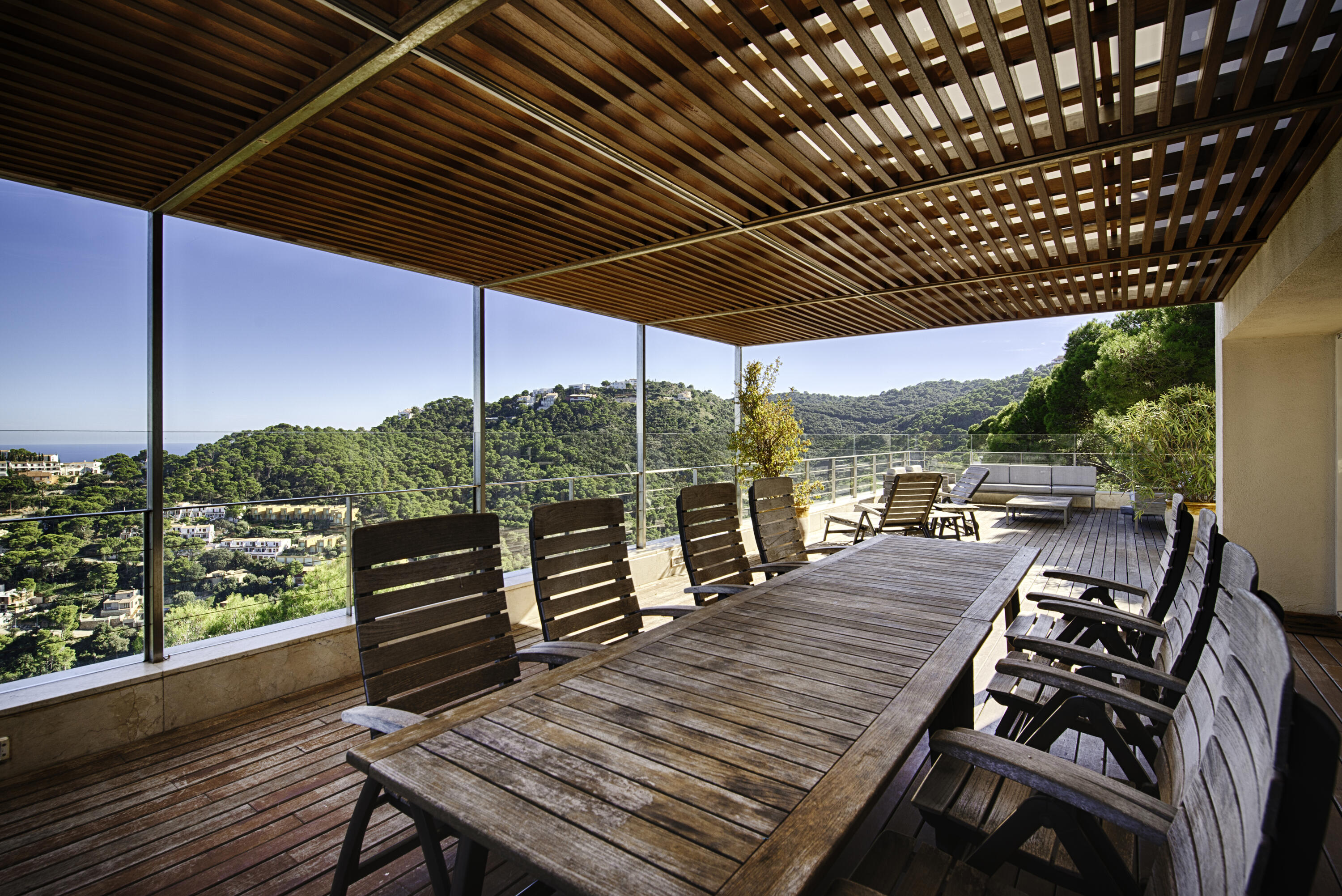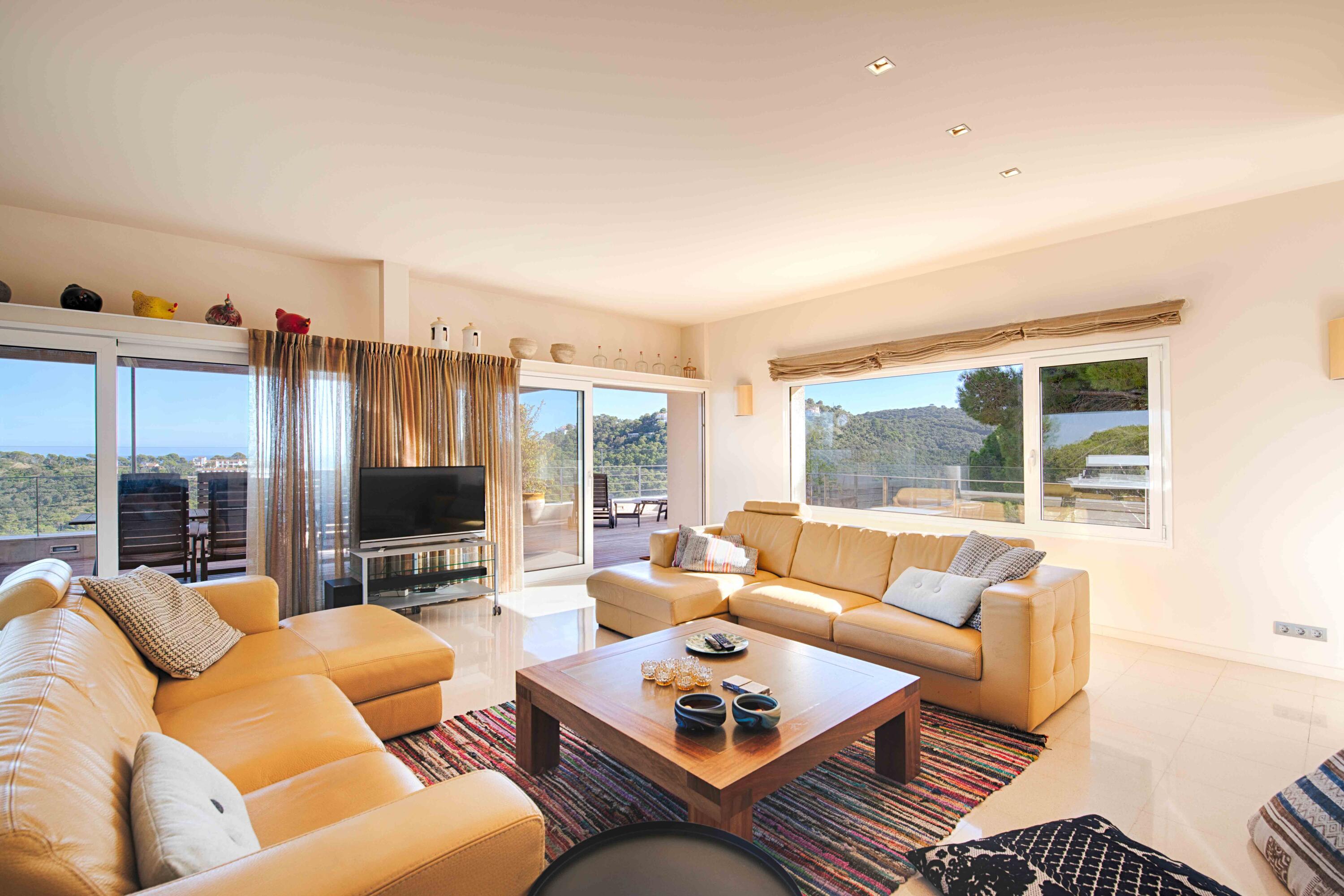 This villa, Casa Monica in Begur, consists of a main house for four people, plus a fully equipped luxury flat that can also accommodate four people, making a total of eight people. Next to the houses is a beautiful private swimming pool with a large terrace. Ideal for a stay with two families! The houses are very quietly located on a small road. At the front of the main house, there is a 15-metre-wide terrace with a beautiful view of the Mediterranean Sea, equipped with a large lounge set, large dining table and a barbecue.