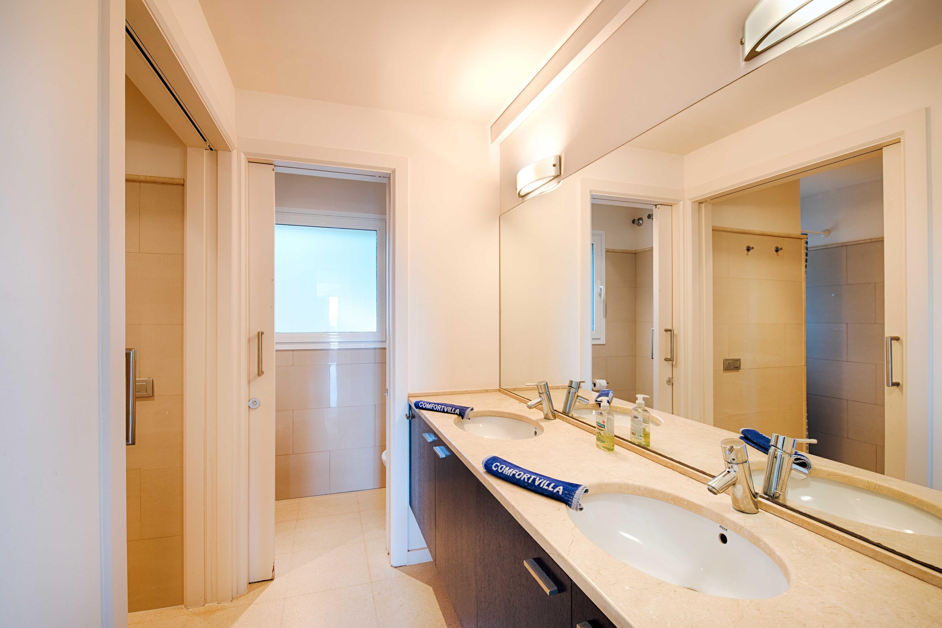 To the right of the carport is the entrance to the main house. An internal staircase leads to the very large living-dining room. Adjacent to the living room is a huge terrace with sea views, a large dining table and some sun loungers. On the other side of the dining room is the large and fully equipped kitchen and utility room. This is of course equipped with a dishwasher, refrigerator, freezer and other appliances. Upstairs there are two bedrooms and two bathrooms. The master bedroom has a luxurious bathroom with bath, separate shower and double washbasin, as well as its own terrace with sea view. The second bedroom overlooks the swimming pool and has a bathroom with shower and washbasin. Both bedrooms are air-conditioned.