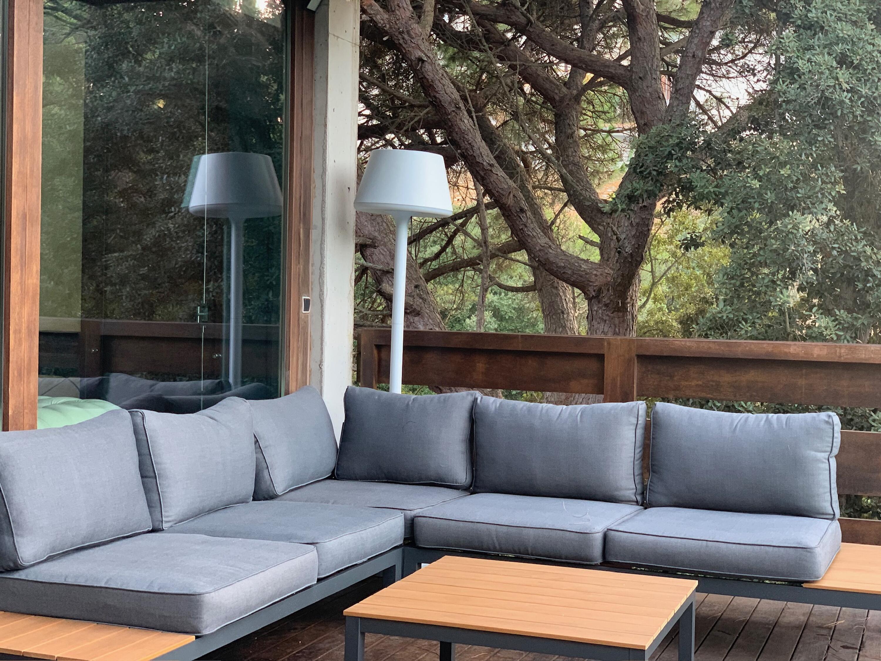 Adjacent to the terrace is the living room with a cosy sitting area.