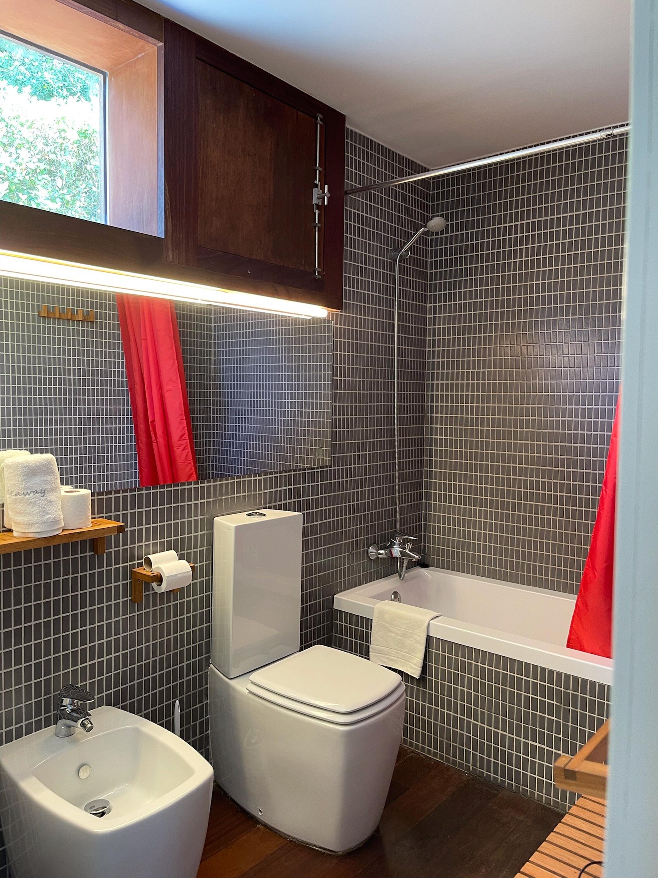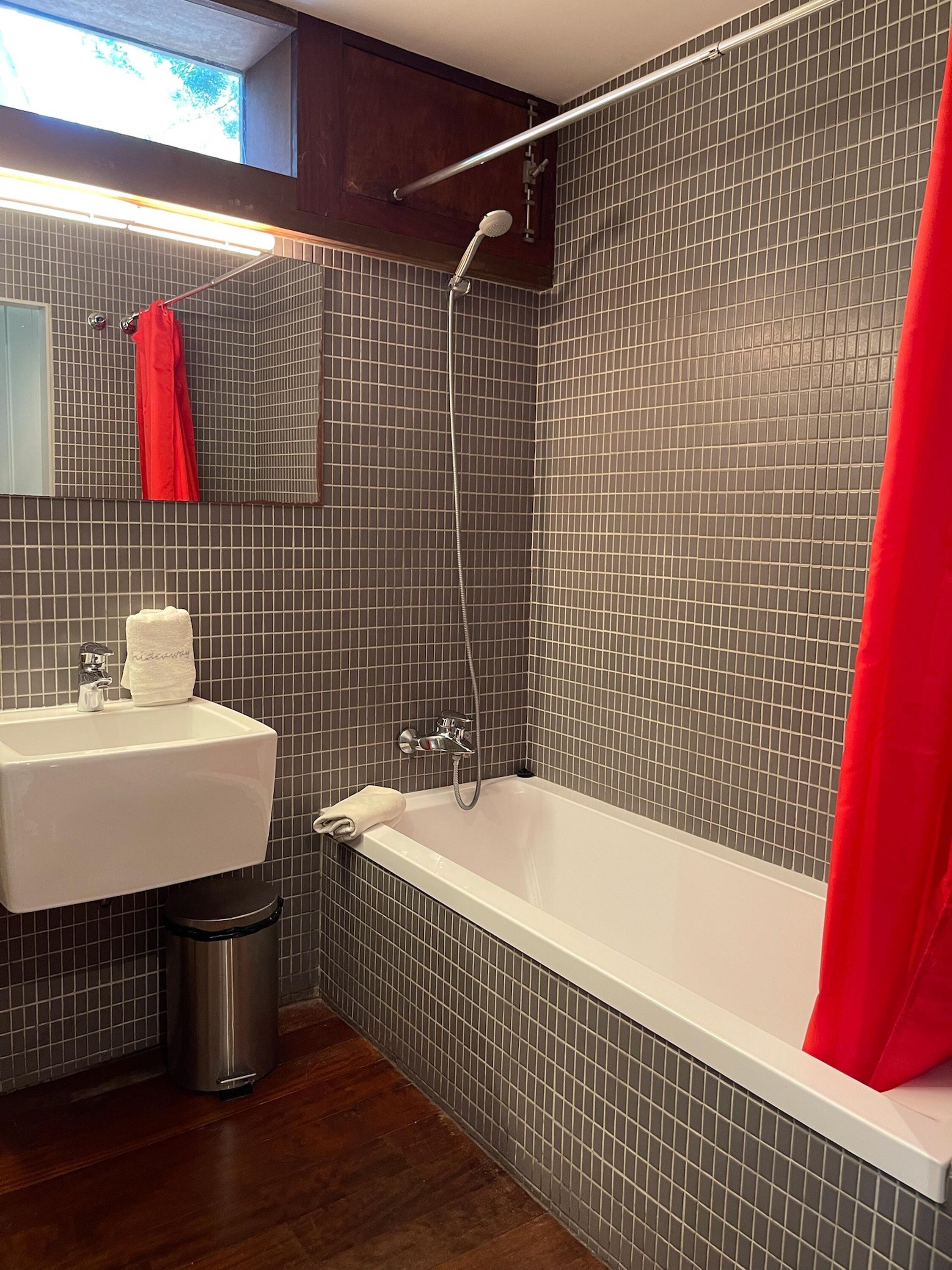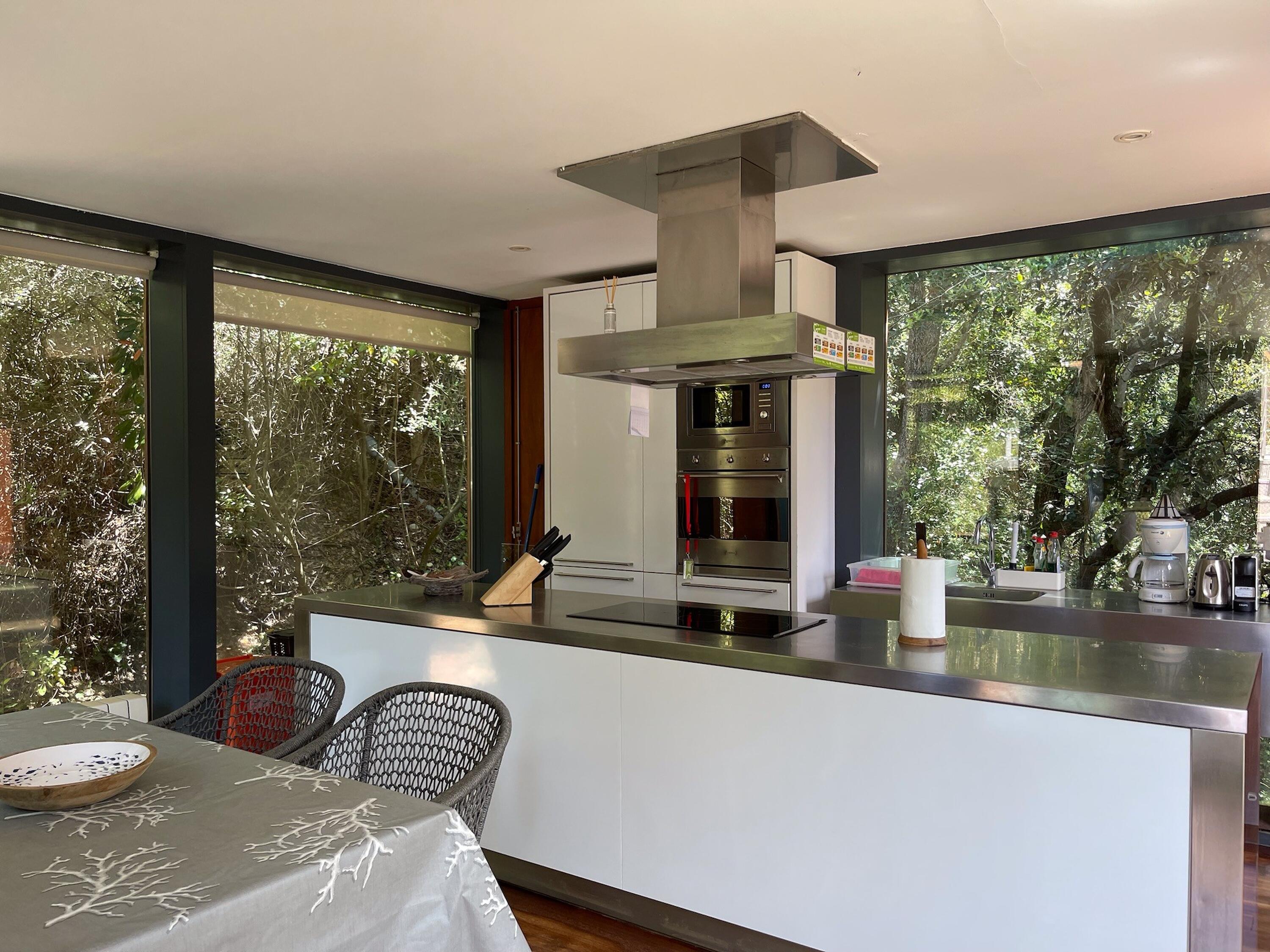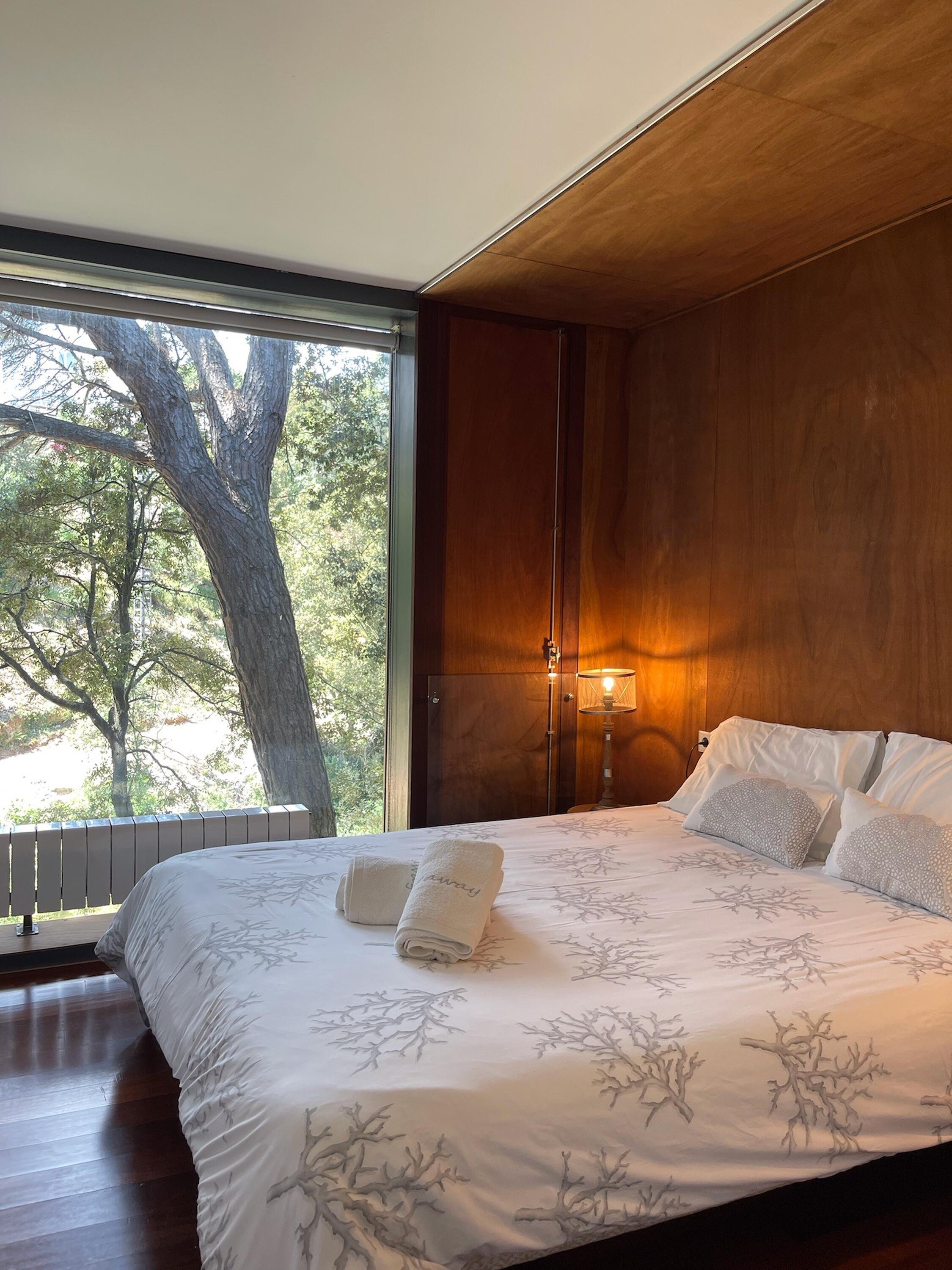 The house has four bedrooms and three bathrooms. Three rooms have a nice double bed and the fourth room has two single beds, one of which is a trundle bed. The large windows surrounded by greenery make it a wonderful experience.