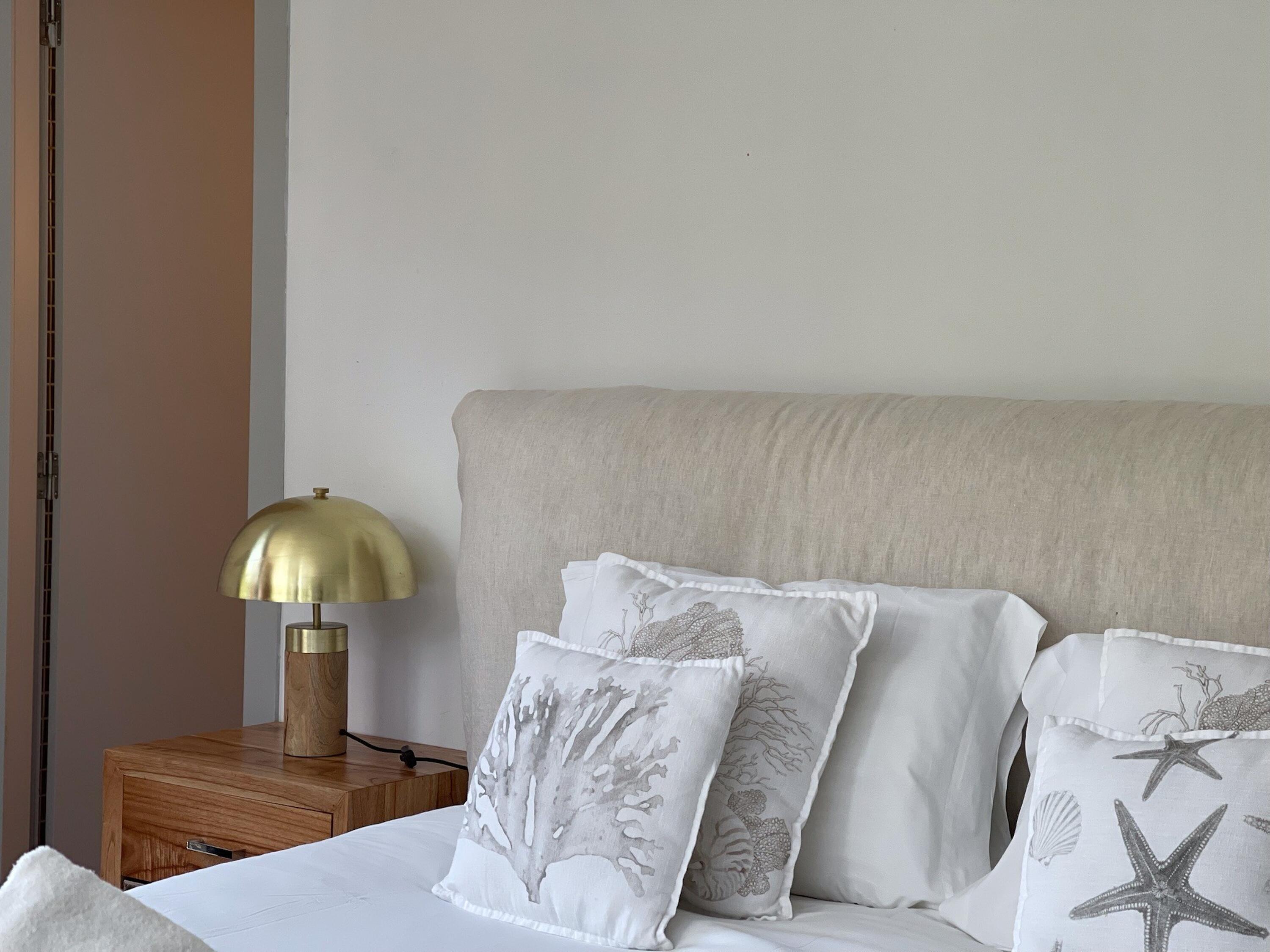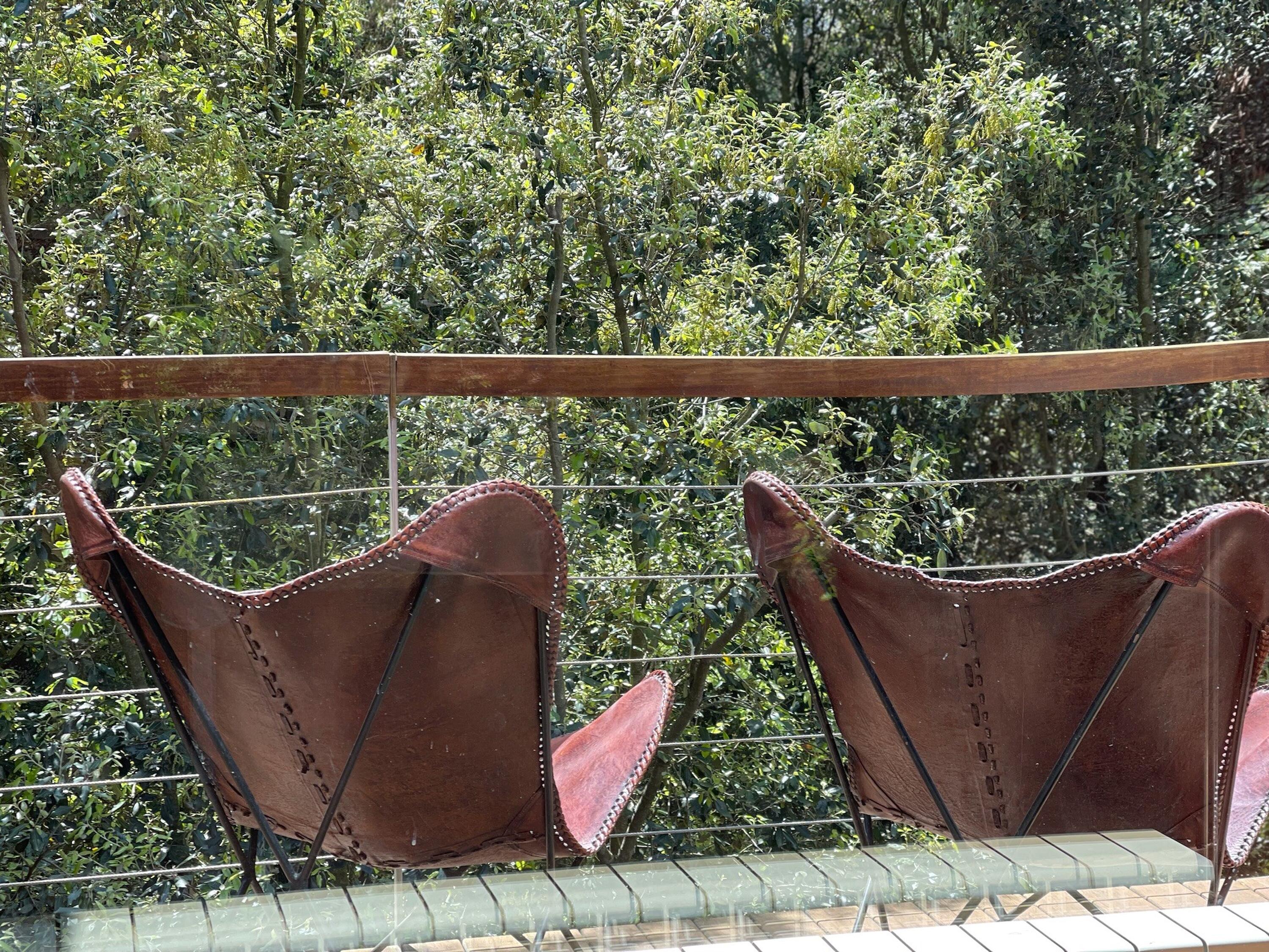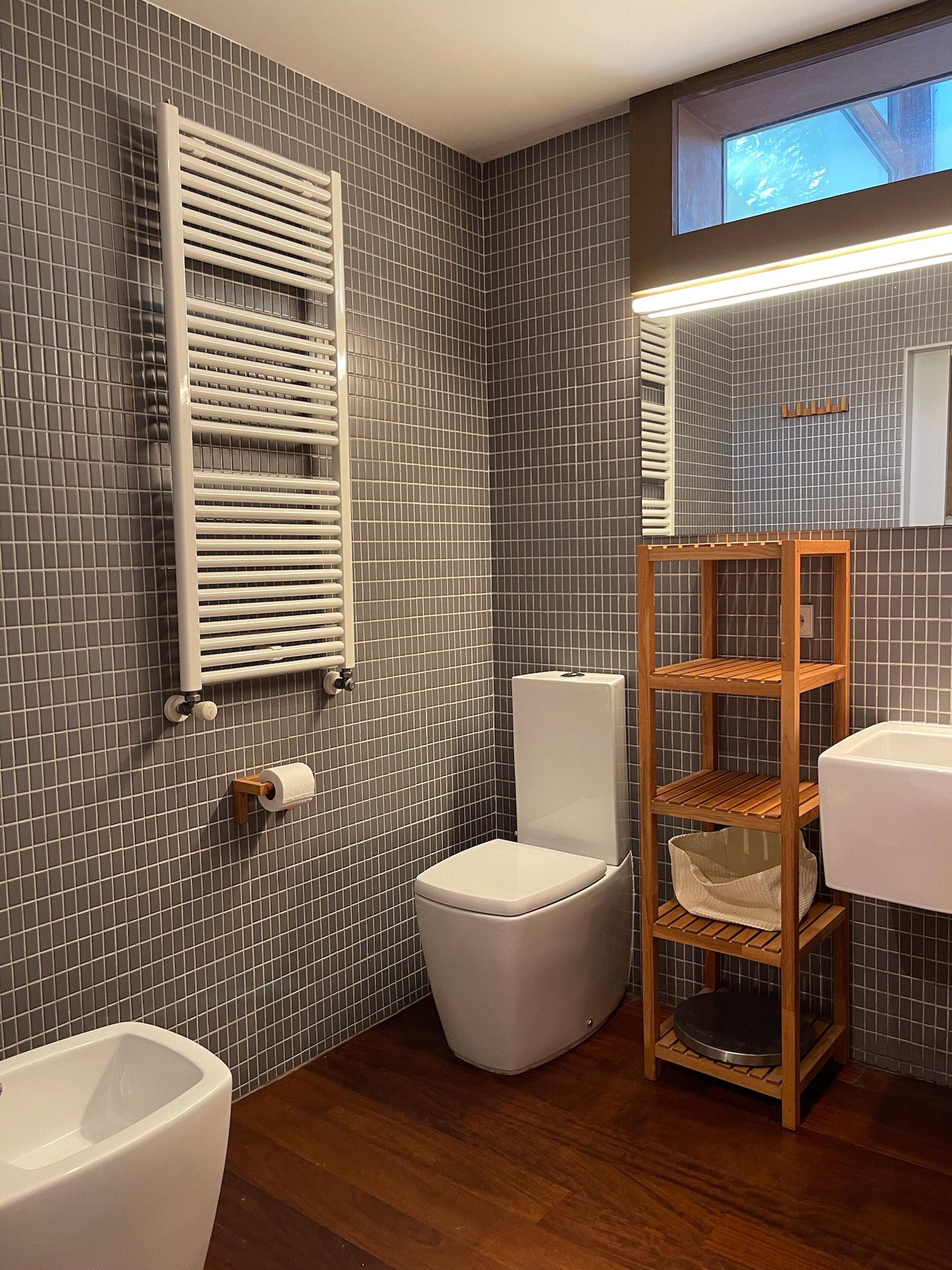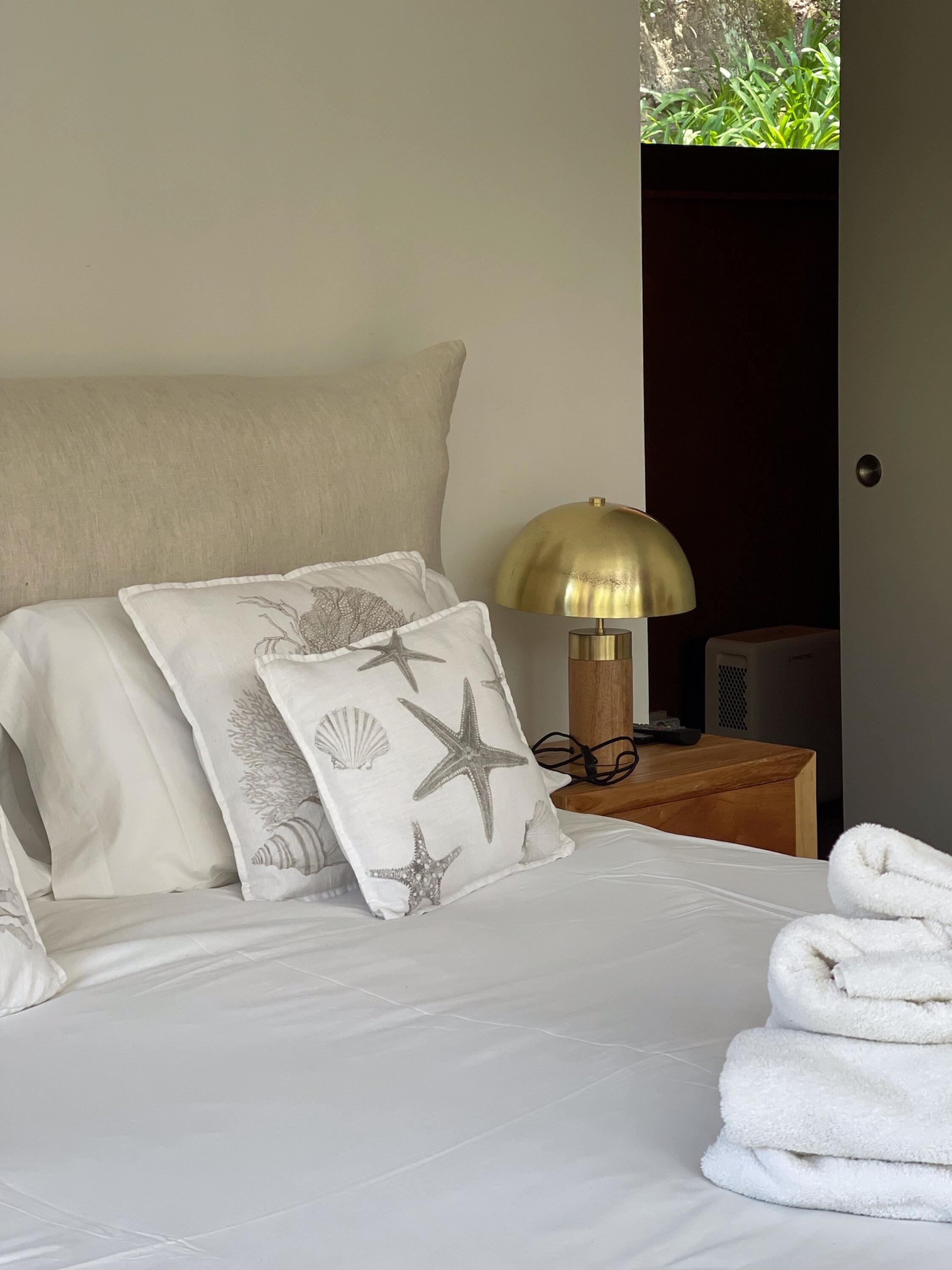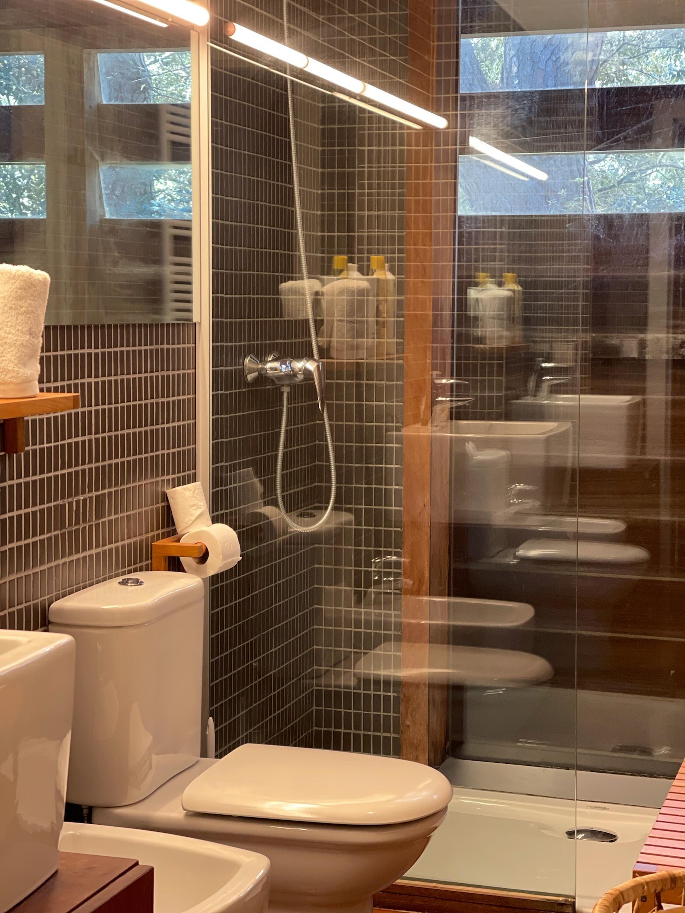 The house has four bedrooms and three bathrooms. Three rooms have a nice double bed and the fourth room has two single beds, one of which is a trundle bed. The large windows surrounded by greenery make it a wonderful experience.
