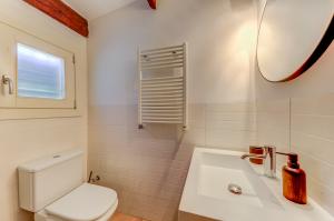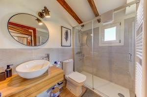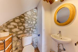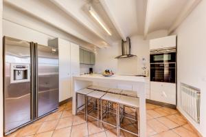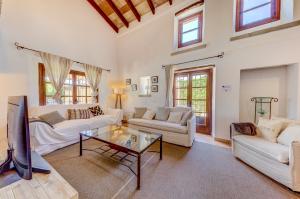 Inside, the villa is spread over 2 floors. Next to the entrance hall there is a spacious living room with high ceilings with exposed beams, skylights and stone walls. French doors, overlooking the pool and BBQ area, lead to a lovely terrace with seating area, perfect for relaxing and reading a book.