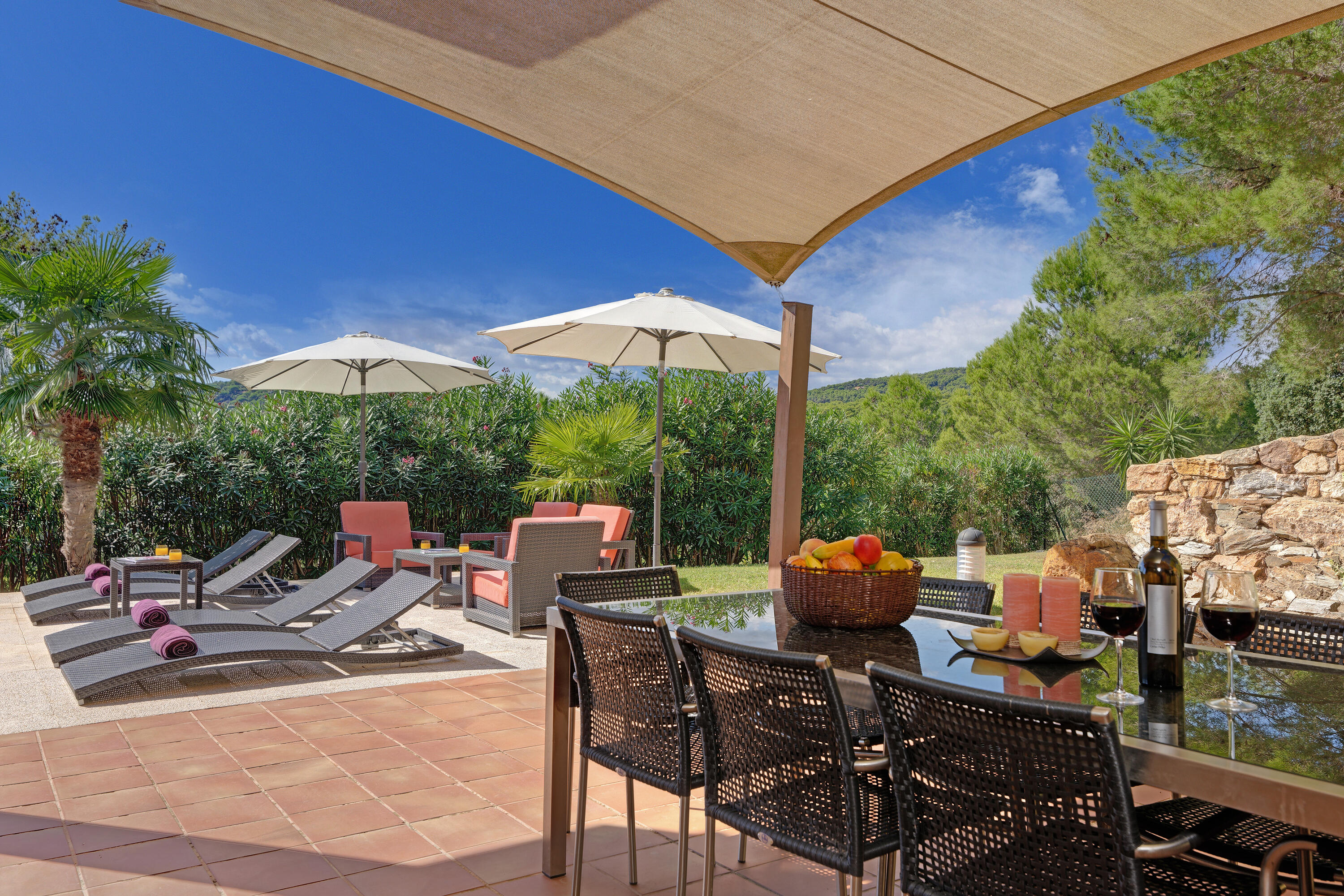 Outside, there is a well-maintained private swimming pool, garden and terraces, equipped with a lounge set, dining table and chairs, and several sun loungers.