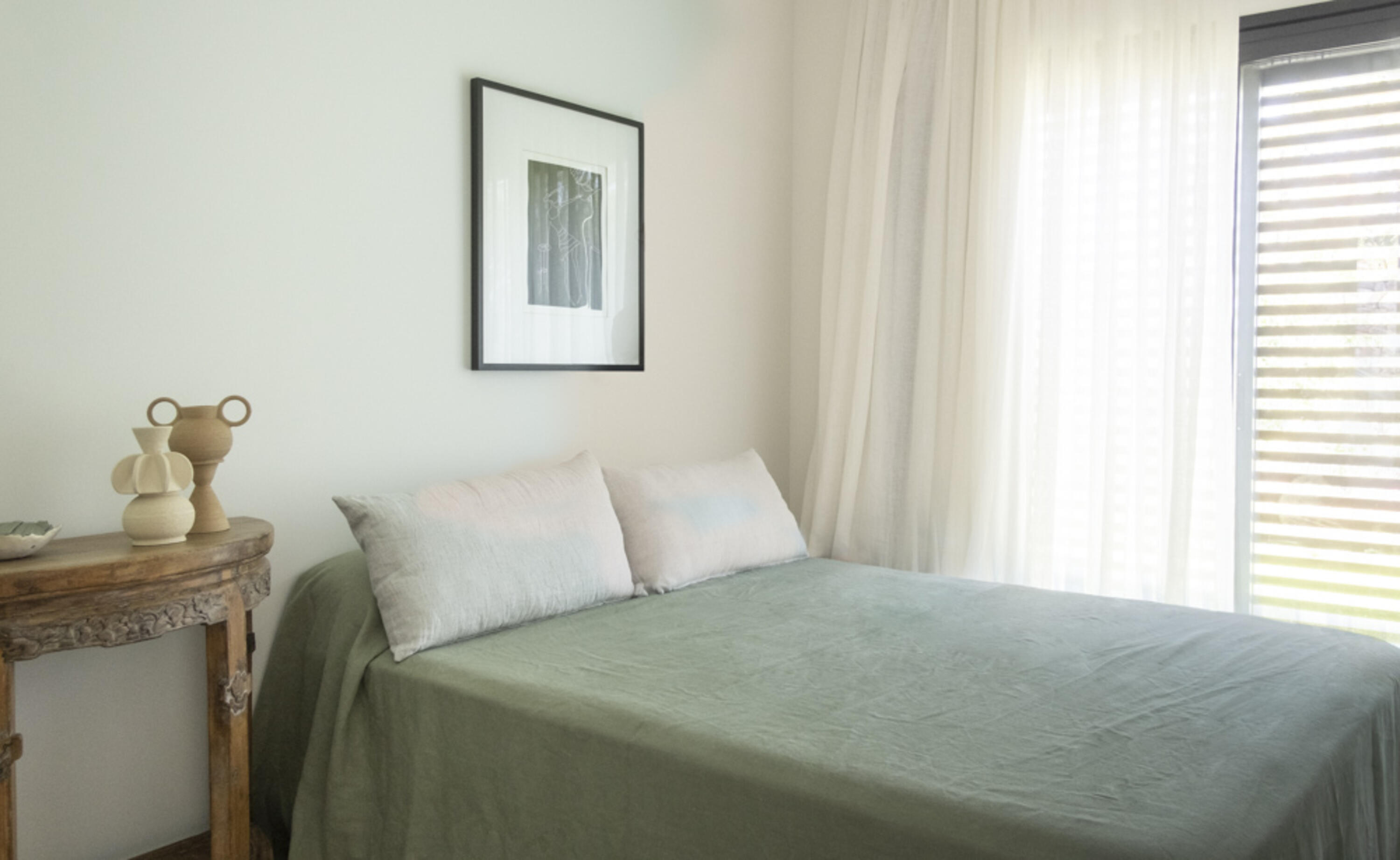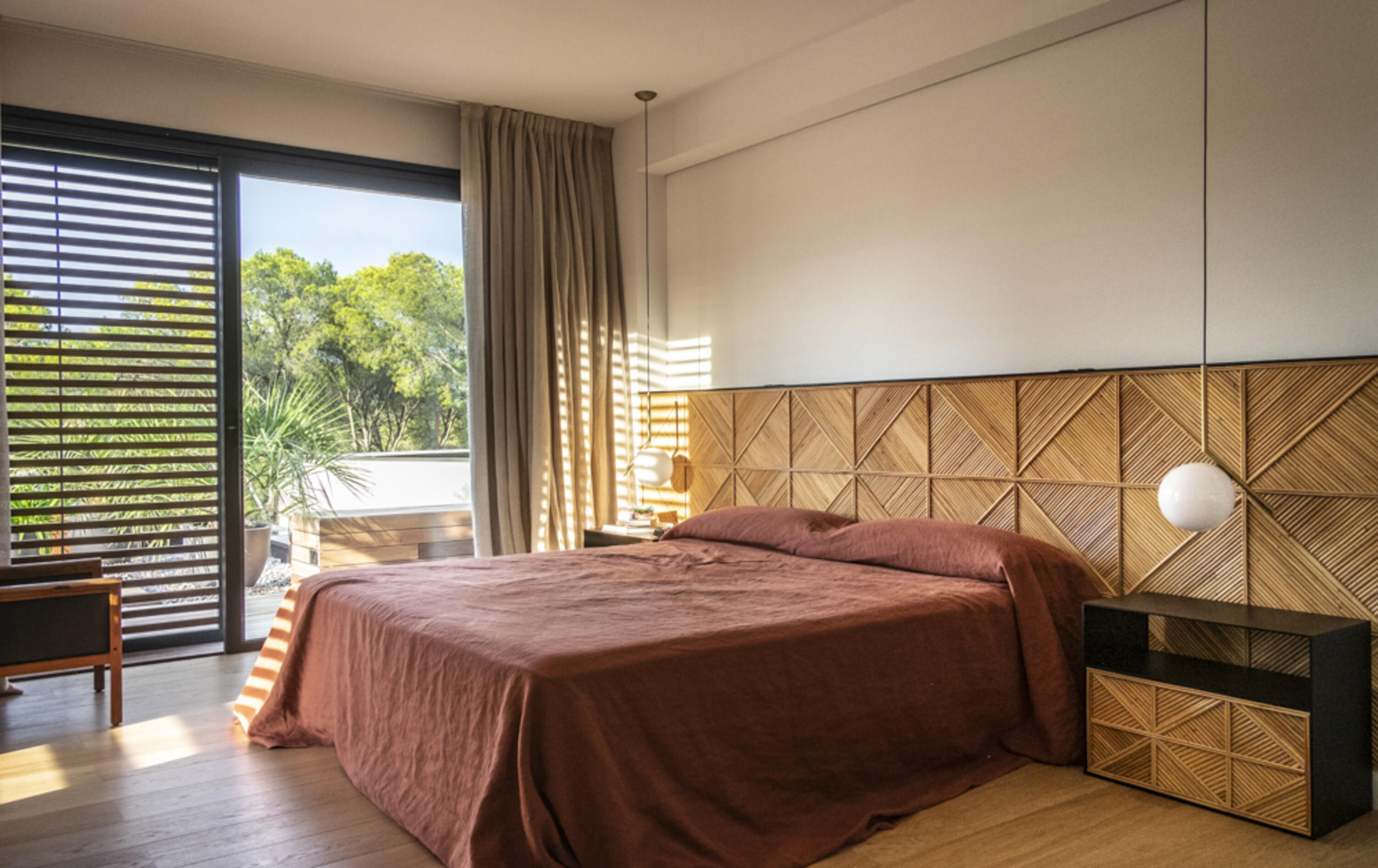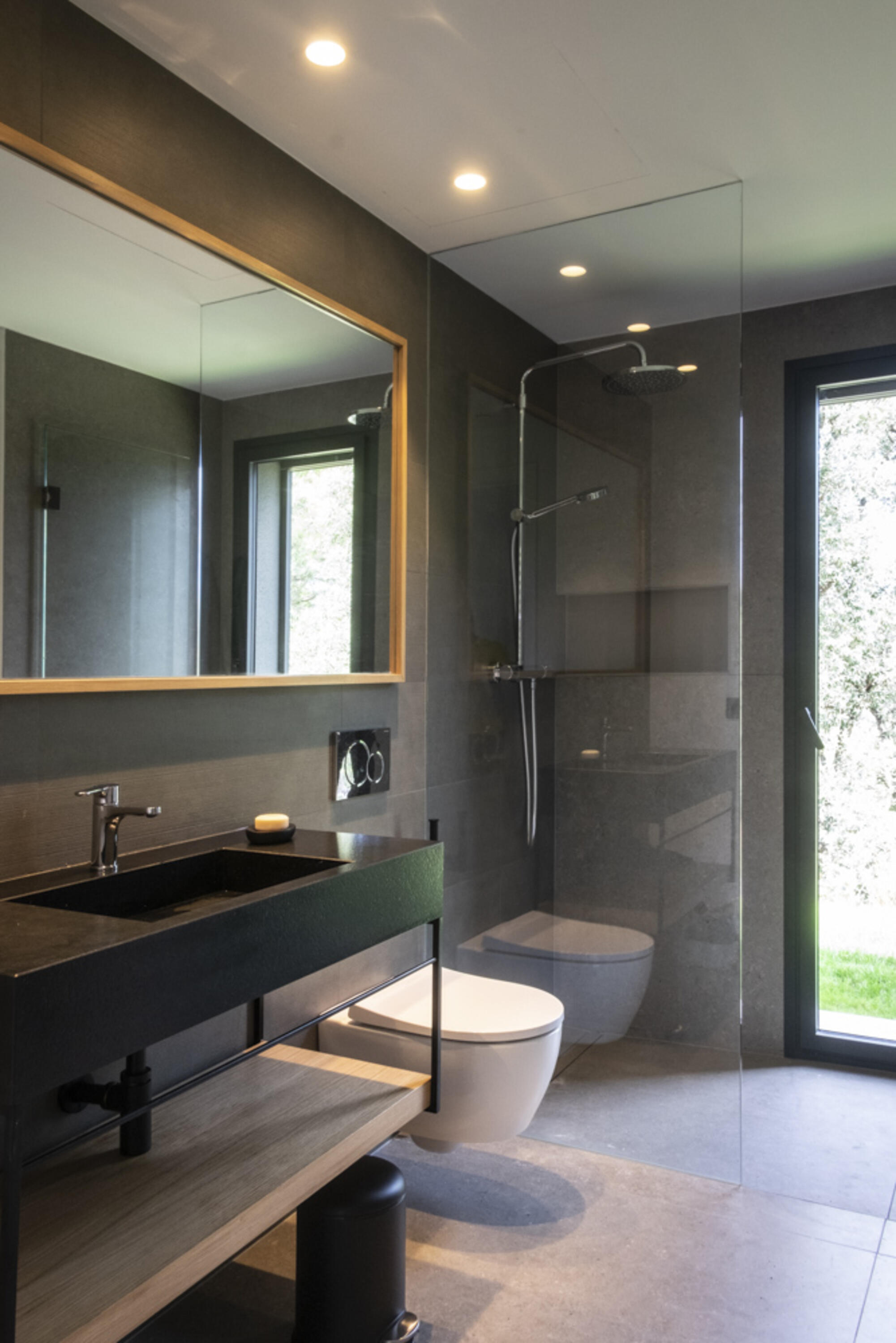 Arriving on the first floor we find the master suite with dressing room, a large bathroom with shower that connects to the outside world thanks to the large window, a separate toilet and a double bedroom with a king size bed that leads to a spectacular terrace where we can enjoy of the nature and tranquility of the Costa Brava, we find an outdoor shower on this terrace.