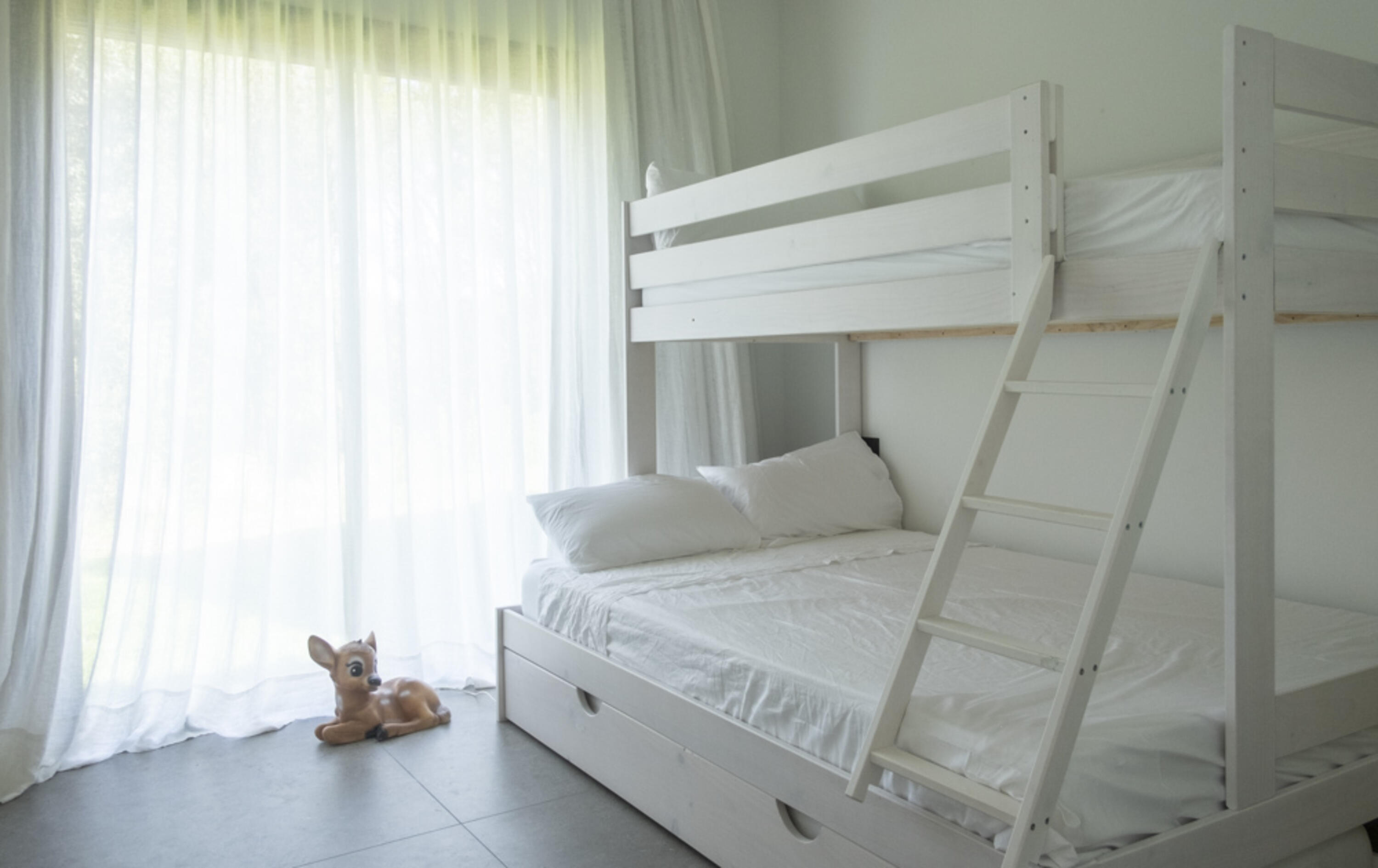 On the same floor we find the sleeping area clearly separated, where we have a bedroom with bunk beds and trundle bed that can accommodate up to 4 people, a double bedroom with a bed of 160 cm, a bathroom with shower and a double bedroom en suite with a bed of 180 and bathroom with shower. Each bedroom has fitted wardrobes and access to the garden.