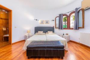 This lovely two-storey villa tastefully furnished, with parqué floors and equipped with all the comforts of modern living. The ground floor boast a bright living/dining area tastefully furnished that connects to the fully equipped kitchen. The double doors of the living/dining area open onto the charming terrace and pool area. The ground floor offers a bright master bedroom with direct access to the pool area. This bedroom has a king size double bed, a dressing room, a spacious en suite bathroom with separate hydro-shower. A twin bedroom and a separate family bathroom complete the ground floor. An interior stair leads to the upper floor to a nice and bright double bedroom -this bedroom has small terrace with views of the pool-. A second twin bedroom that has access to a large terrace with nice views of the surroundings and a shared spacious full bathroom complete the first floor. An exterior stairsleads us to the original fifth bedroom that is located in the tower, therefore the bedroom has a circular shape, with a double bed and small en-suite shower room.