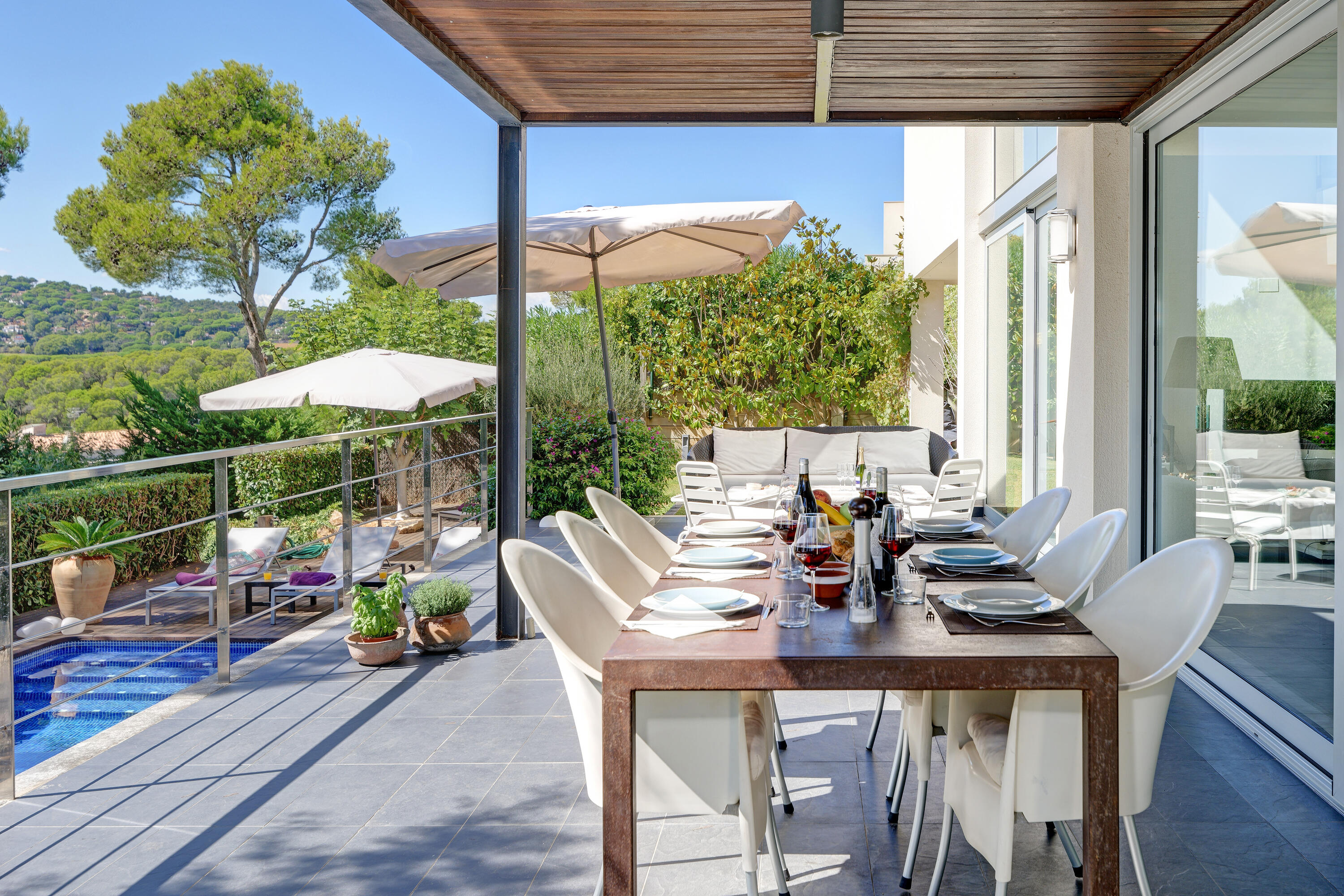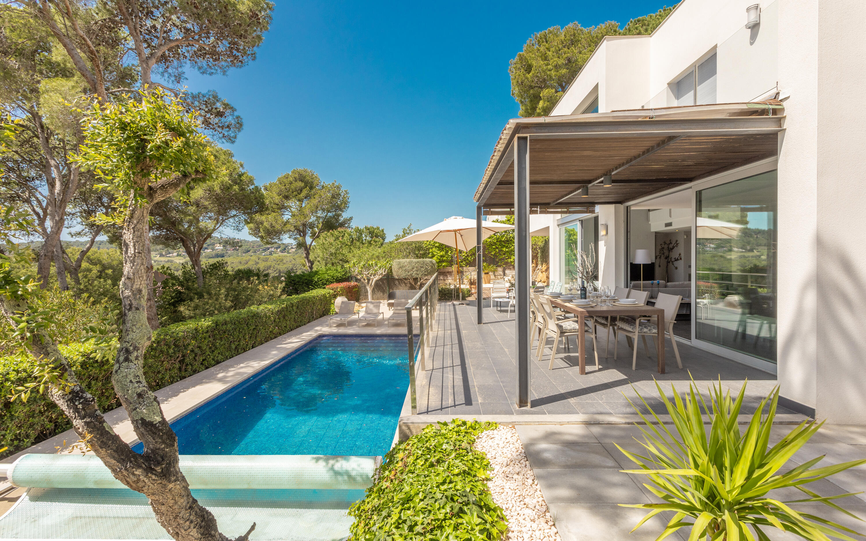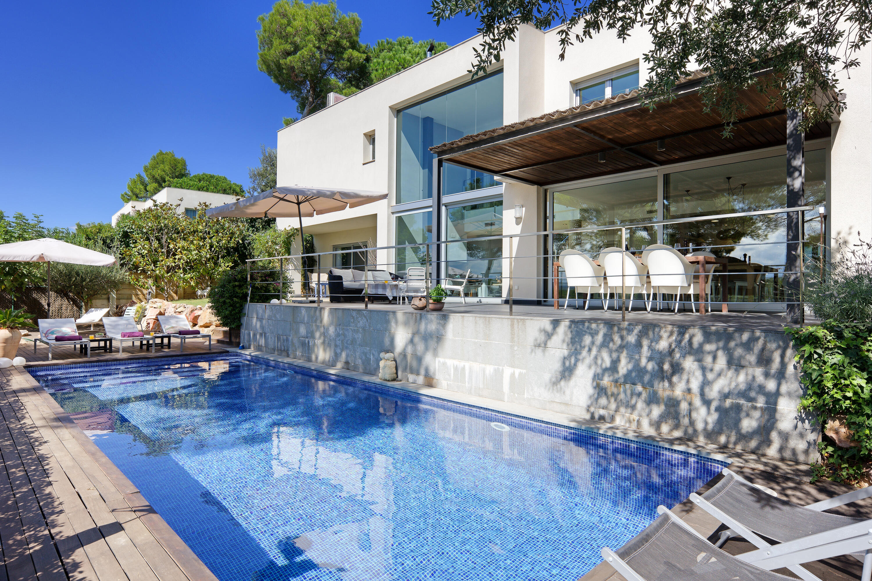 Private swimming pool (10 x 6 metres), garden with lawn, terraces, parking space for at least 4 cars, garden furniture, sun loungers.