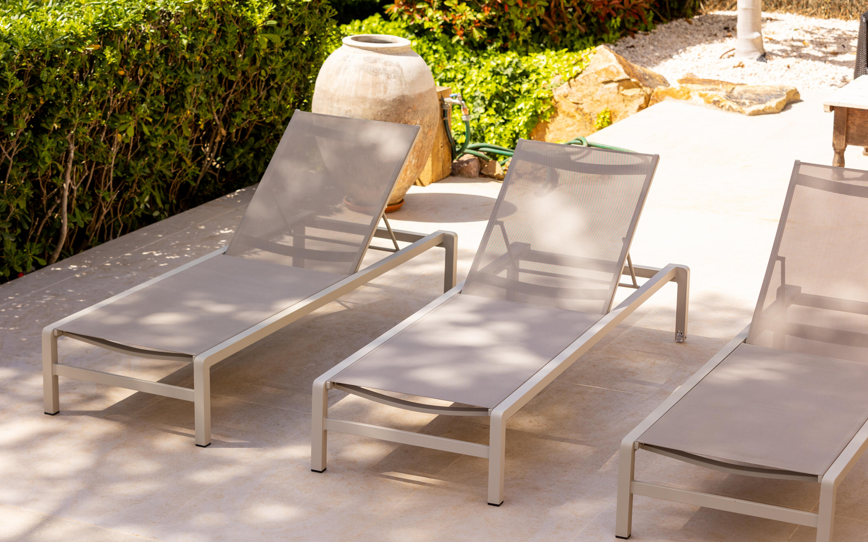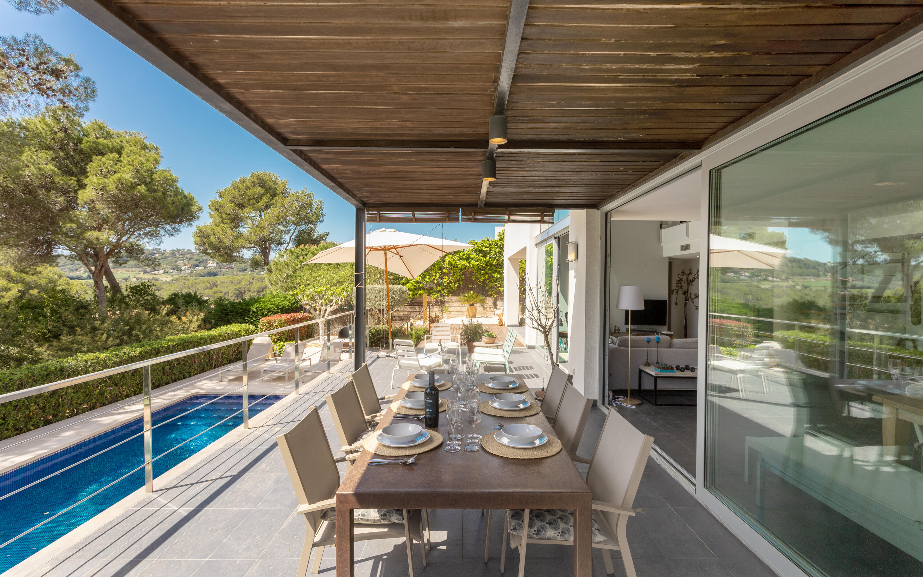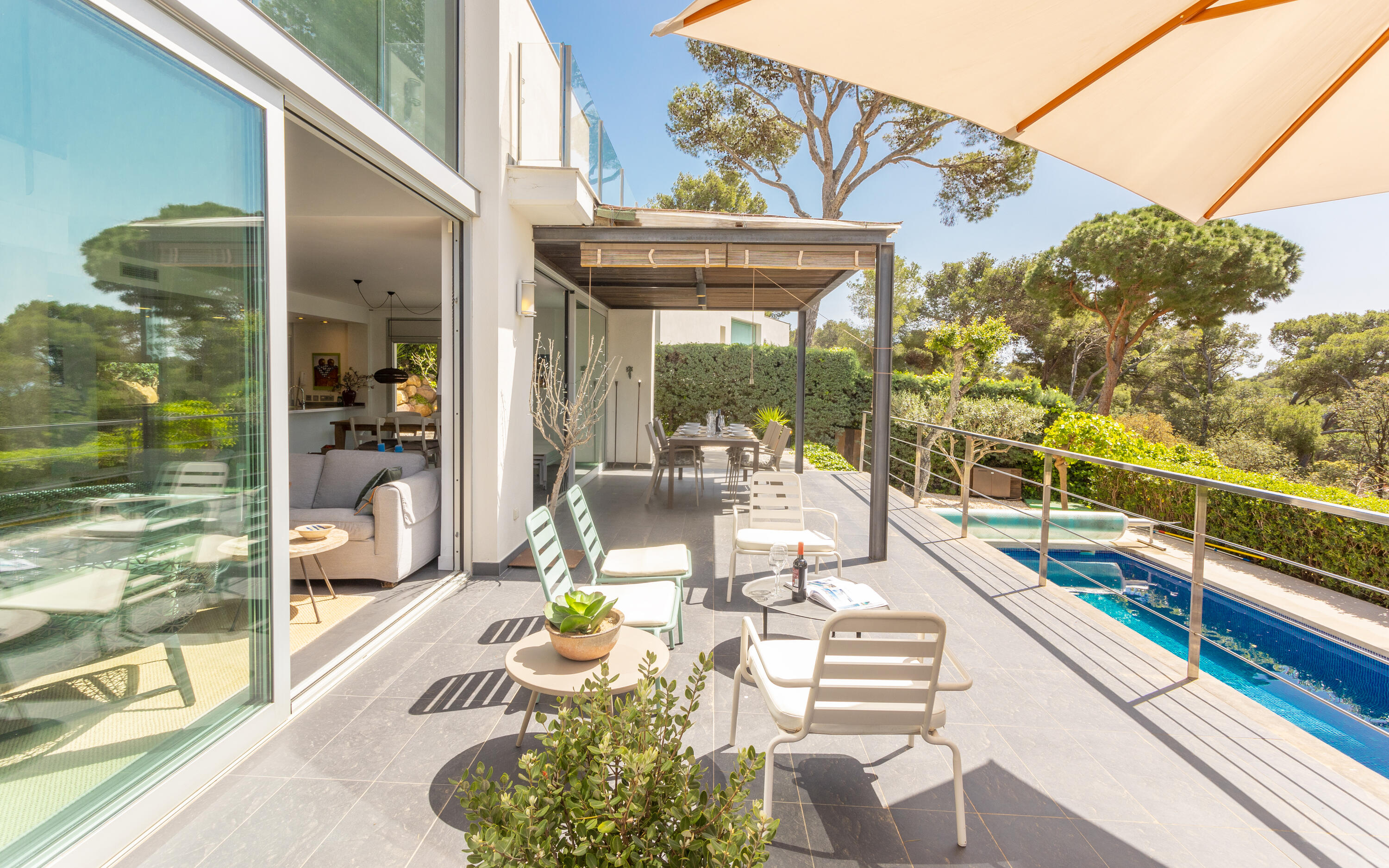 Private swimming pool (10 x 6 metres), garden with lawn, terraces, parking space for at least 4 cars, garden furniture, sun loungers.