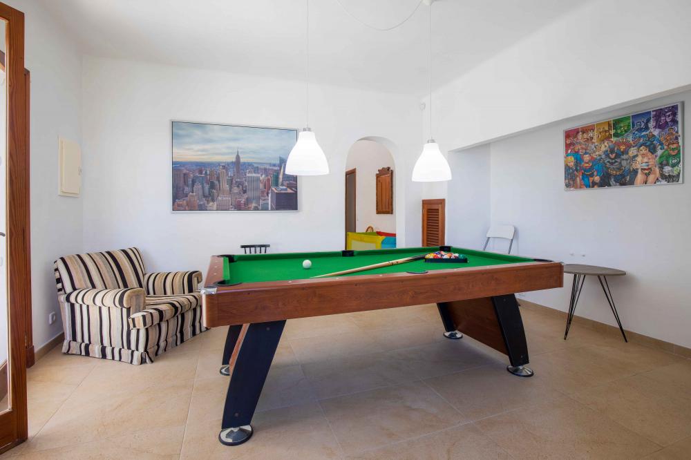 The covered terrace by the barbecue is furnished with benches and chairs and there is also a stone seating area with comfortable cushions and a billiard table. POOL: W 9.0m x 4.5m (D 1m x 2m) Roman steps & Heated.