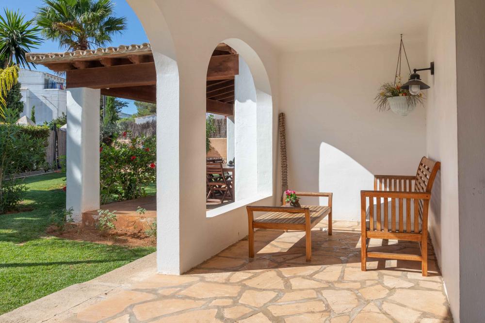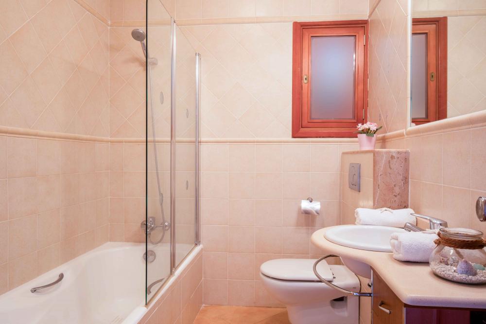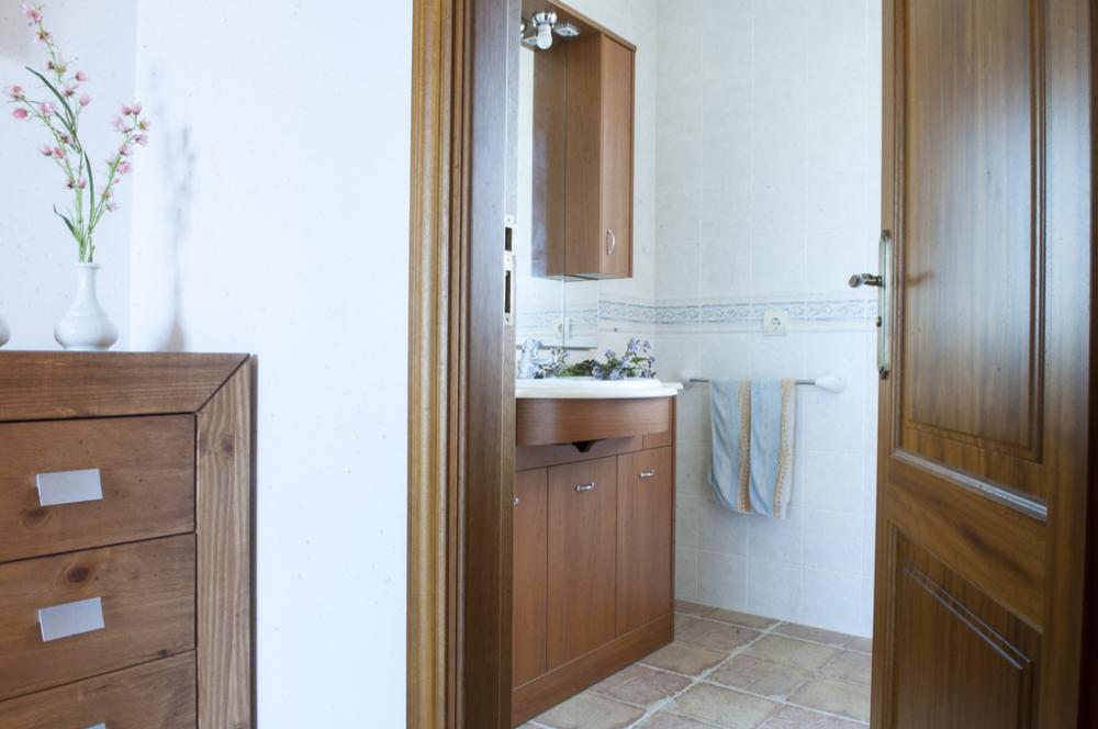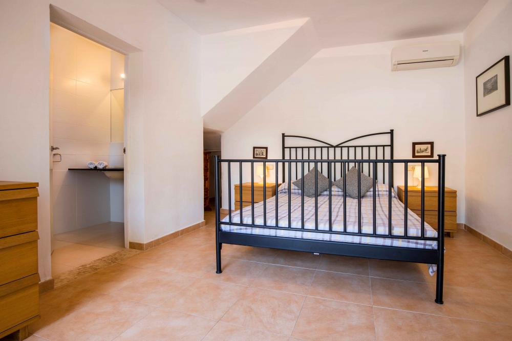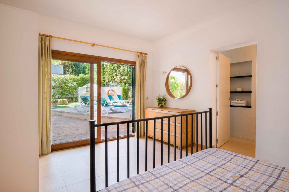 From the bright double-height entrance hall we reach the open living room/kitchen. The kitchen is well equipped and includes a dining table. The comfortable living room has access to the patio and pool. The ground floor also offers a separate bedroom and separate shower room. From the hall, a staircase with beautifully designed iron railings leads to the top floor where there are two bedrooms. A spacious bedroom with a double bed and a bedroom with two single beds, sharing a separate bathroom with a bath.