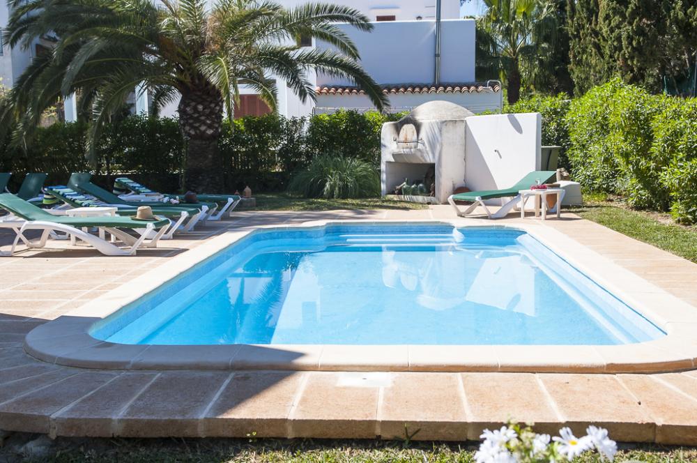 Private pool, covered patio with table, chairs and BBQ, plus fridge and sink. Terrace, garden, deck chairs, lounge set, table tennis table.